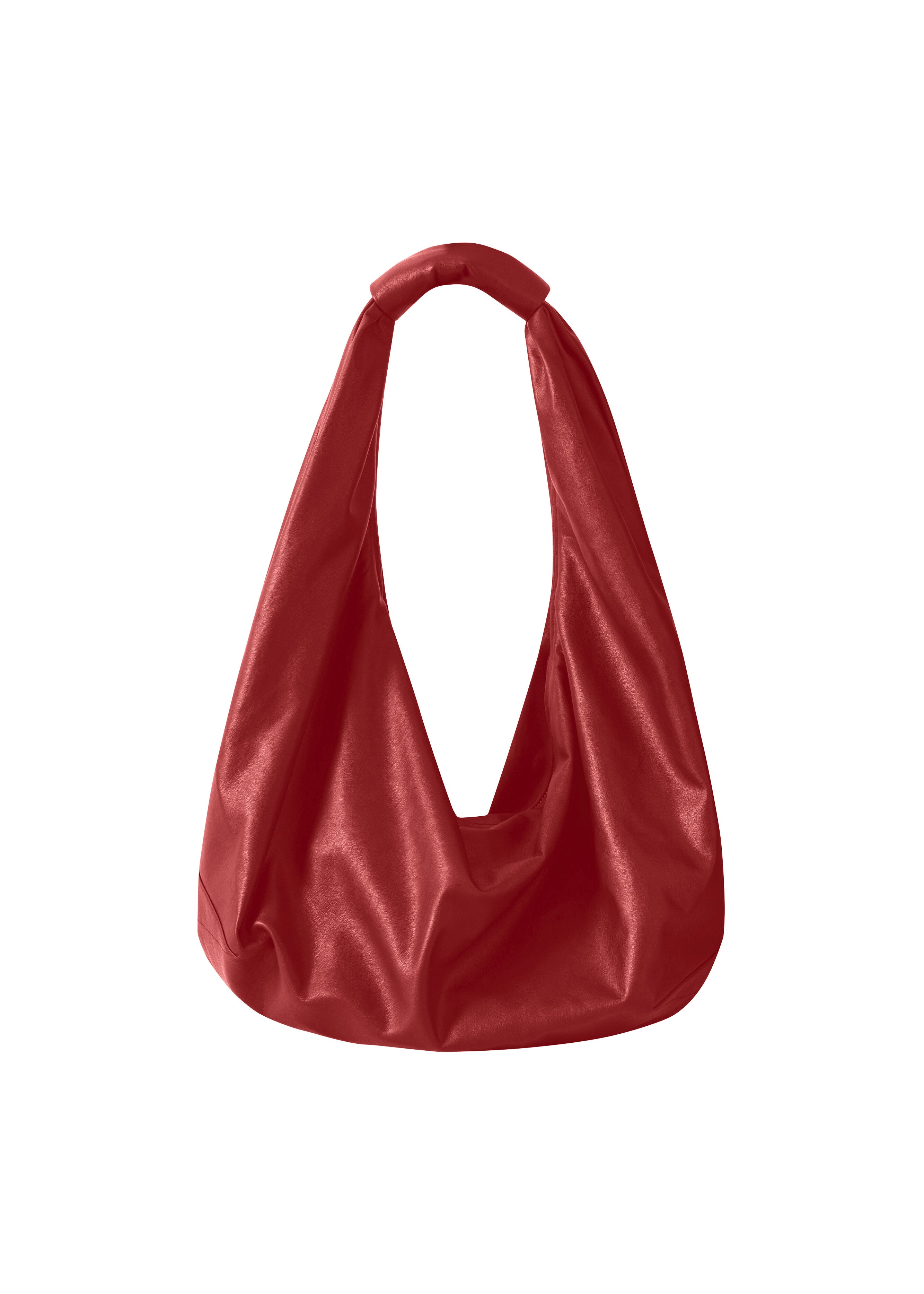 This tote bag presents a slouchy, unstructured design. It is equipped with a single, padded top handle. The bag is made from a smooth material, indicative of vegan leather, providing a supple texture.
