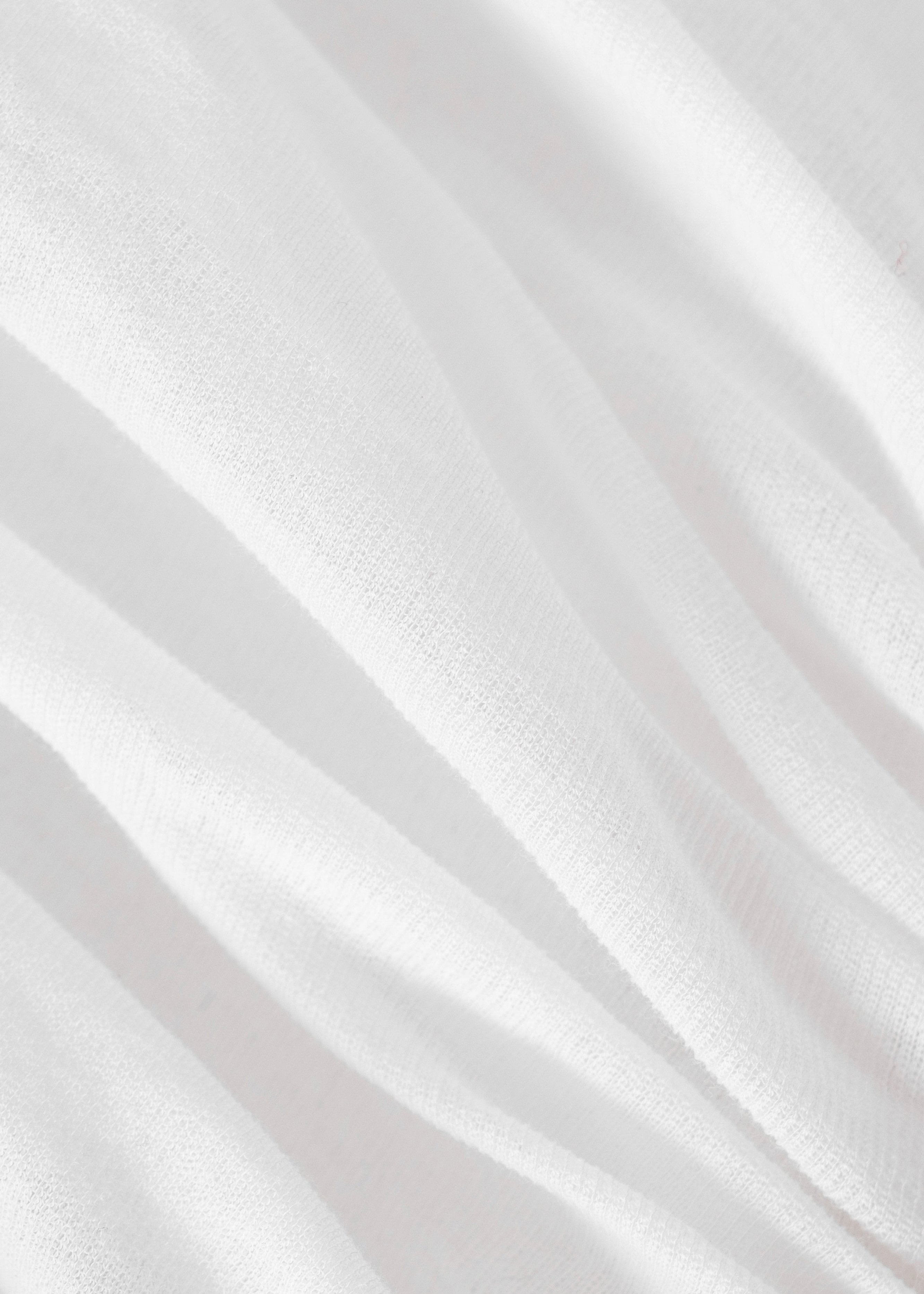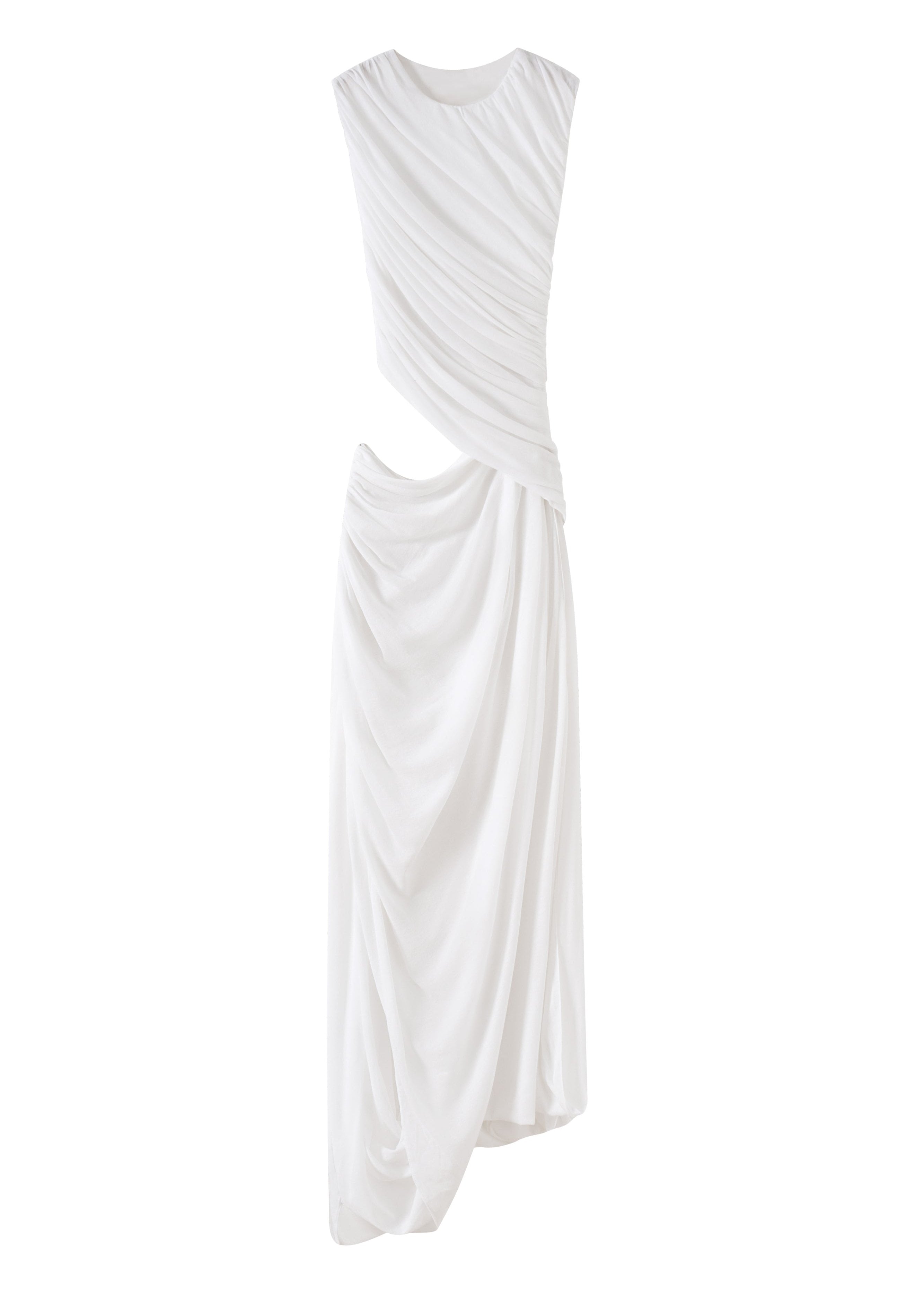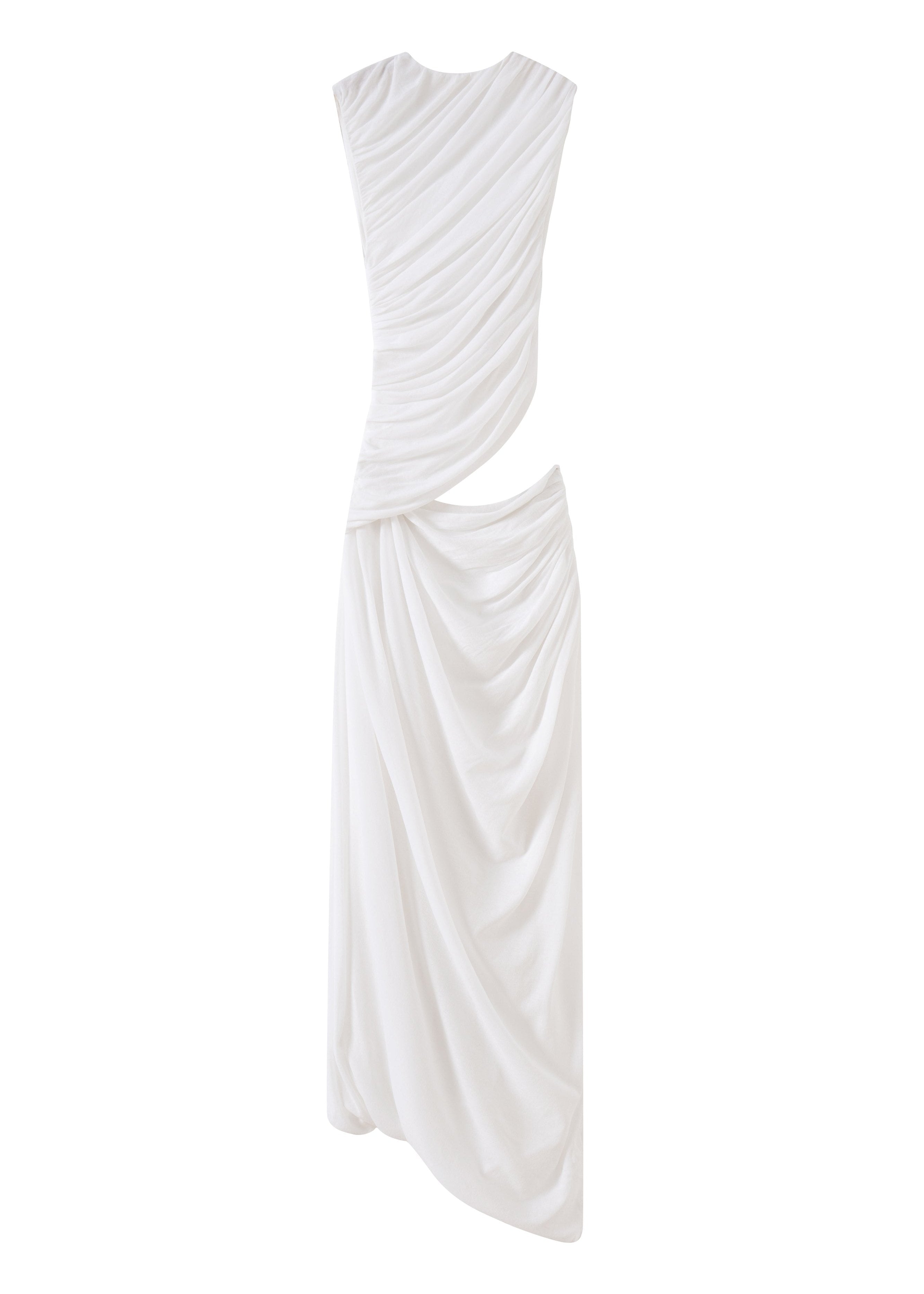 Maxi shell tank dress with asymmetrical draping with cut out at the waist down to the hips. Made with fine cotton jersey. Available in Black, White, and Taupe