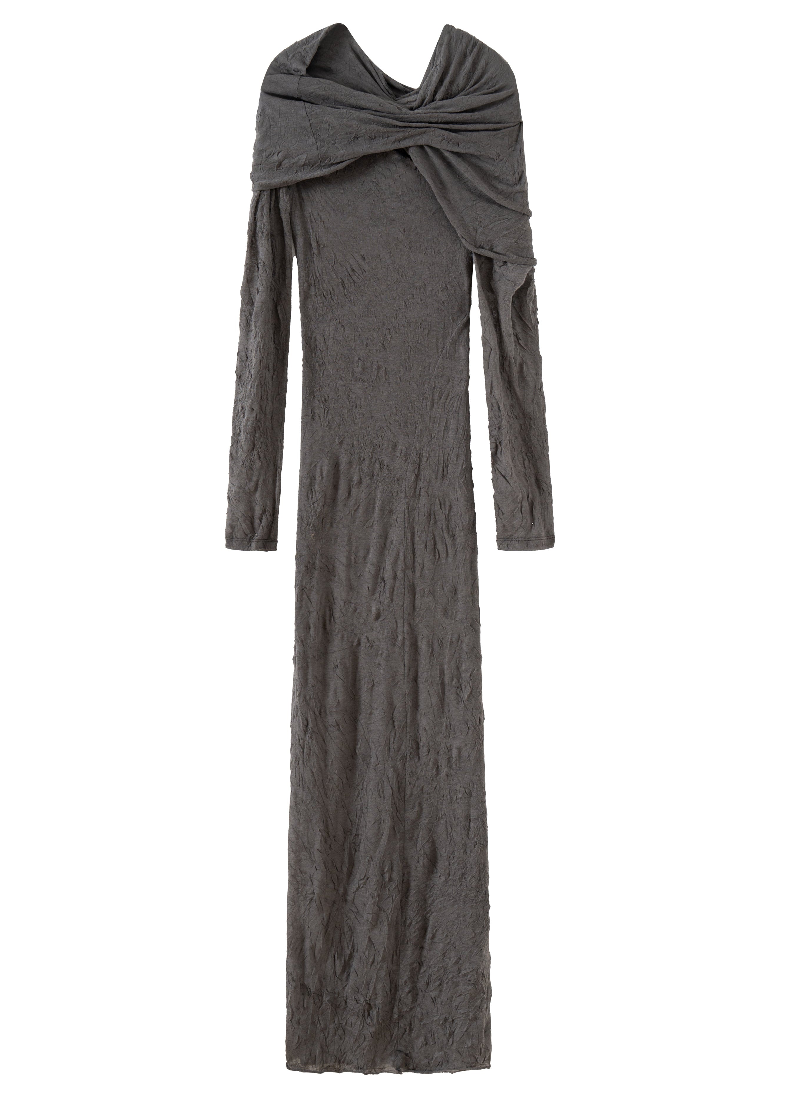Semi-sheer maxi dress with long sleeves, fixed draping and twist at side shoulder. Made with wrinkled jersey.