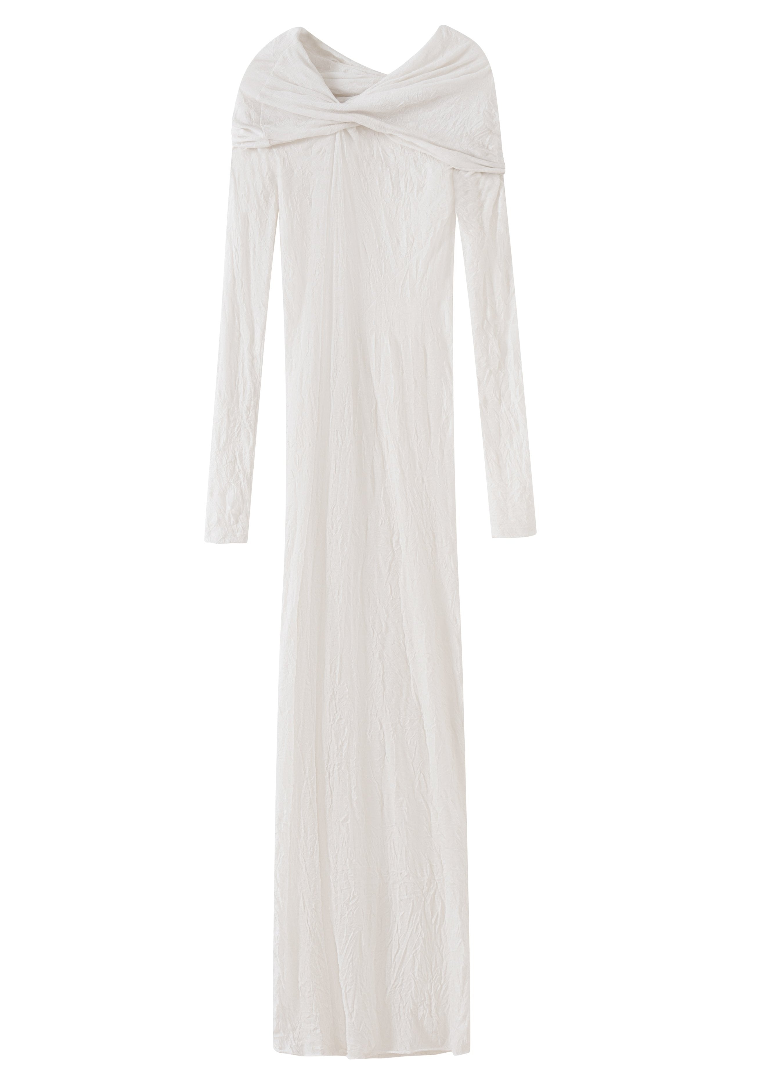Semi-sheer maxi dress with long sleeves, fixed draping and twist at side shoulder. Made with wrinkled jersey.