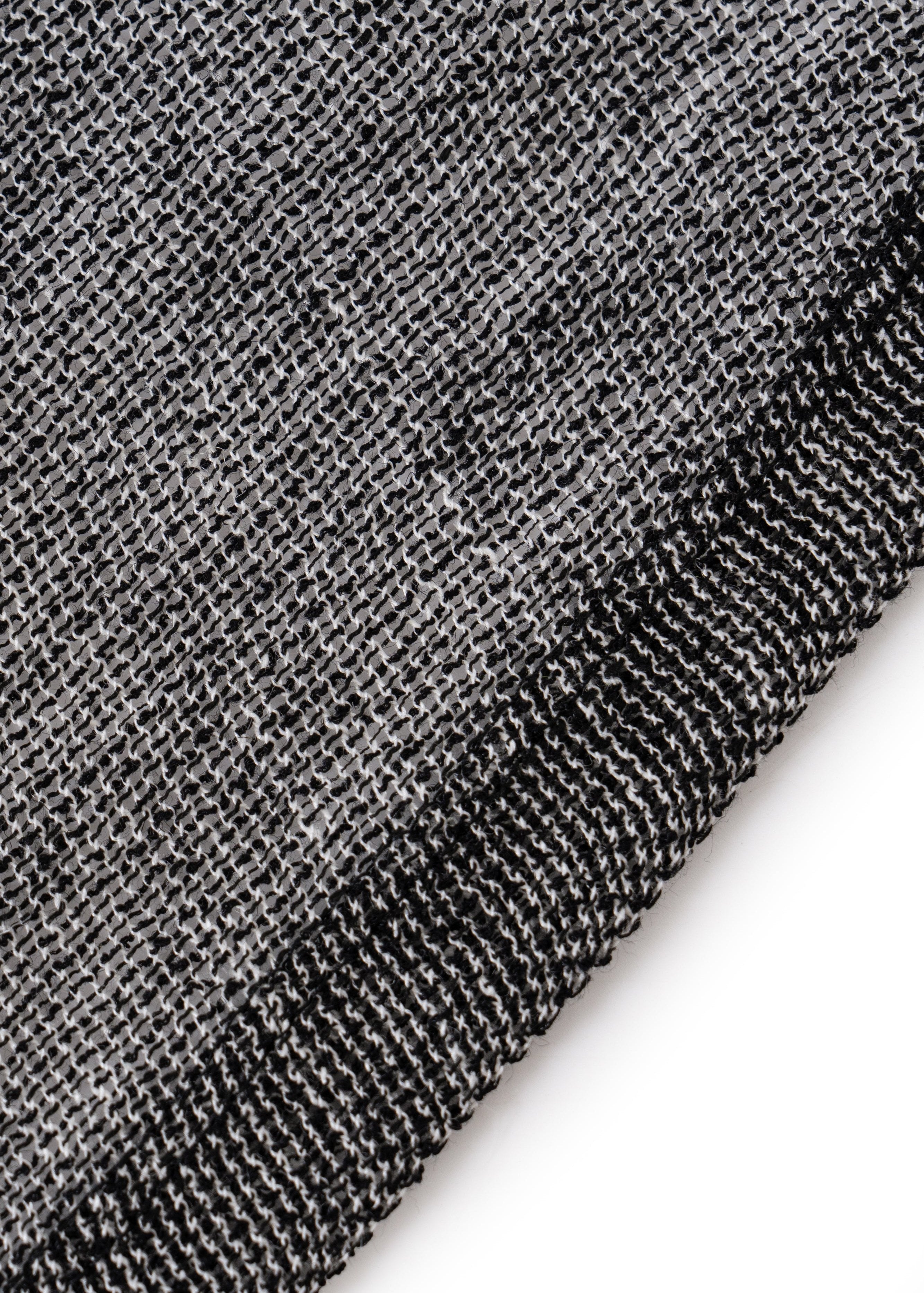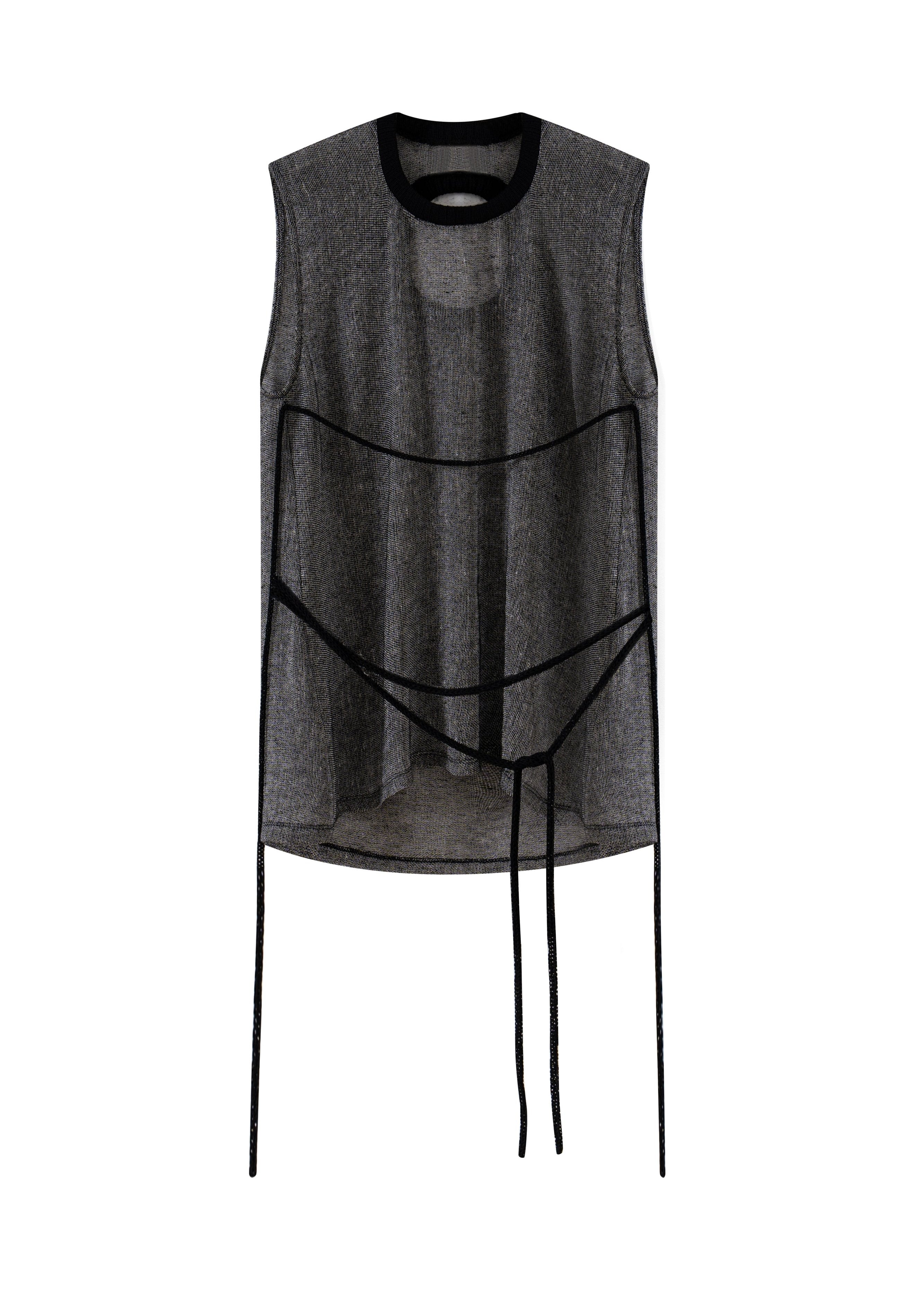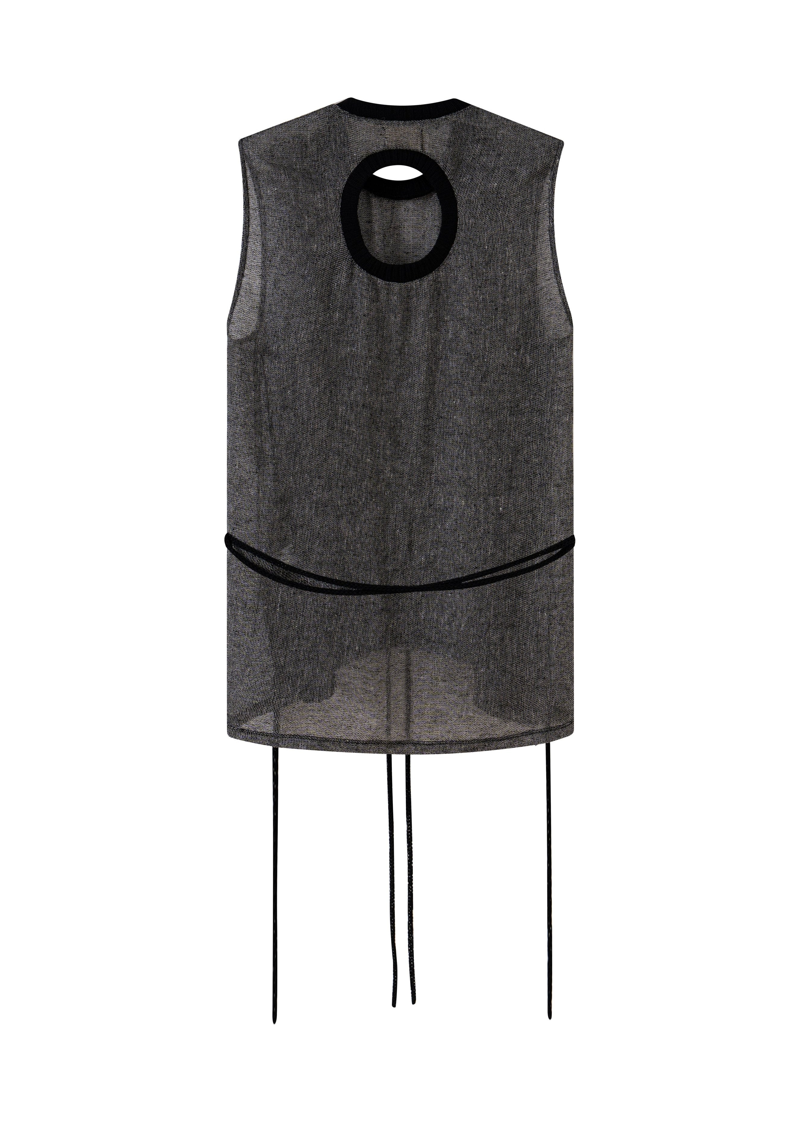Oversized semi-see-through shell top made with linen-blend. 2 hand- knit crewnecks one at the back and front with detachable braided strings to add to the multitude ways that this top can be styled in.