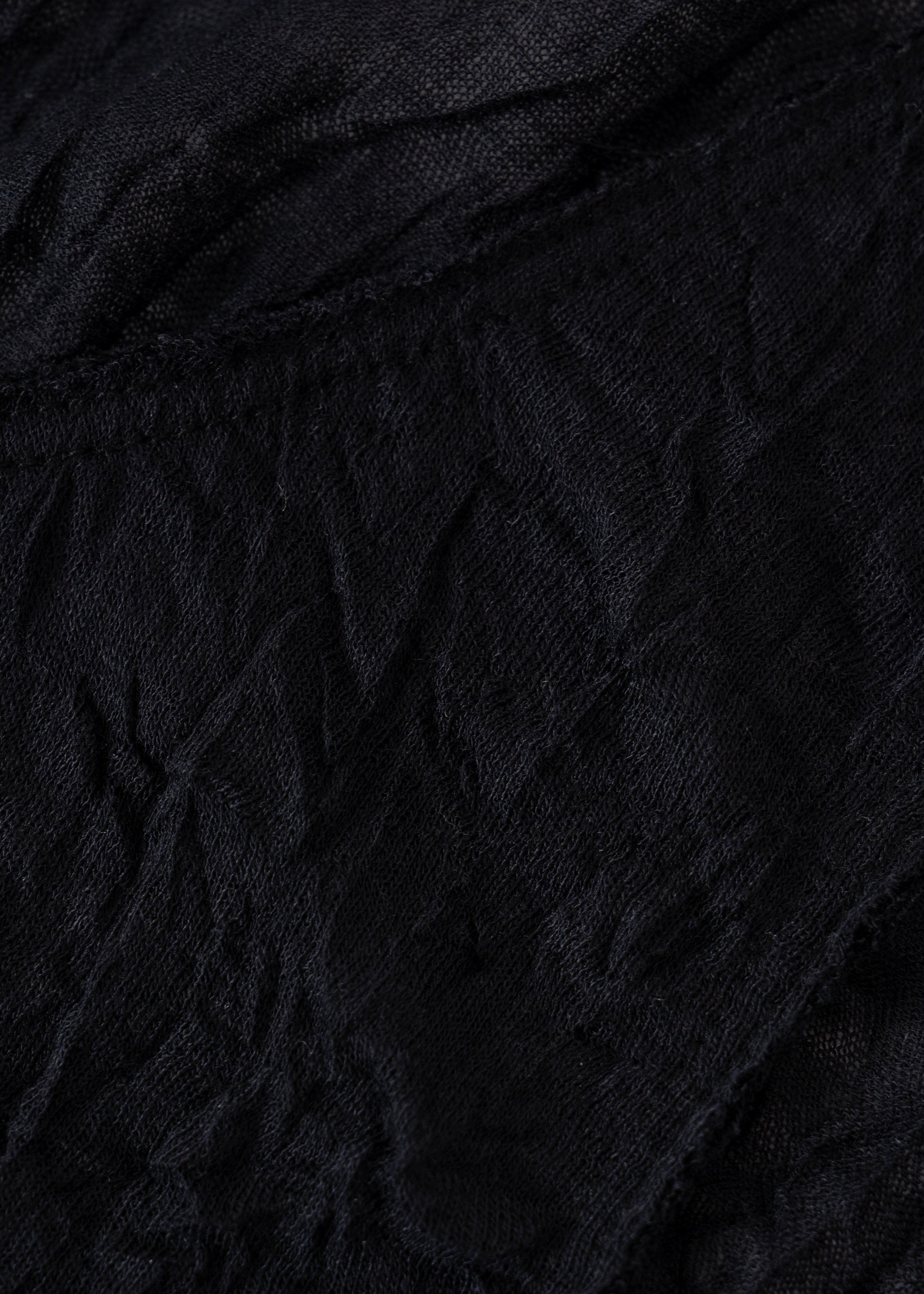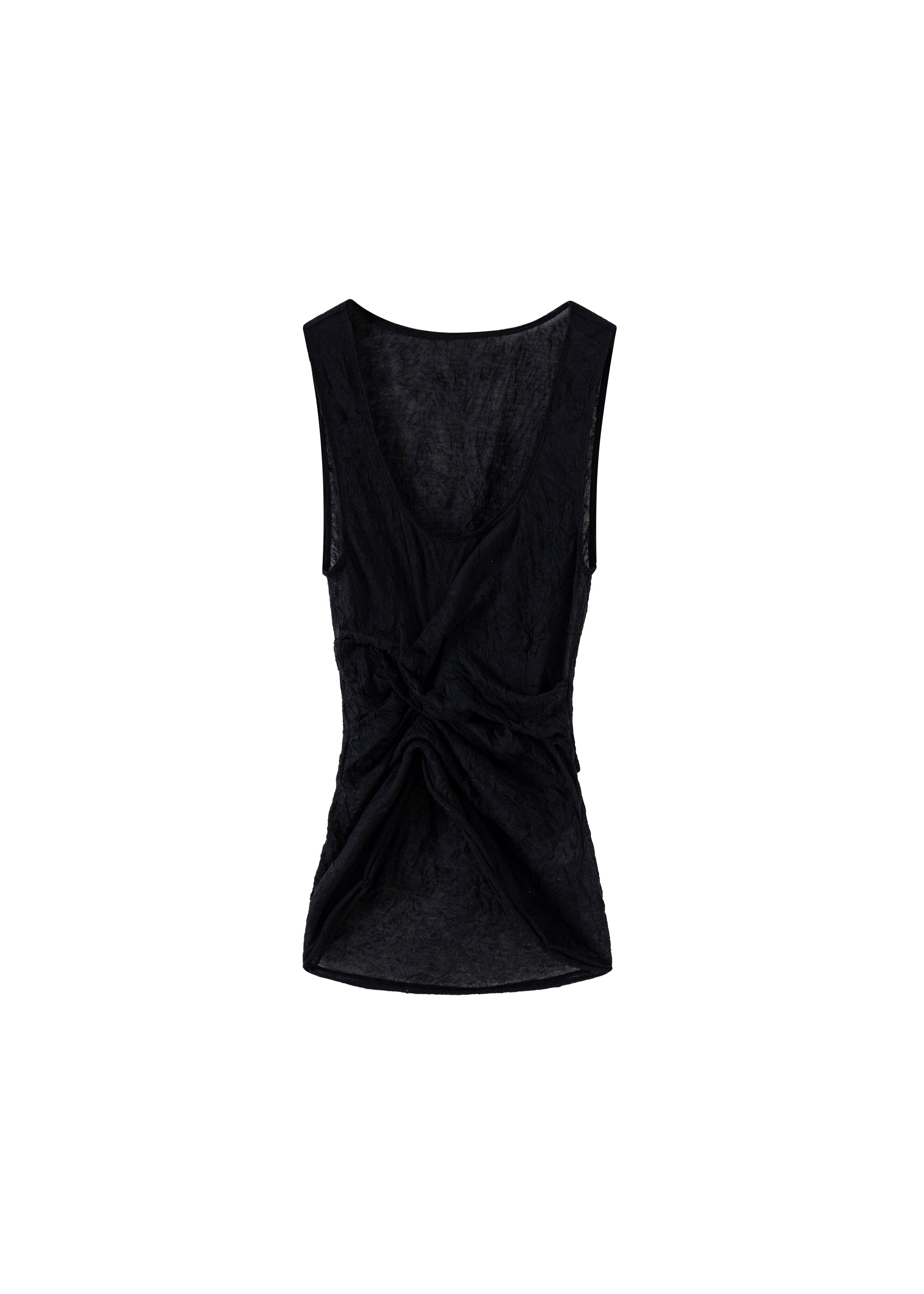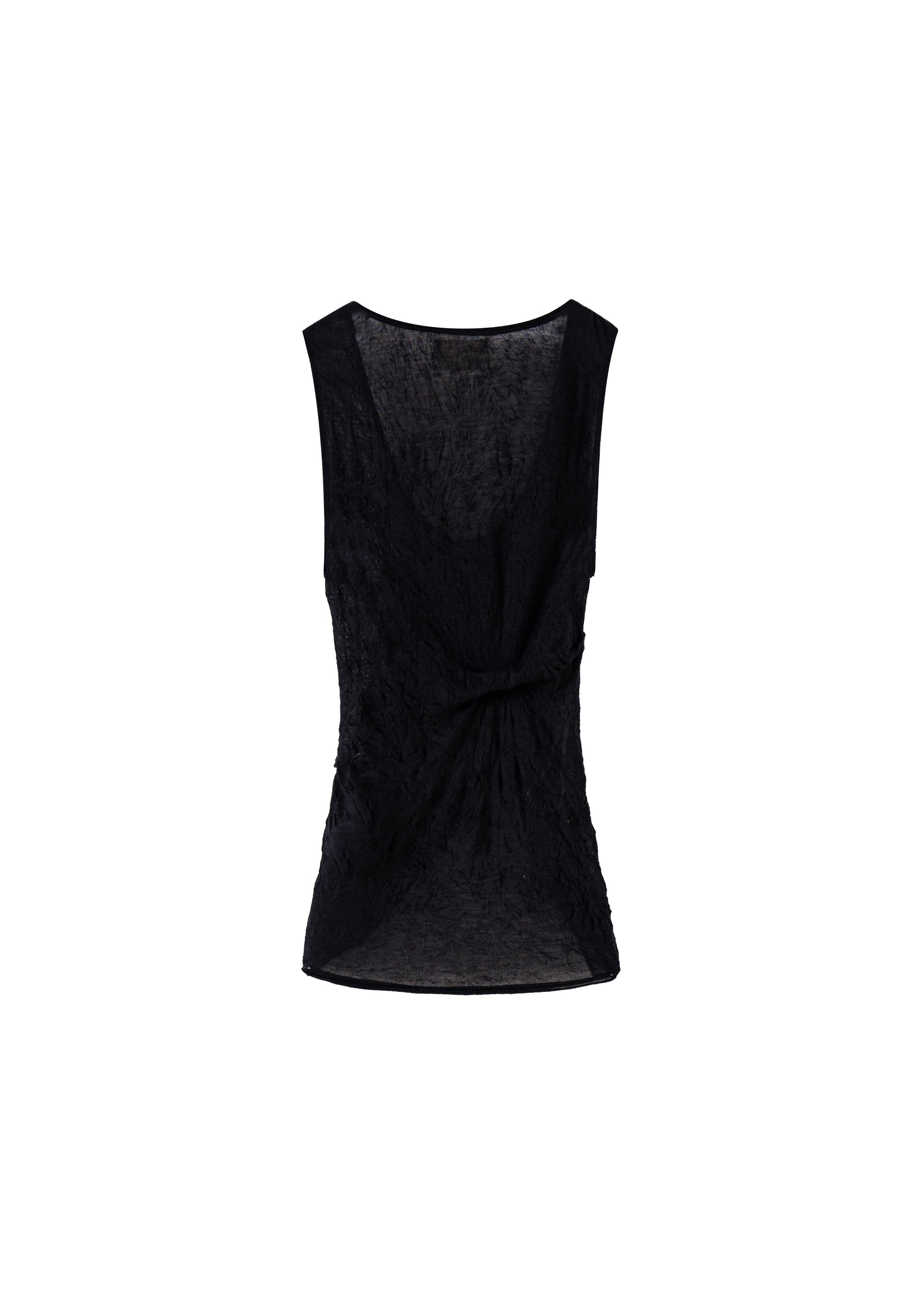 Cropped-length tank semi-sheer top with low neckline made with wrinkled jersey, draped and side twisted at the front and back. Detailed raw edge finishing