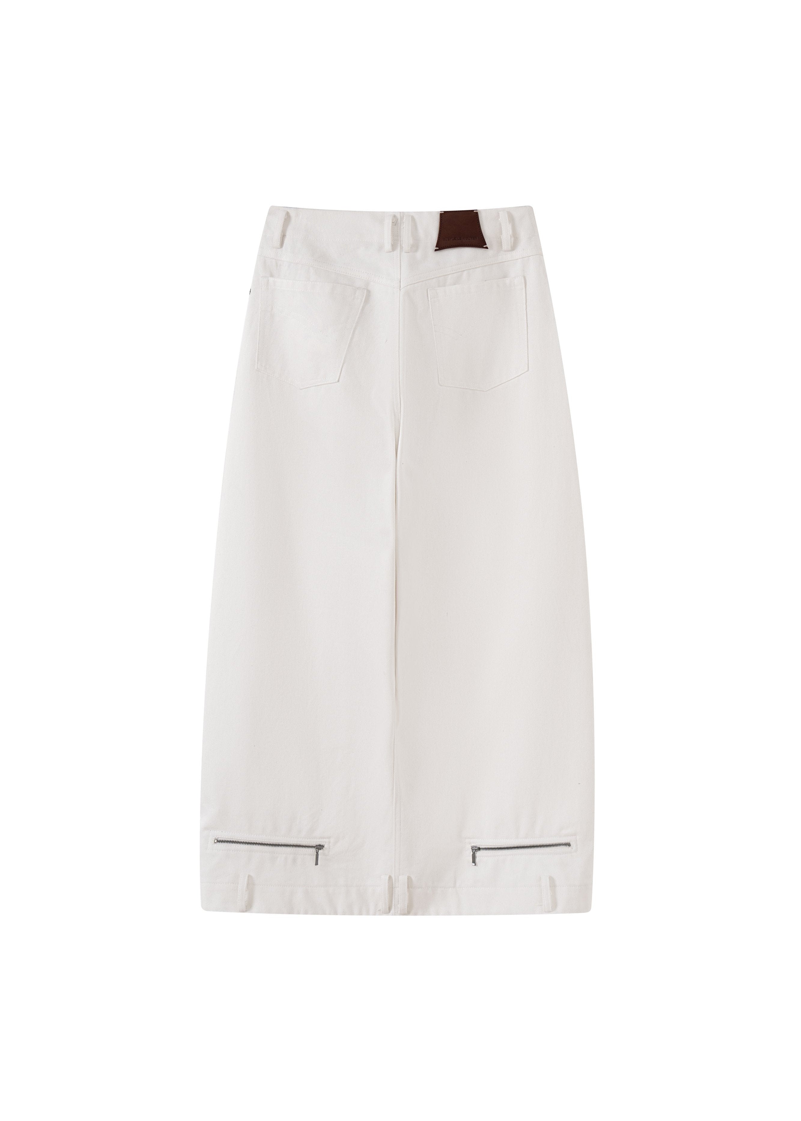A maxi-length Japanese denim skirt with a regular rise, belt loops, a zip-fly, and five-pocket styling. It features a debossed leather tag on the lower left side. Double sided that can be worn upside-down. Available in Navy, and White