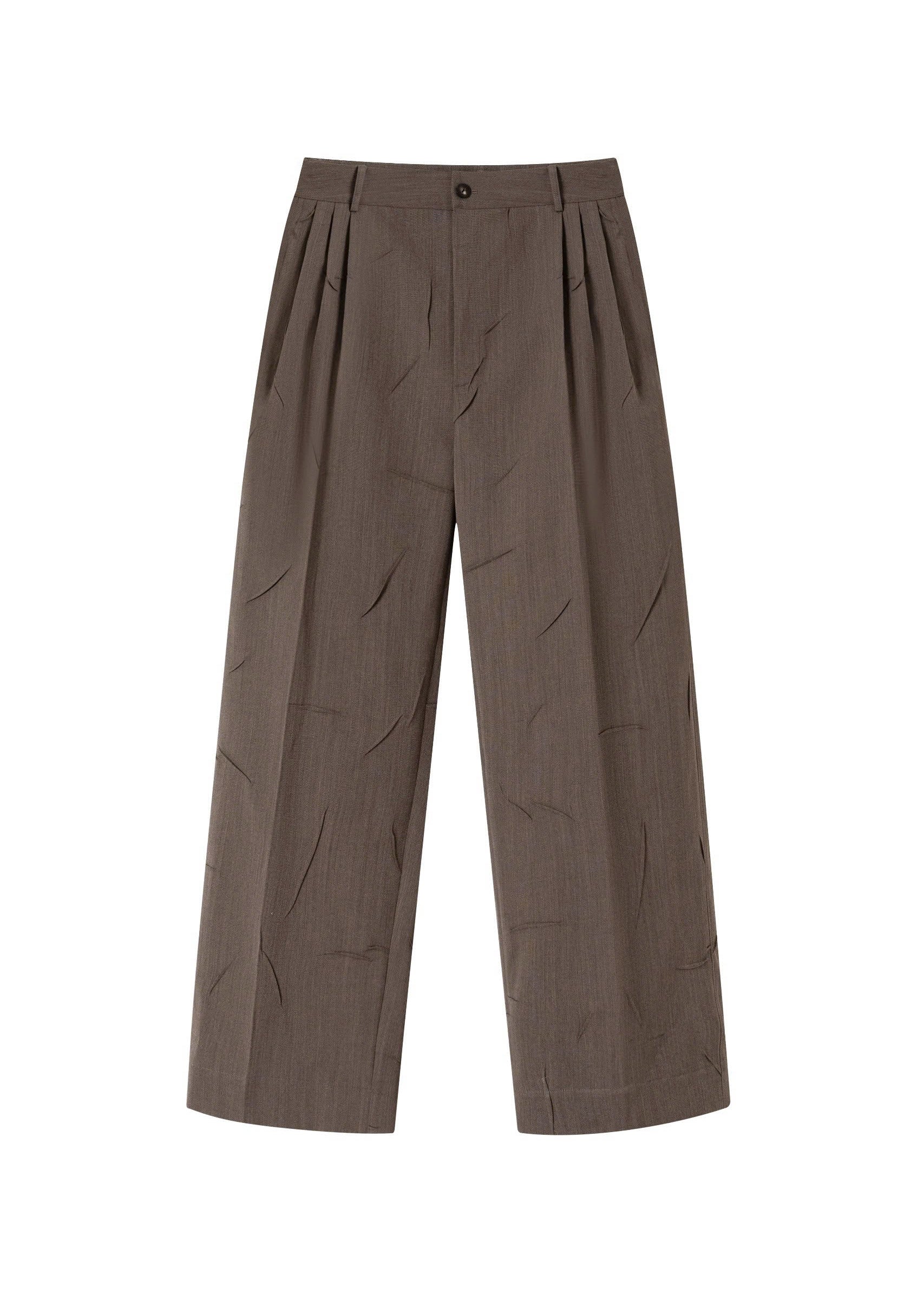A loose fit, dropped crotch and wide straight leg blend pleated trousers in wool, with hand-manipulated wrinkled twill details.