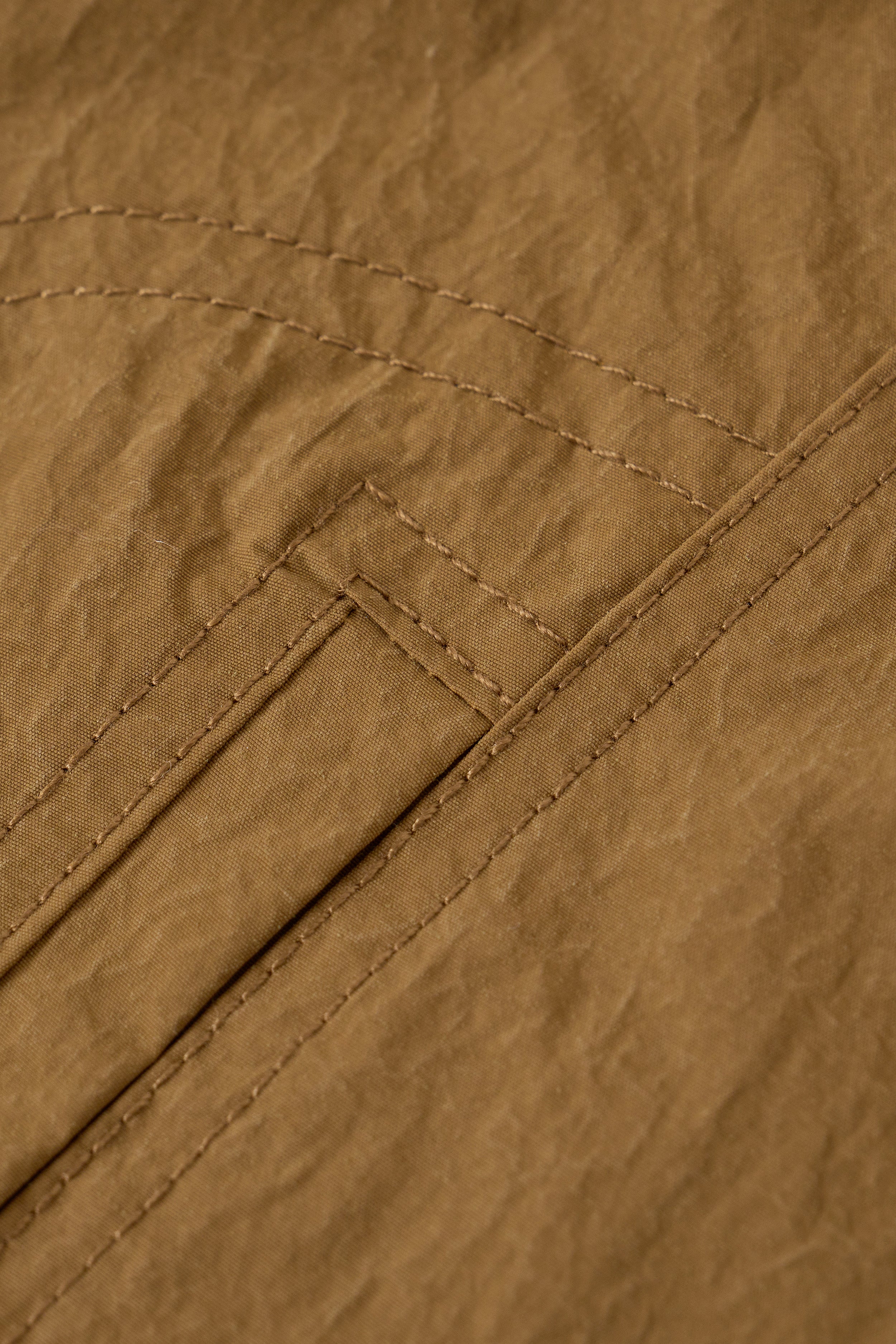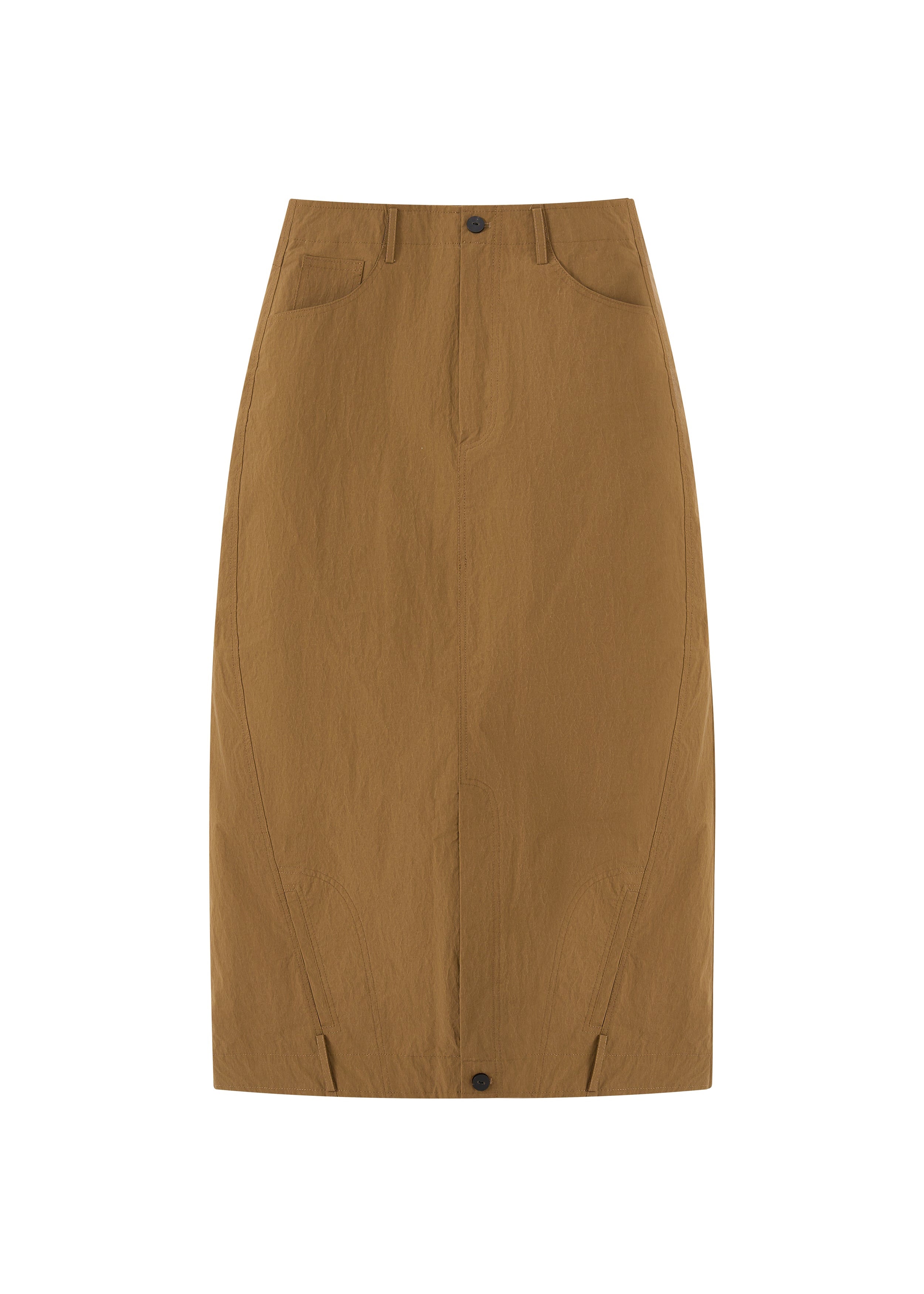 A brown maxi skirt with a regular rise, belt loops, and a zip-fly. It features a five-pocket styling and is made of recycled nylon. Can be worn both ways, reversely in both up and down.