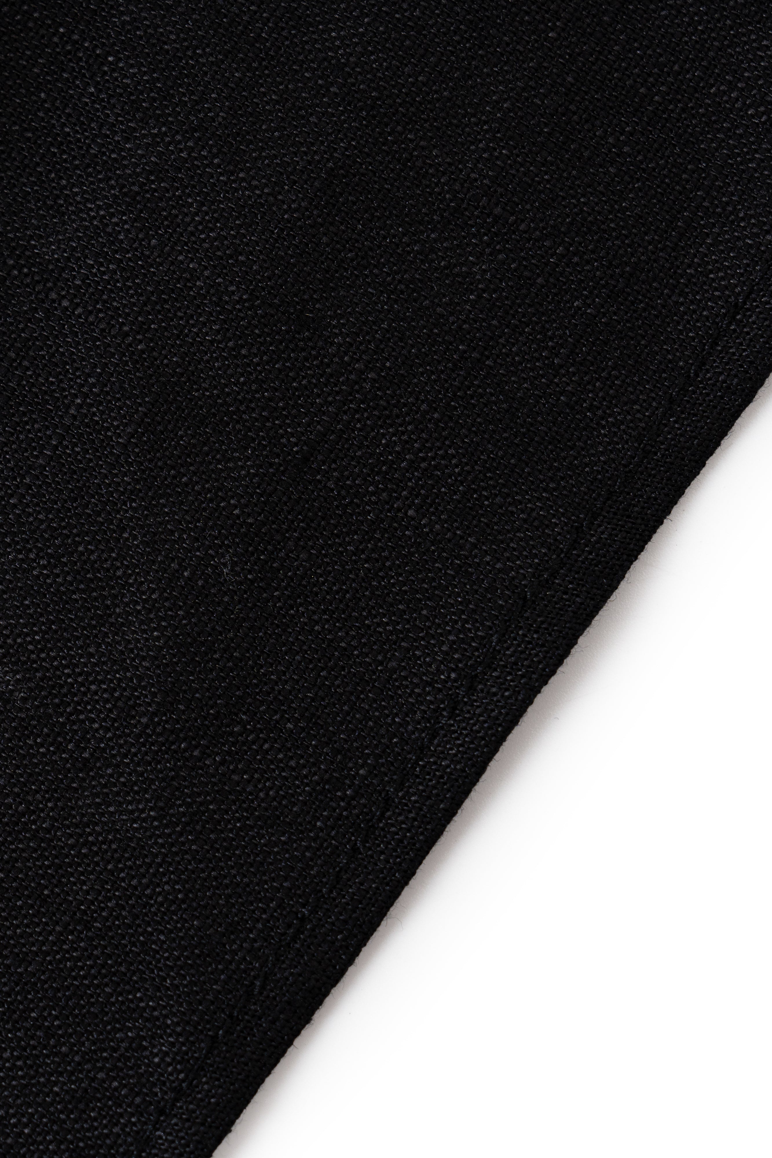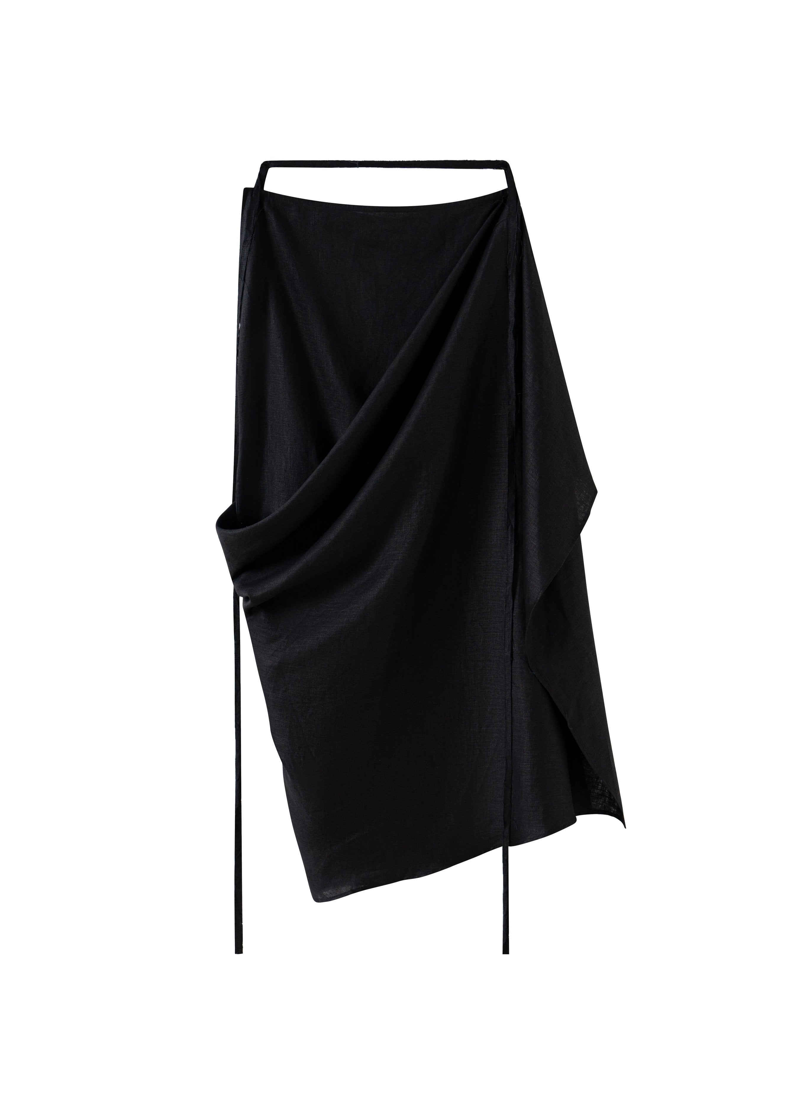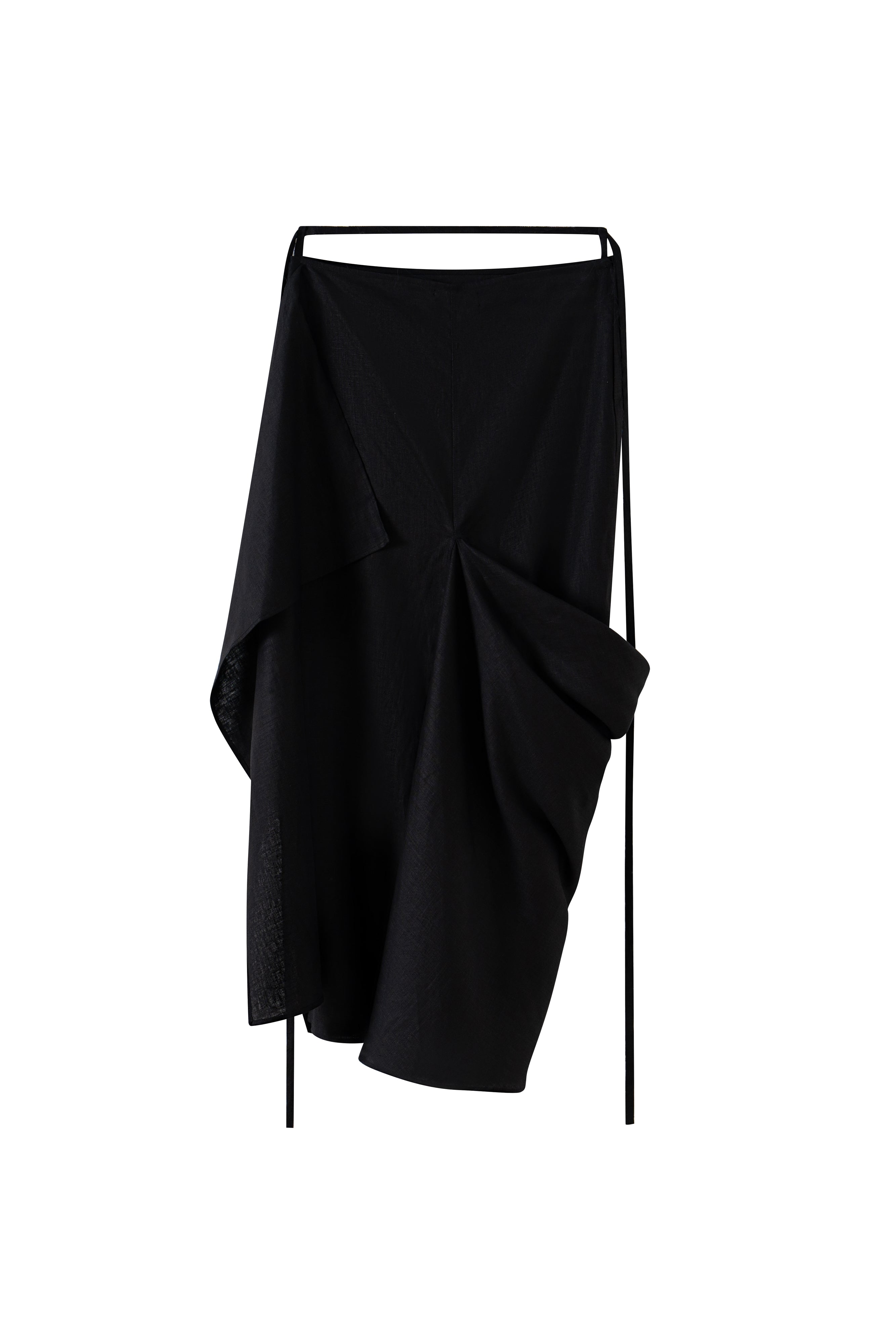 A black linen asymmetrically draped and layered maxi skirt, tied at waist, with a side zipper and vent at the side seam. The drape is crossed and goes to the back where it is pinched on the midline of the dress.