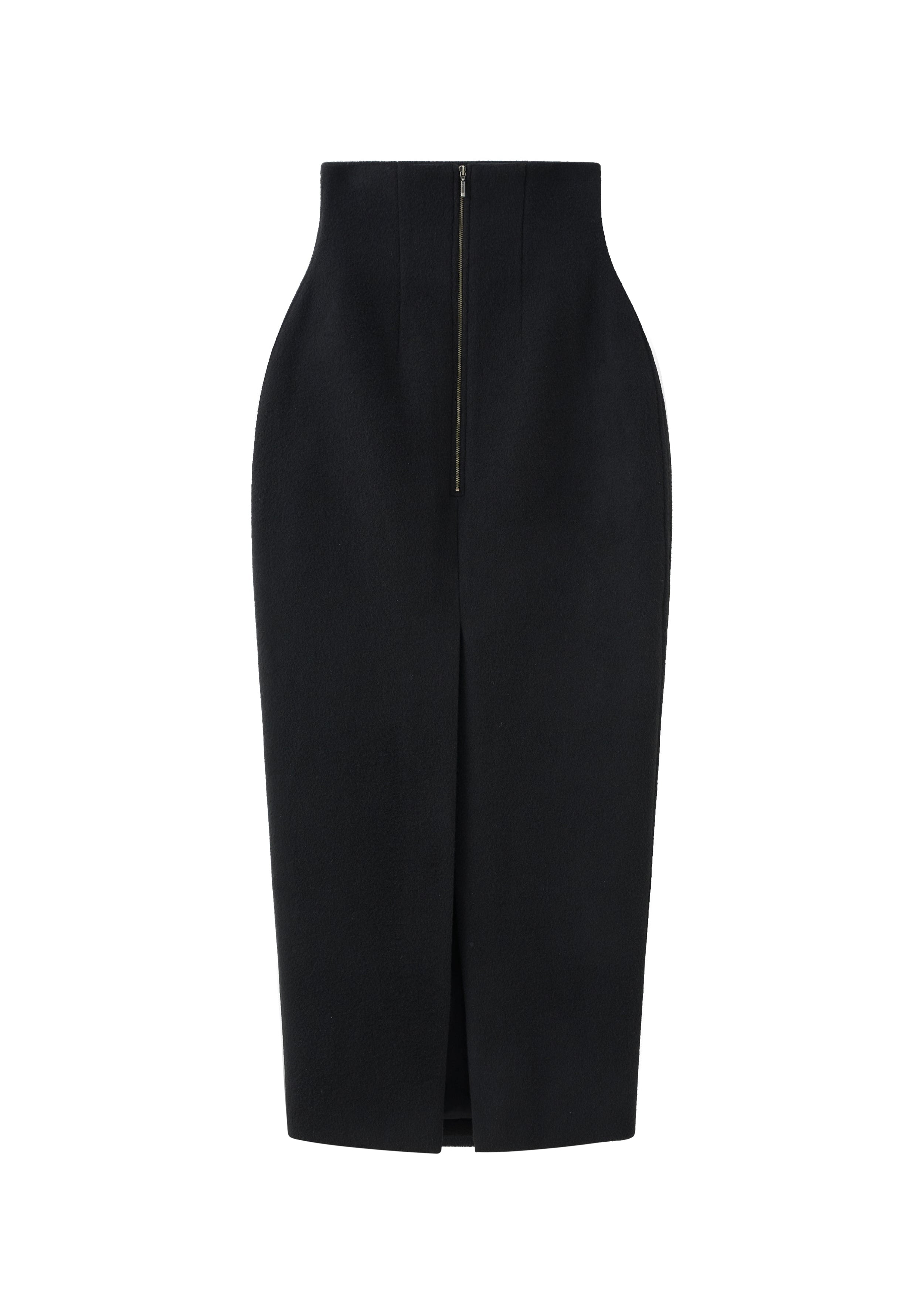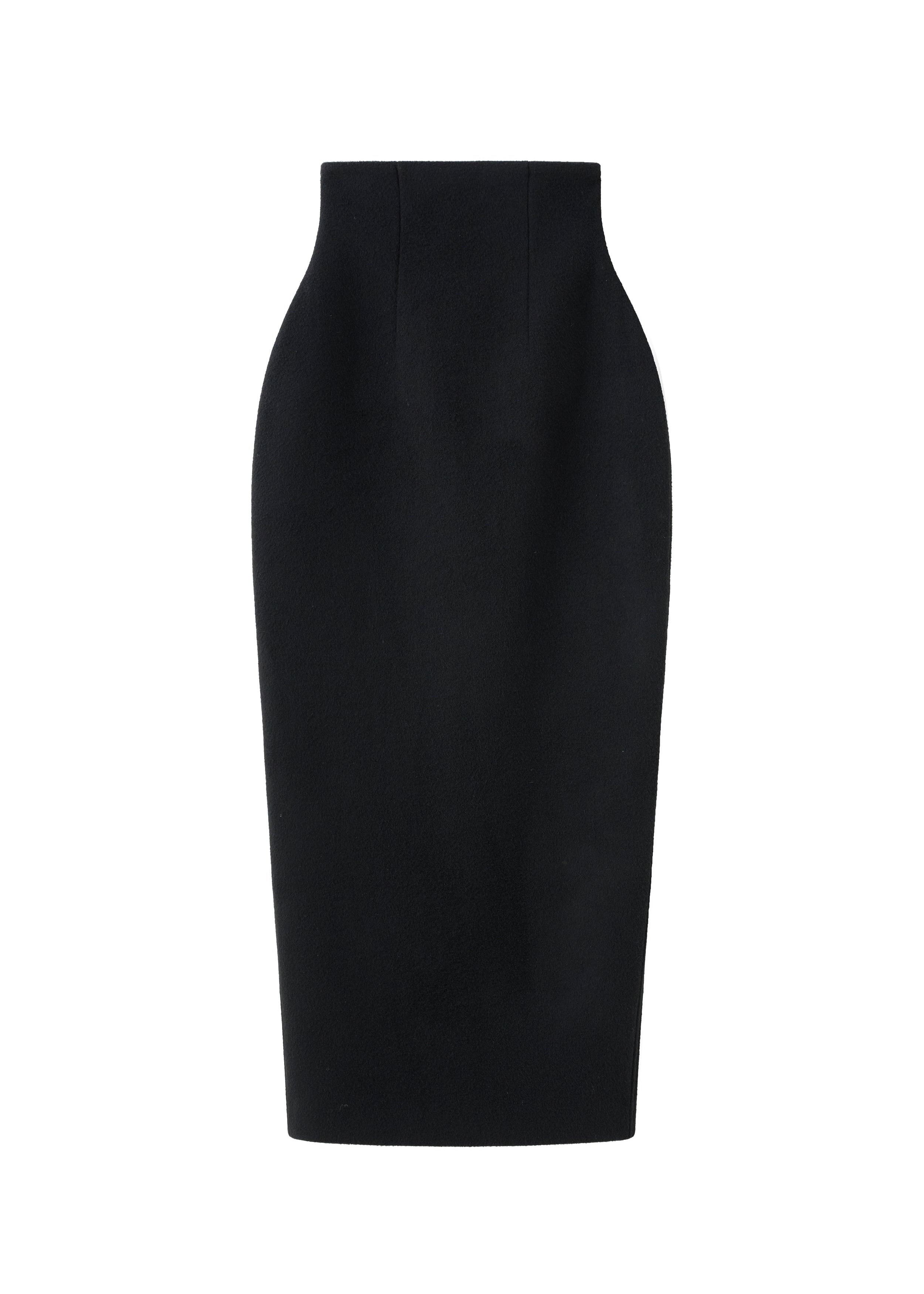 This skirt is a high-waisted, mid-calf length garment featuring a fitted pencil silhouette. It is constructed from wool fabric and presented in a solid black color.
