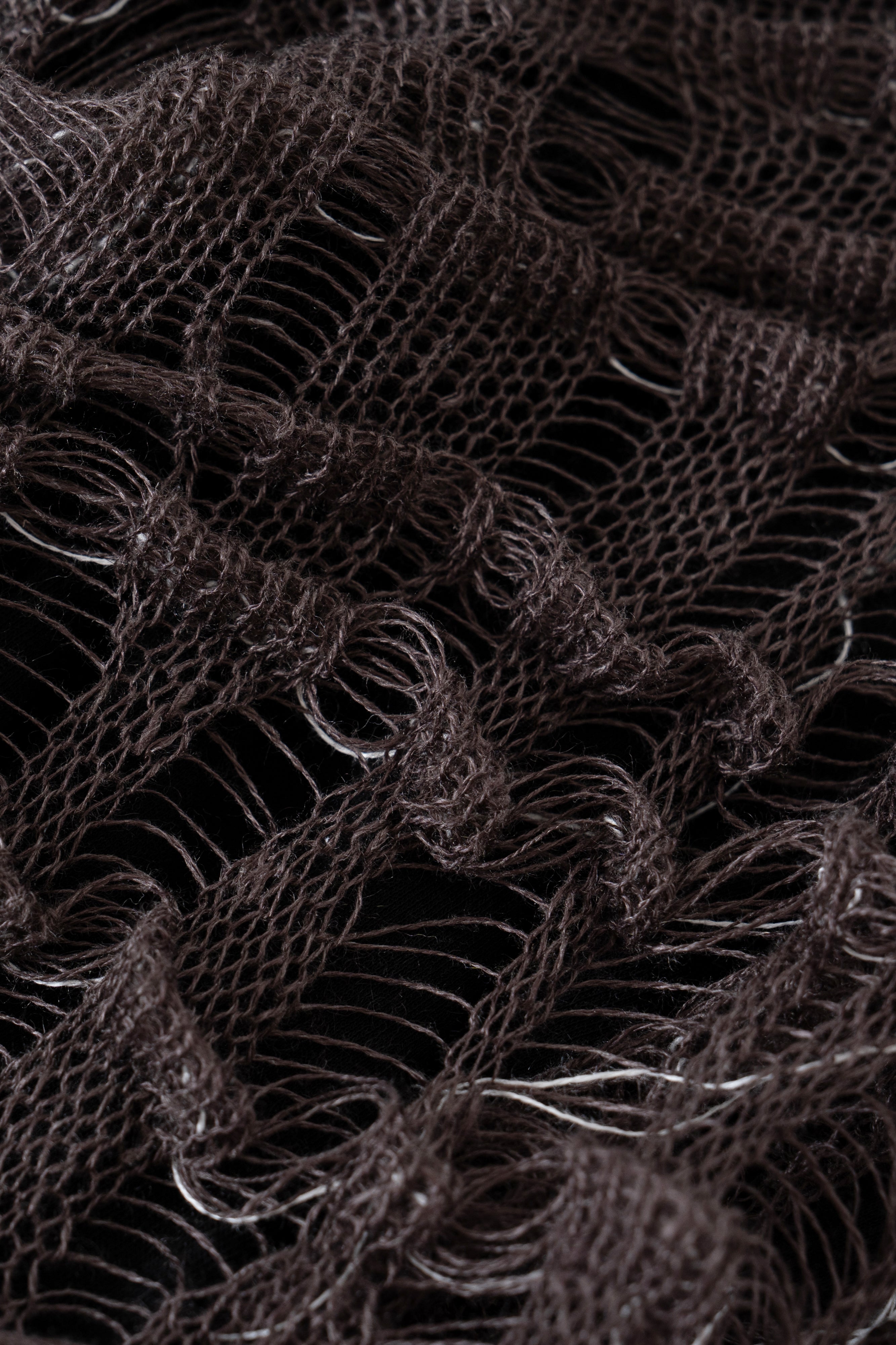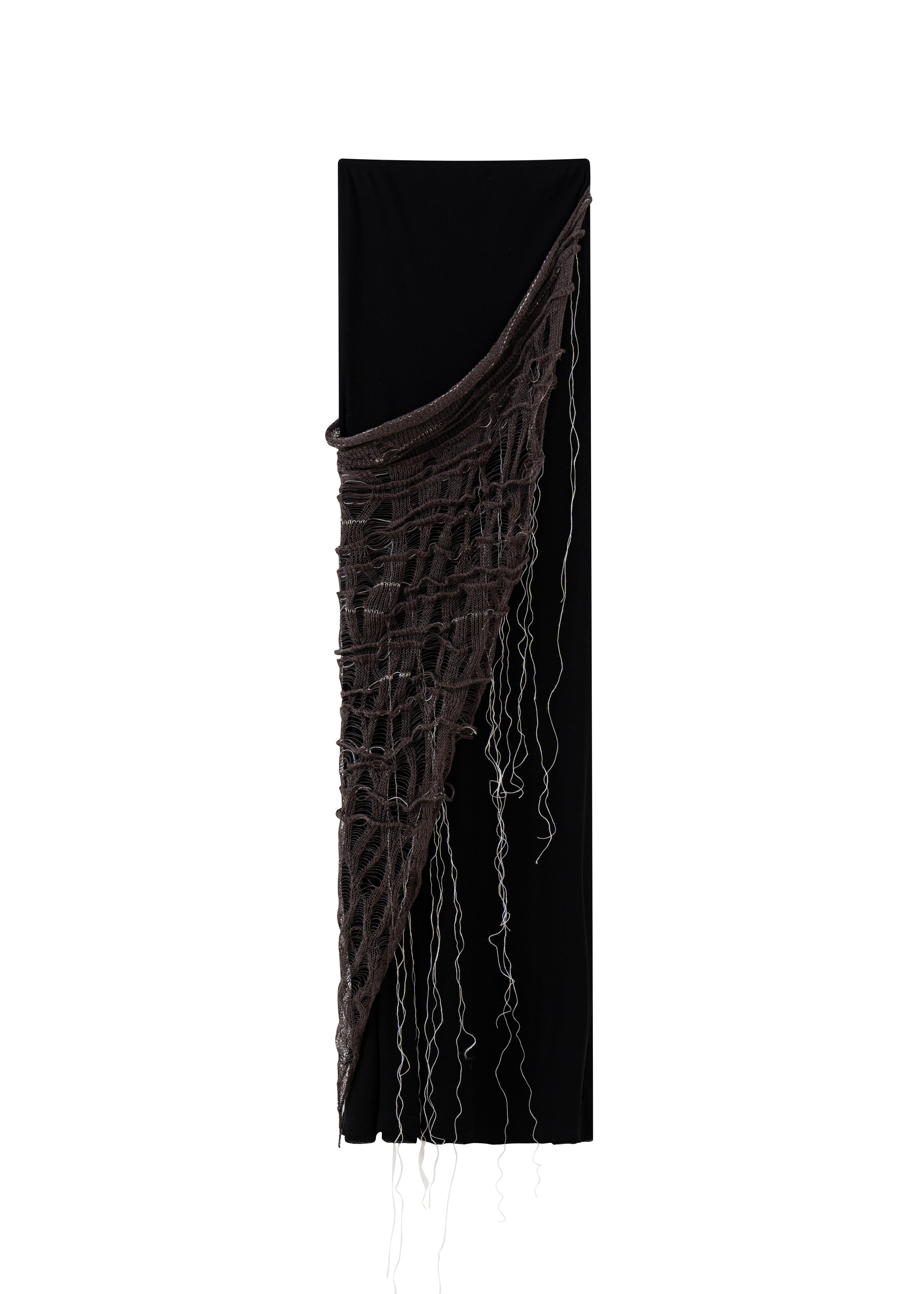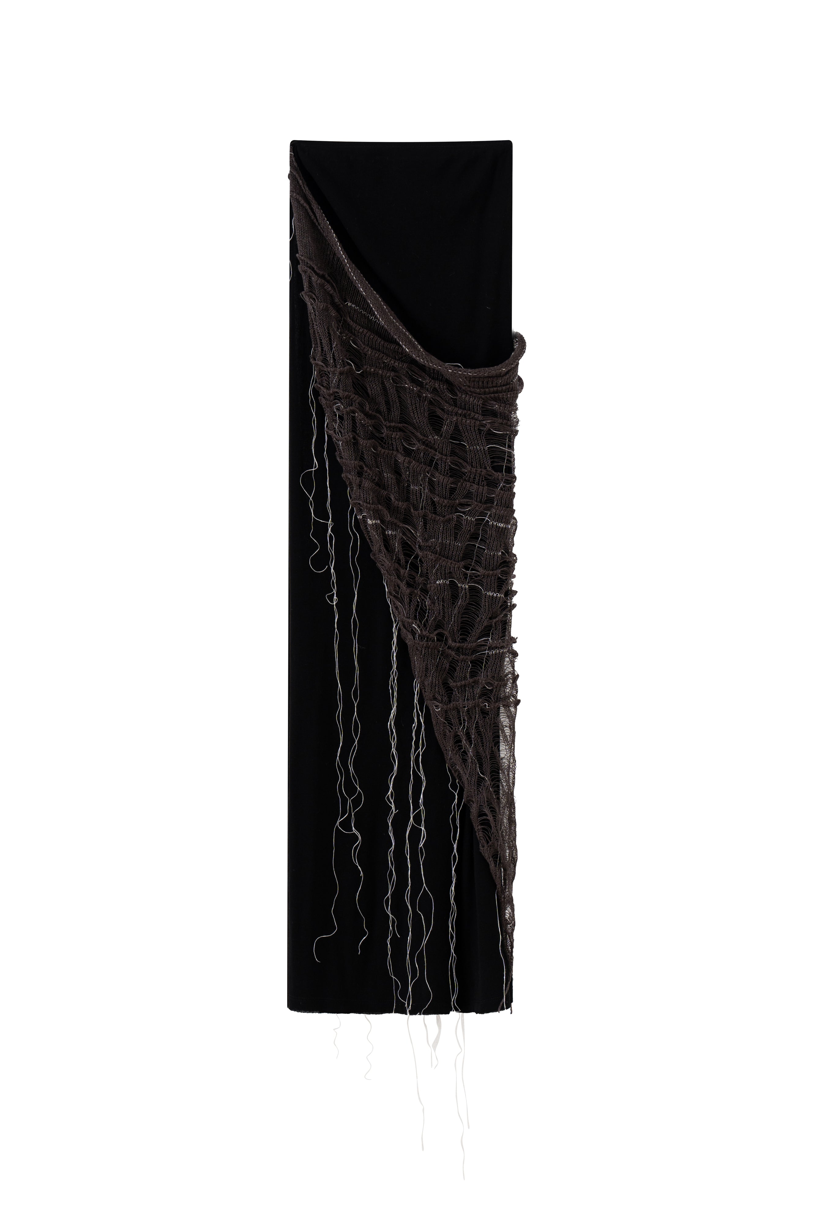 Asymmetric double layer skirt,  hand-knit outer layer fringes made with fine linen yarn wrapped around a fitted inner layer made with jersey