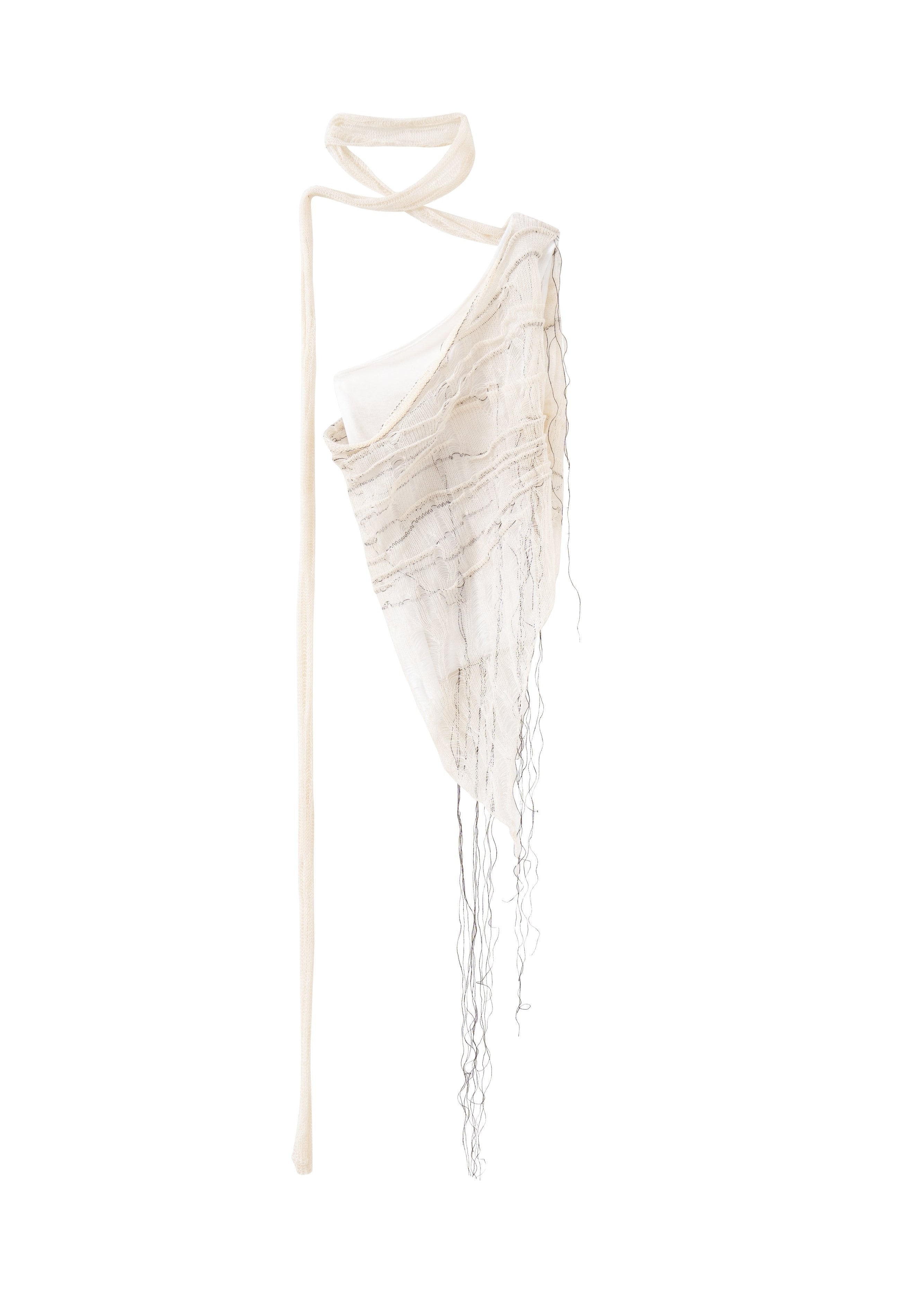 Asymmetric double layer top. Fitted inner layer made with cotton jersey, hand-knit outer layer made with fine linen yarn. Hand-knit skinny scarf attached.