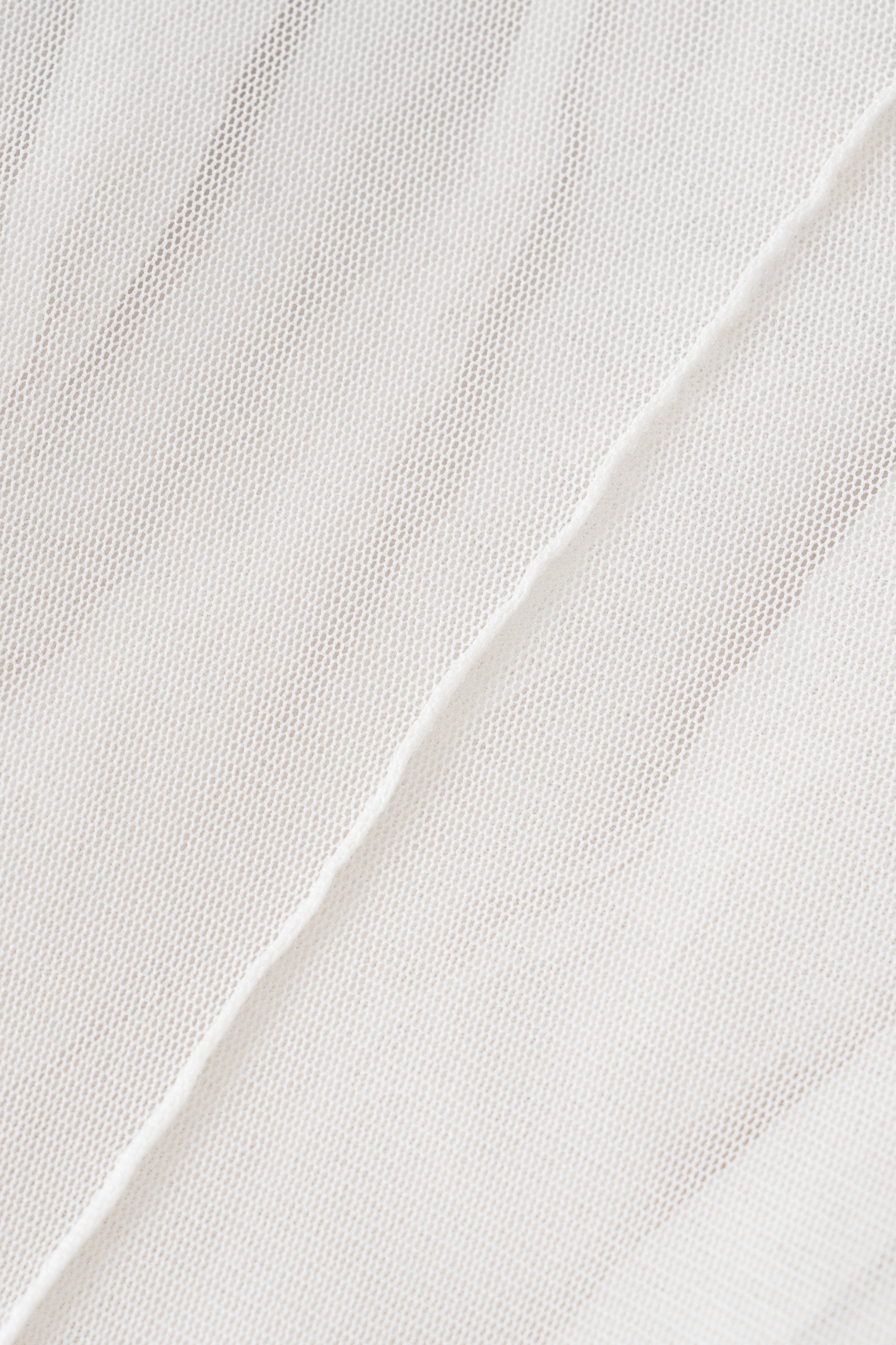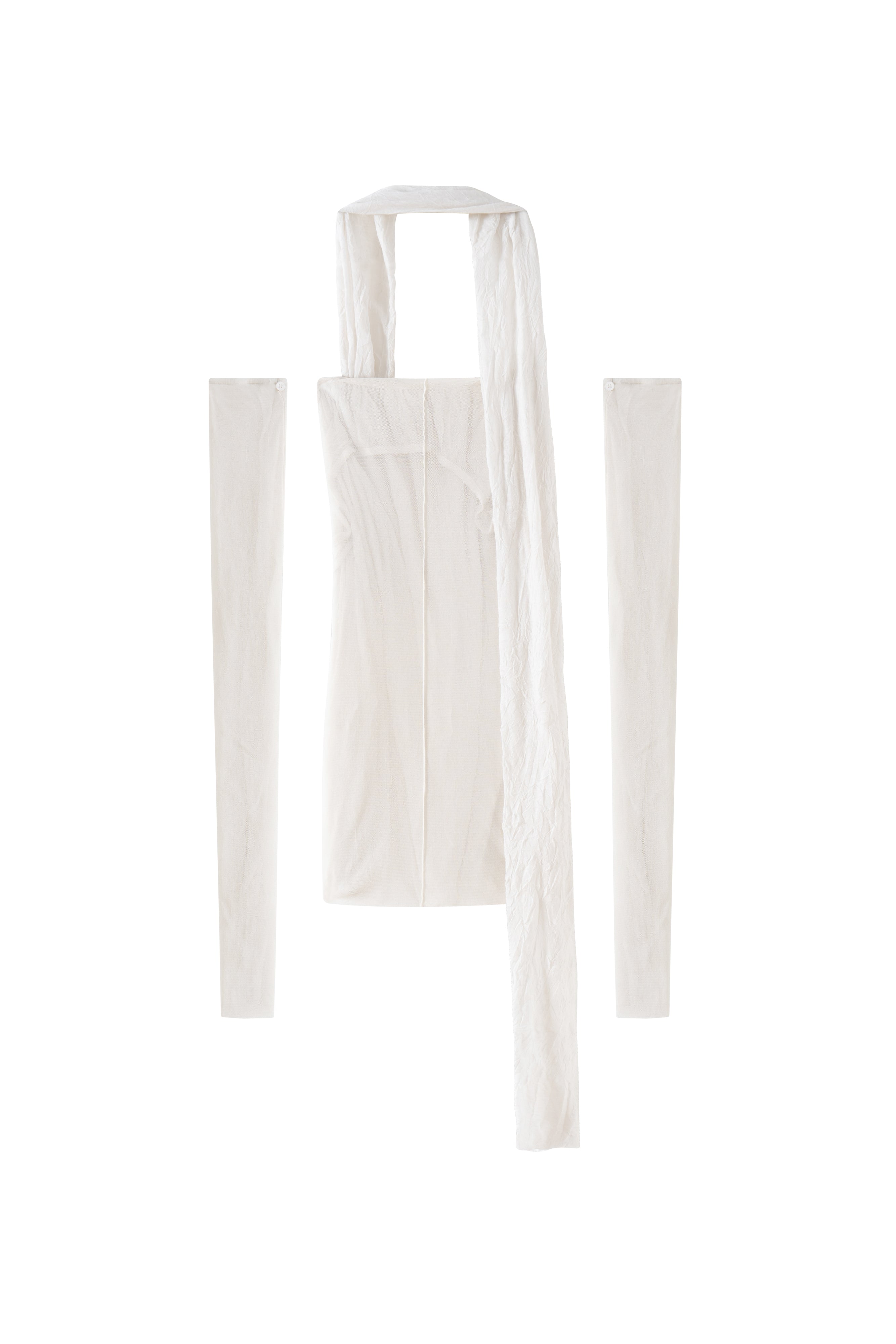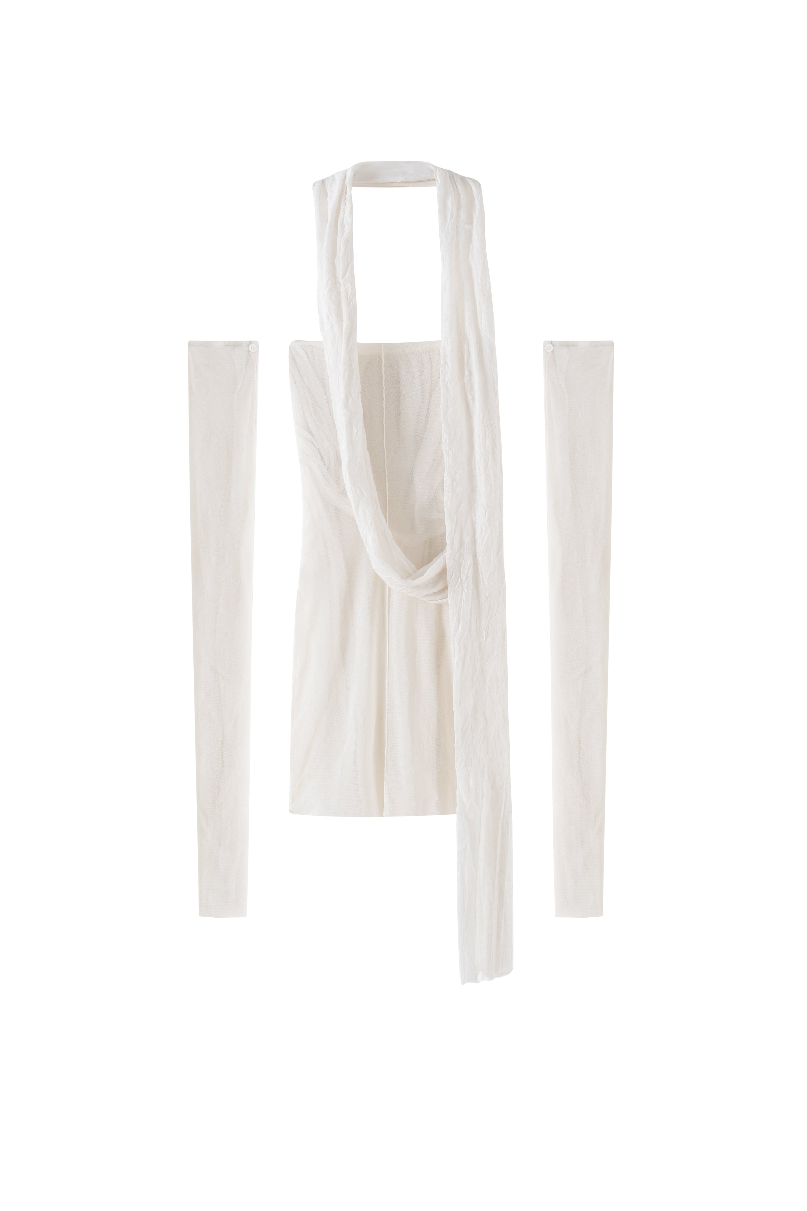 Double-layered tube top, made with extra wide wrinkled jersey inner layer and slightly tight fit tulle jersey outer layer and a seam line that runs through the middle of the bodice. Comes with pull-on sleeves and skinny scarf attached.