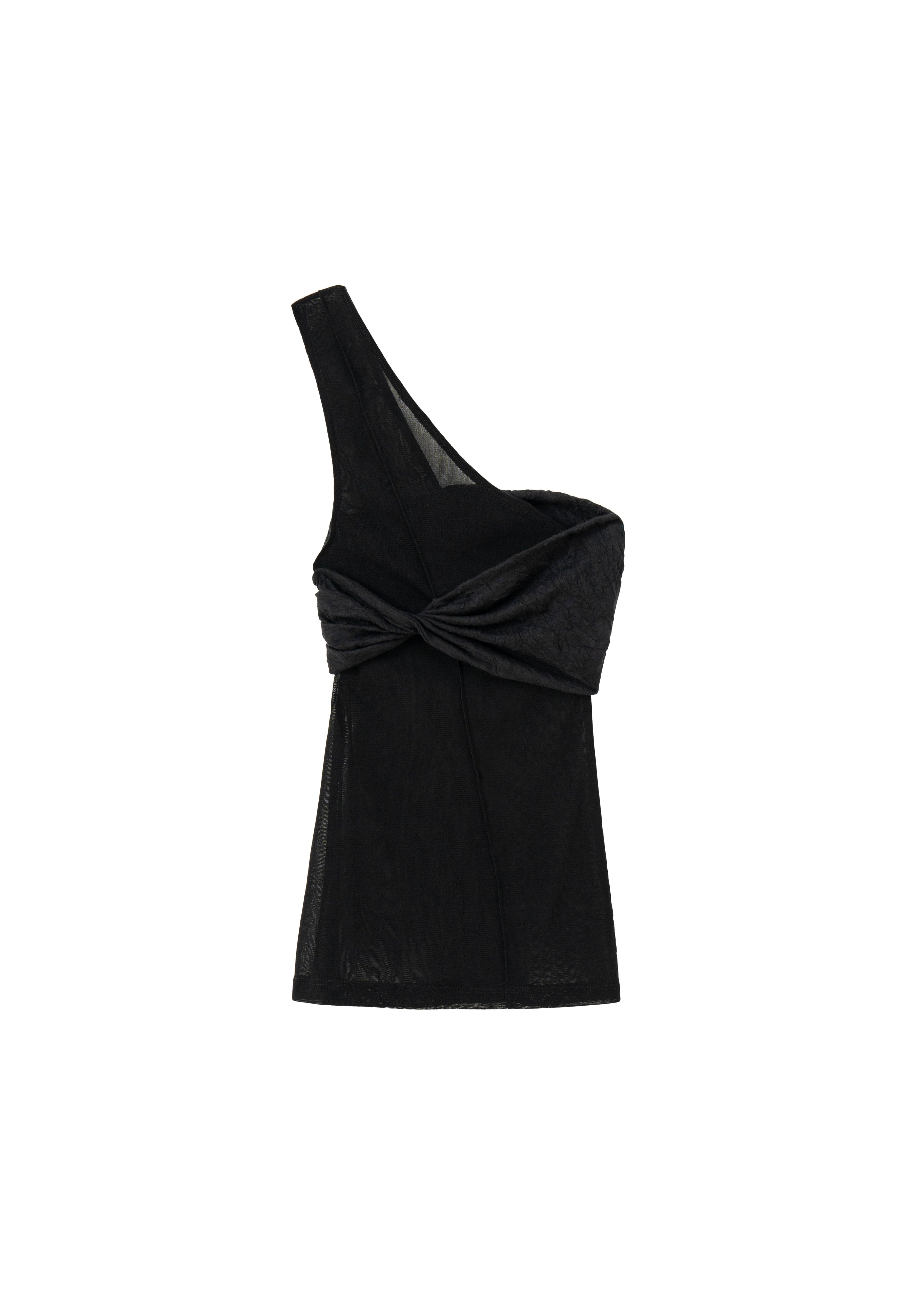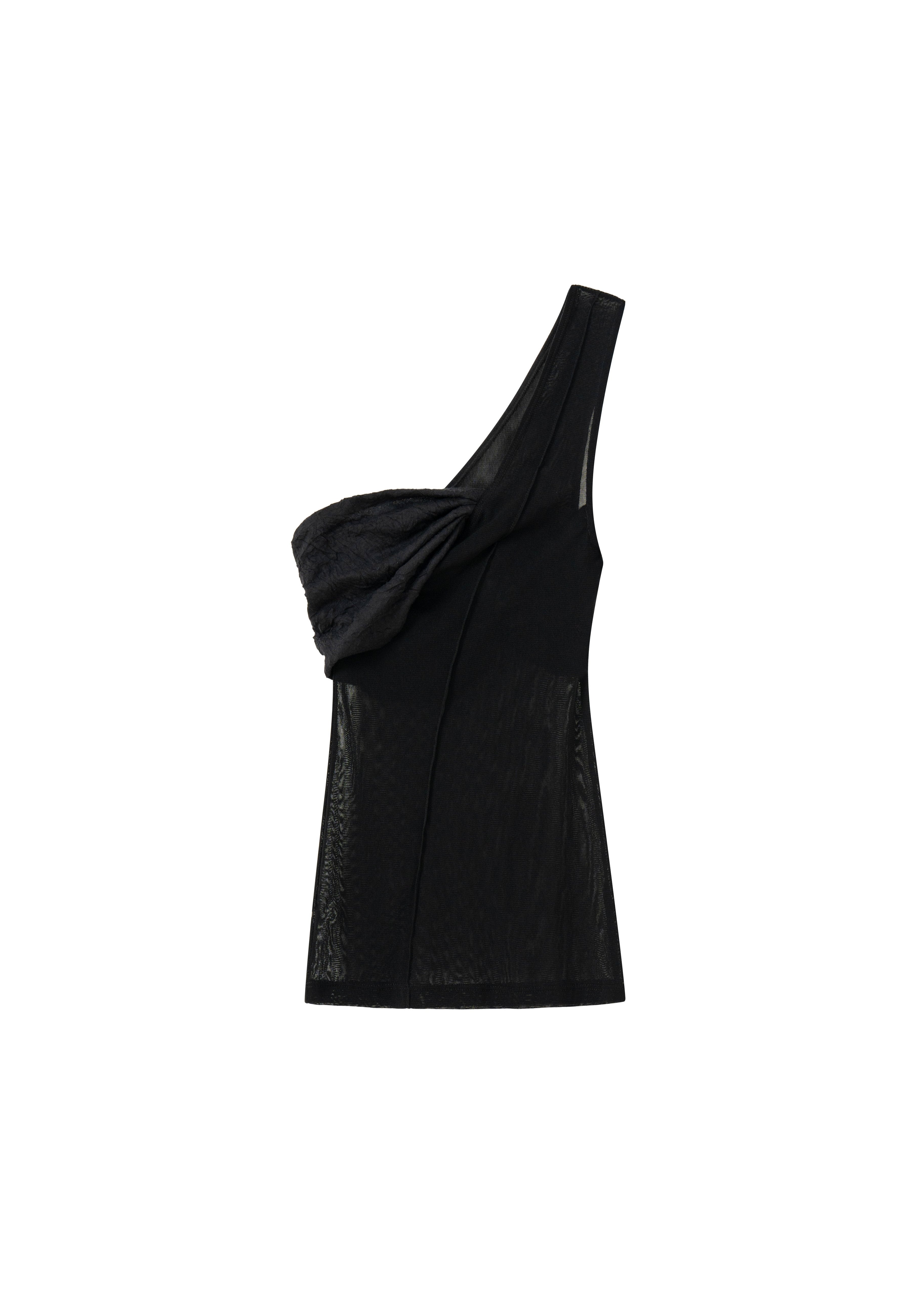 Asymmetric one shoulder draped top with a twisted bra design, made from sheer tulle jersey. Available in Black, and Olive.