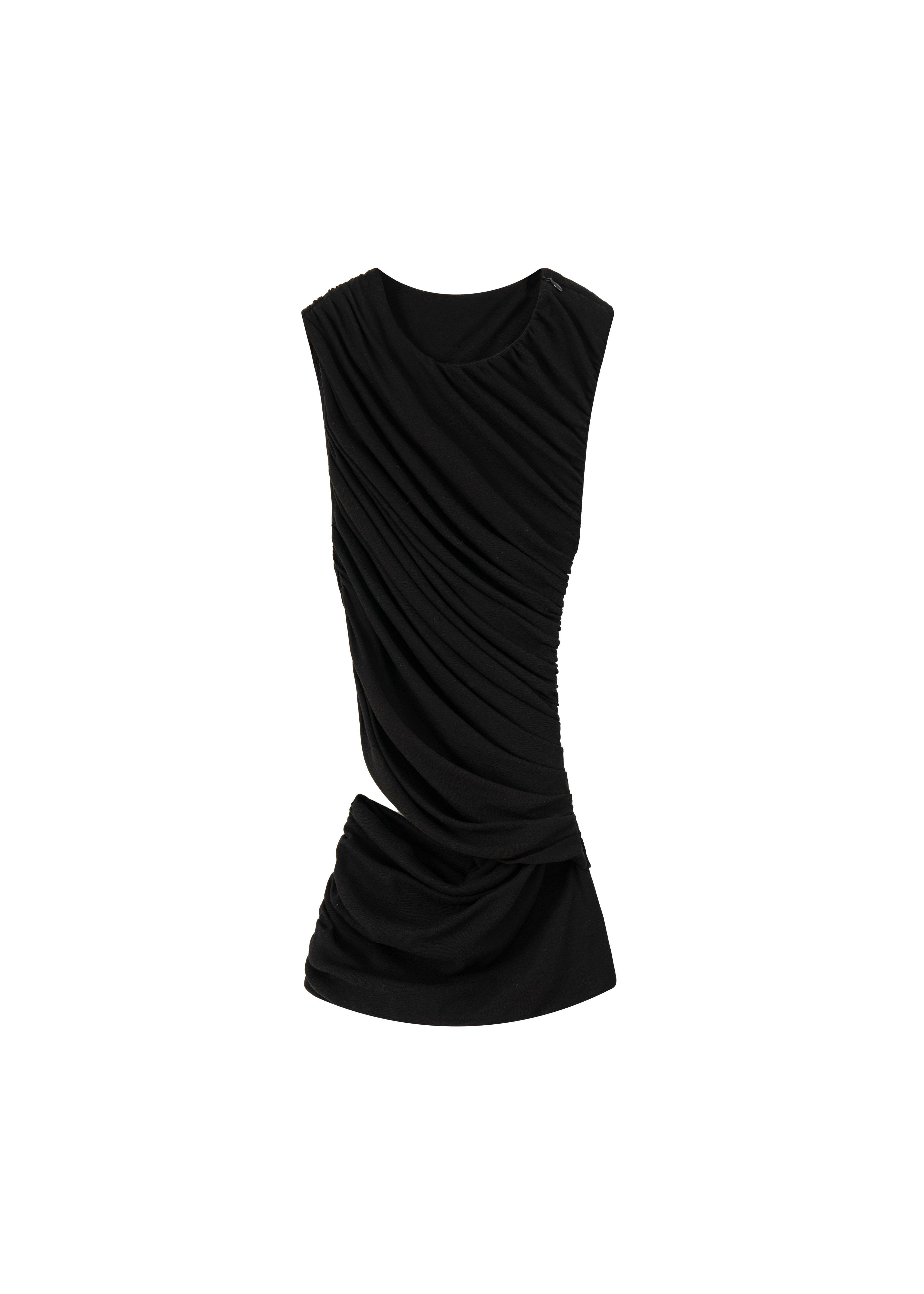 Shell tank top in black, panelled construction, draping & cut-outs throughout, asymmetric neckline, sleeveless, armscyes, asymmetric hem, slim fit, made with fine cotton jersey.