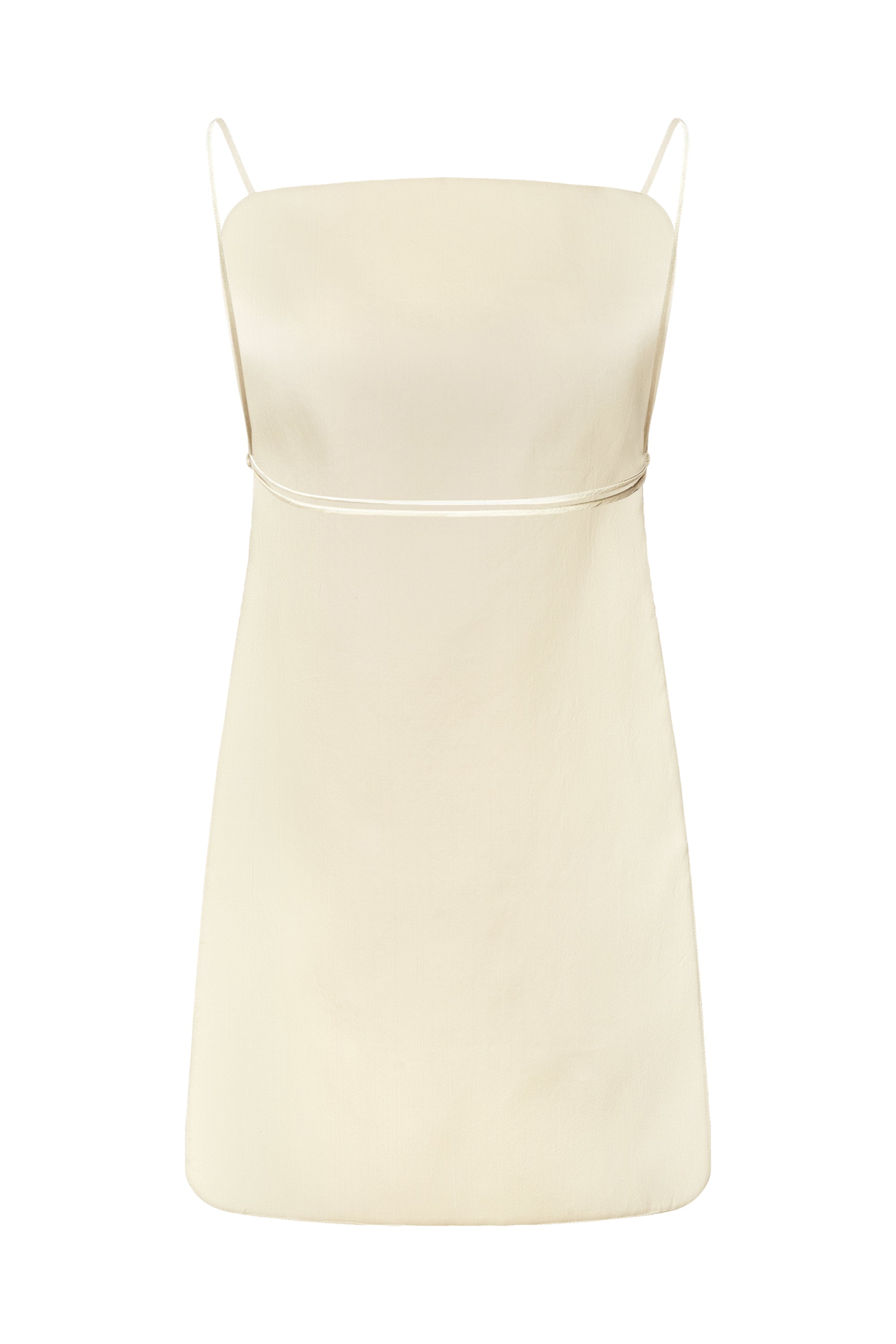 This garment is a mini-length top featuring a square neckline and thin spaghetti straps. A horizontal seam defines the waist, from which the fabric extends in a straight silhouette. The top is presented in an off-white color.