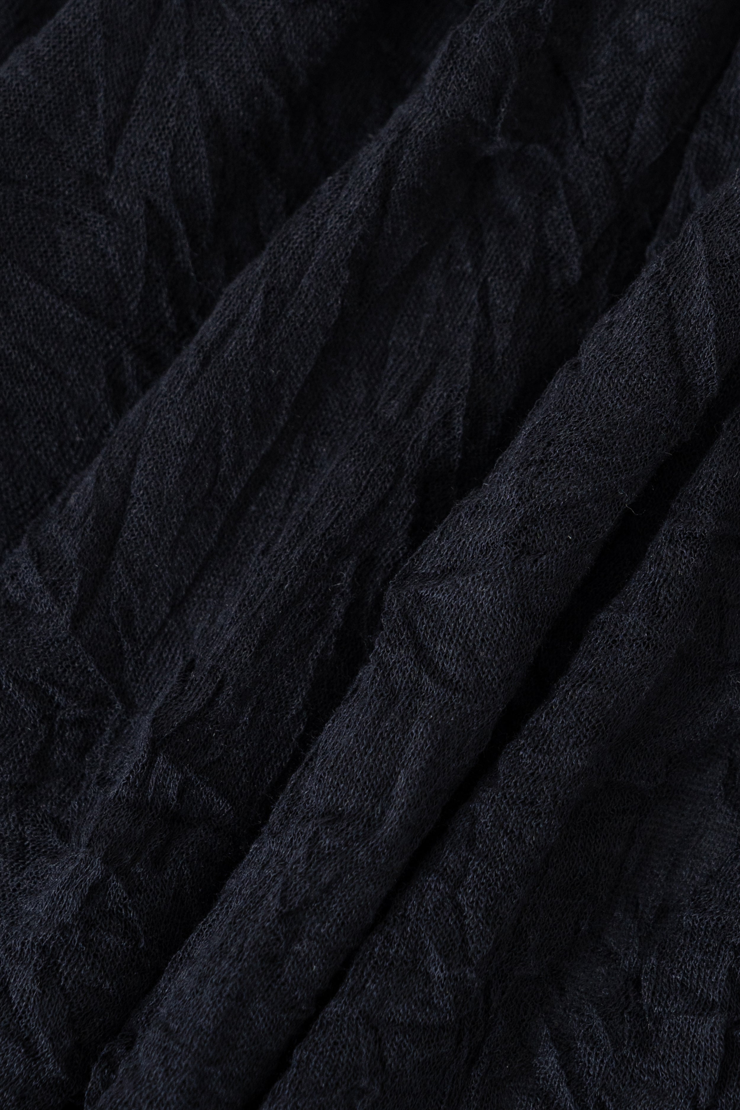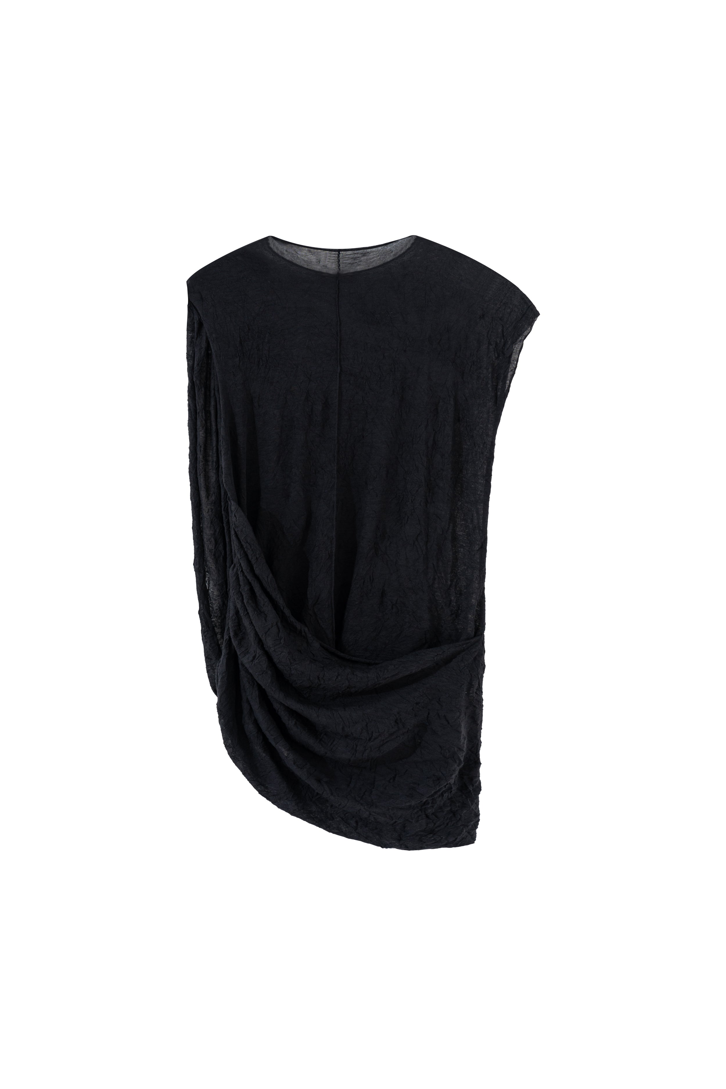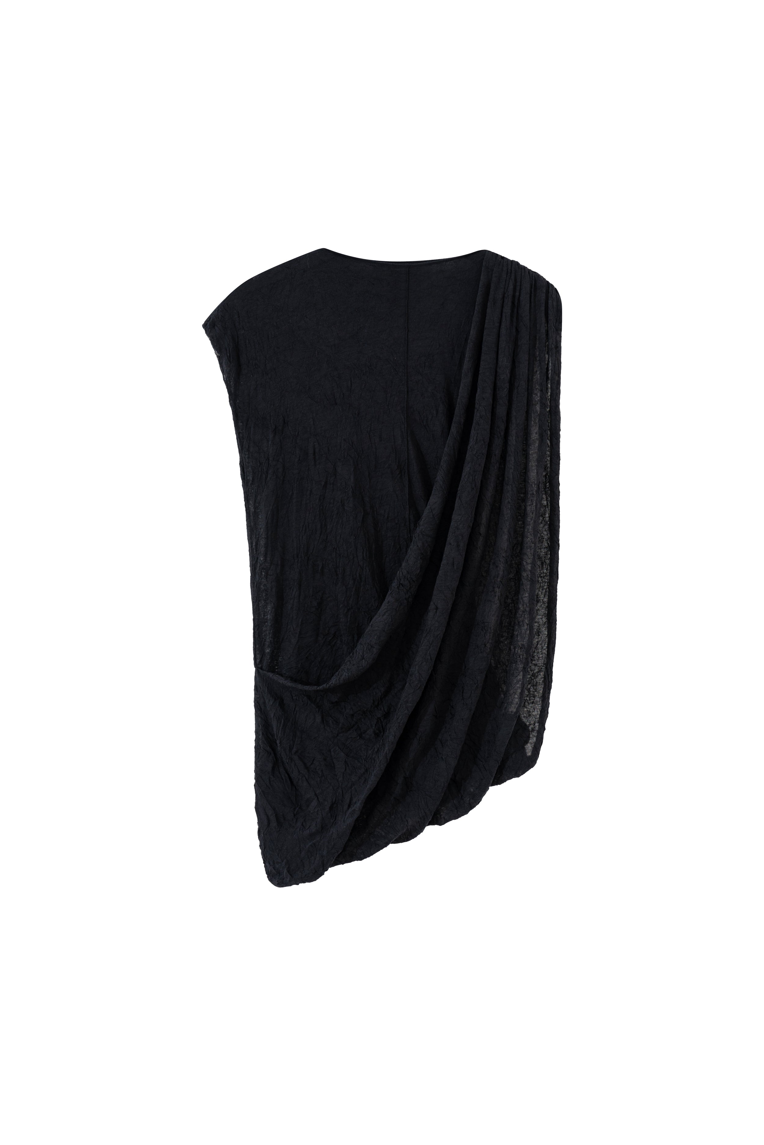 This top features an asymmetrical draped panel on the front, creating a distinctive silhouette. It is designed with a round neckline and a sleeveless cut. The garment appears to be made from a textured fabric, consistent with its 'wrinkle' designation.