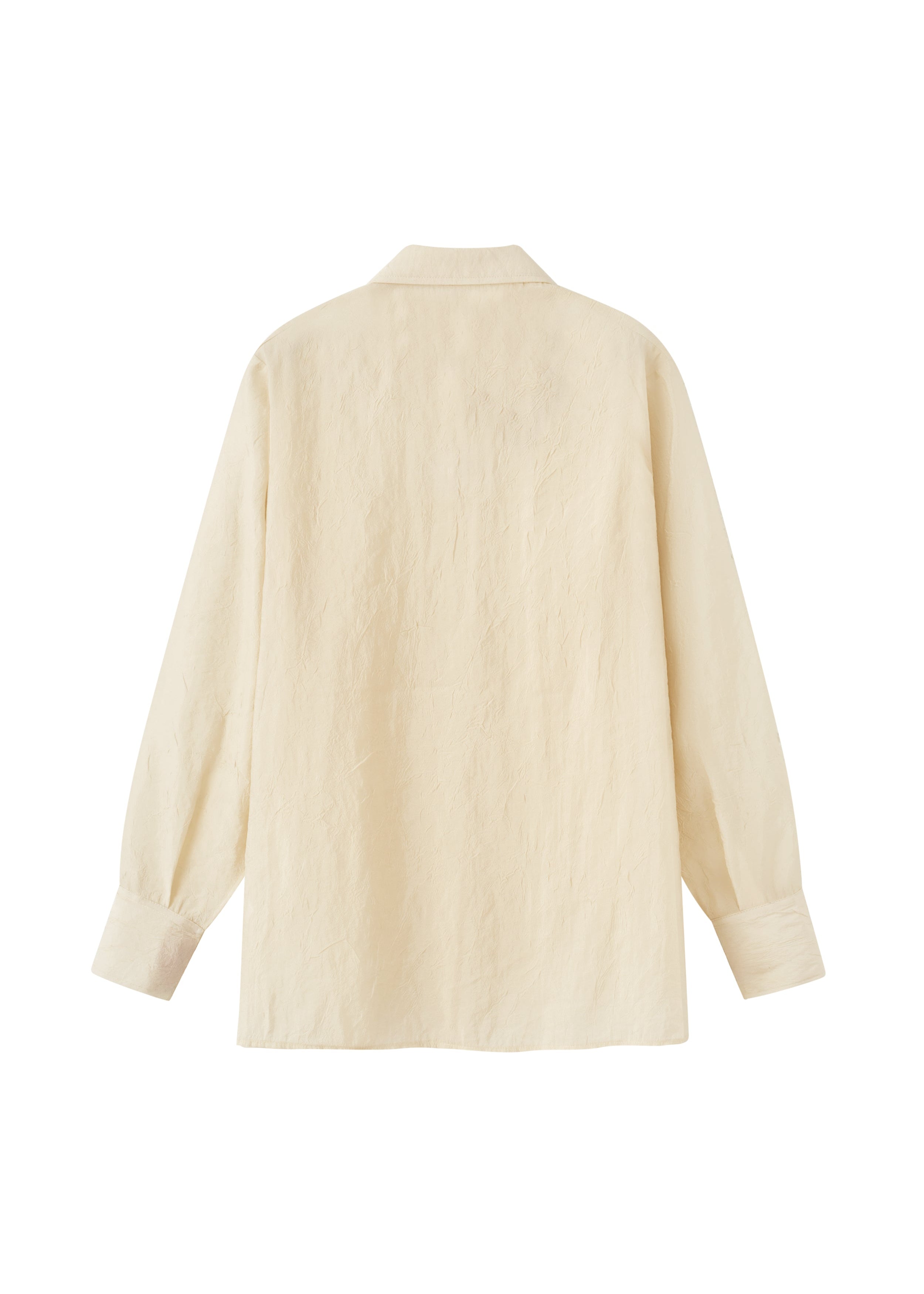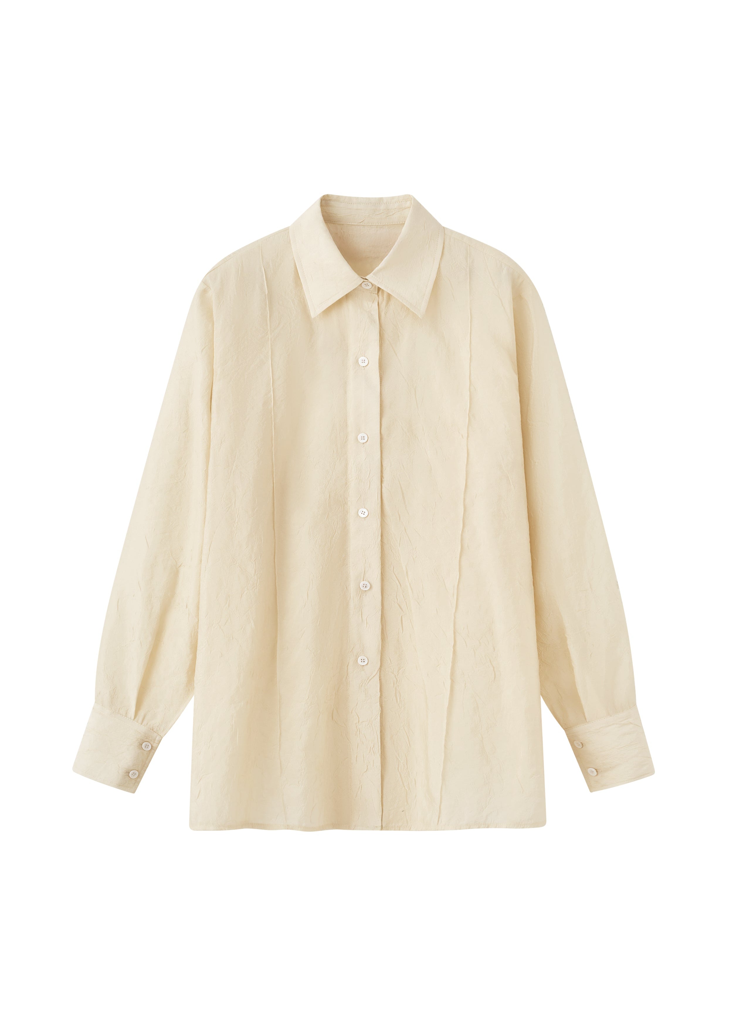 The Wrinkled Shirt is an off-white, long-sleeved garment with a pointed collar. It features a full-length front button placket and buttoned cuffs. Vertical seaming details are present on the front panels, contributing to its textured finish.