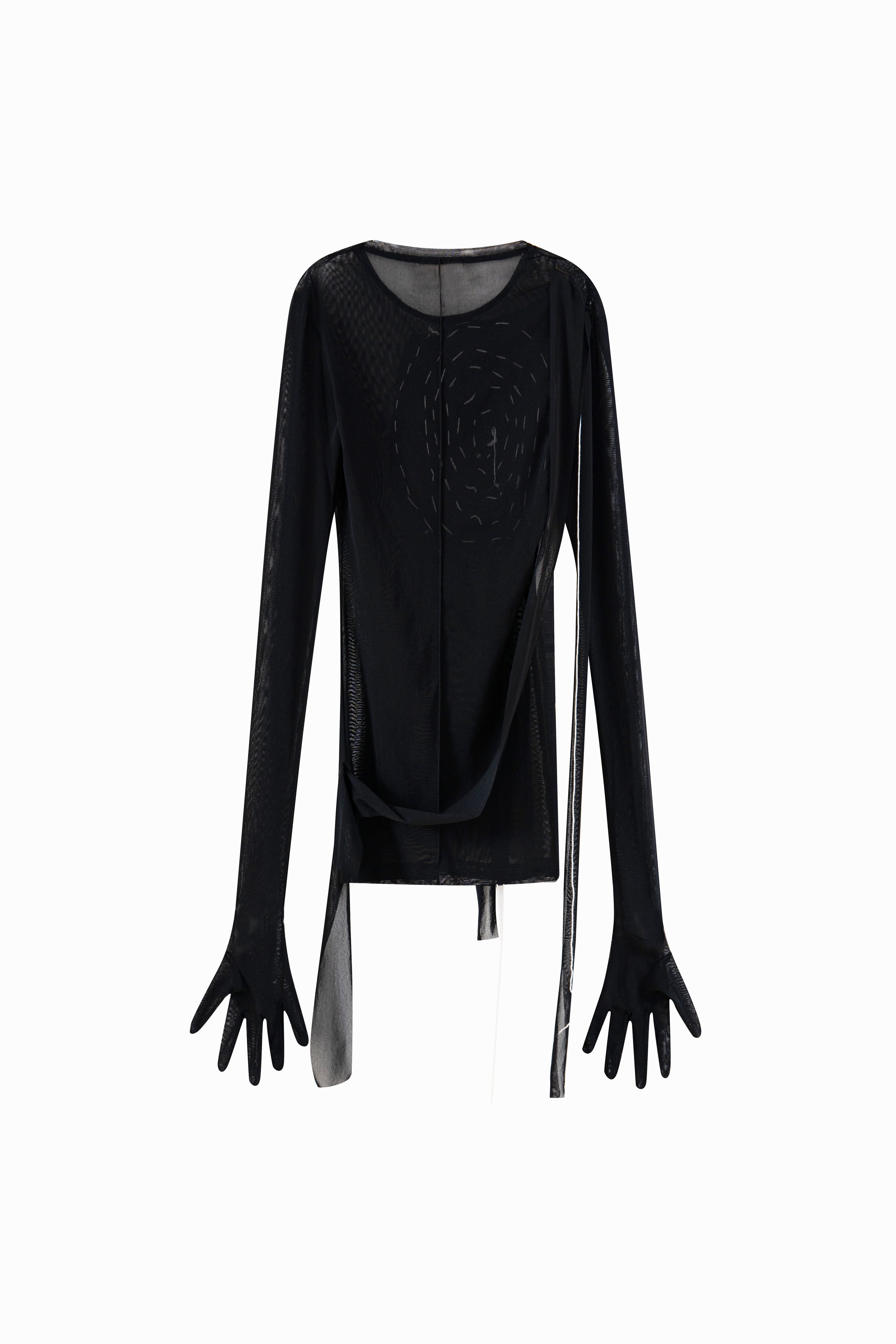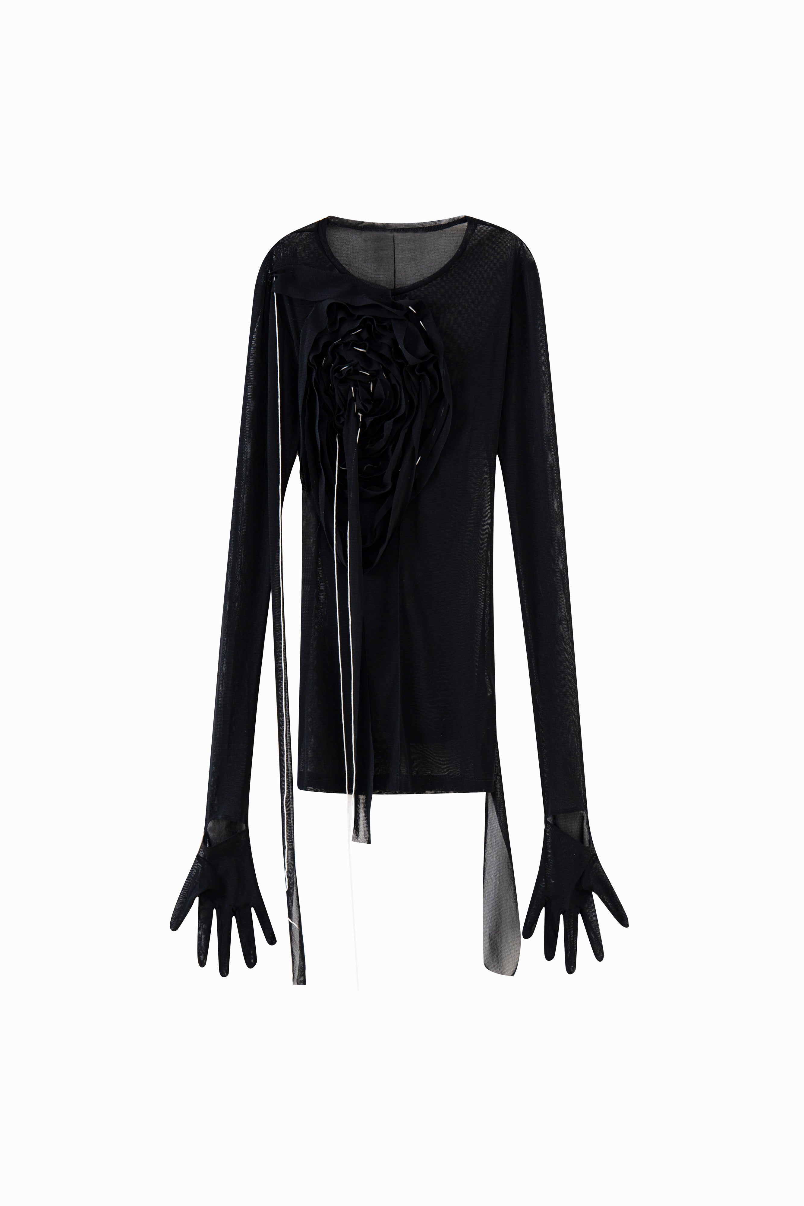 This garment is a black long-sleeve top with a rounded neckline. A three-dimensional rose appliqué is positioned on the left side of the chest, accompanied by multiple hanging fabric strips. The sleeves are designed to extend into five-finger glove-like extensions. The hemline includes asymmetrical slits on both sides, with additional fabric strips hanging from the front.
