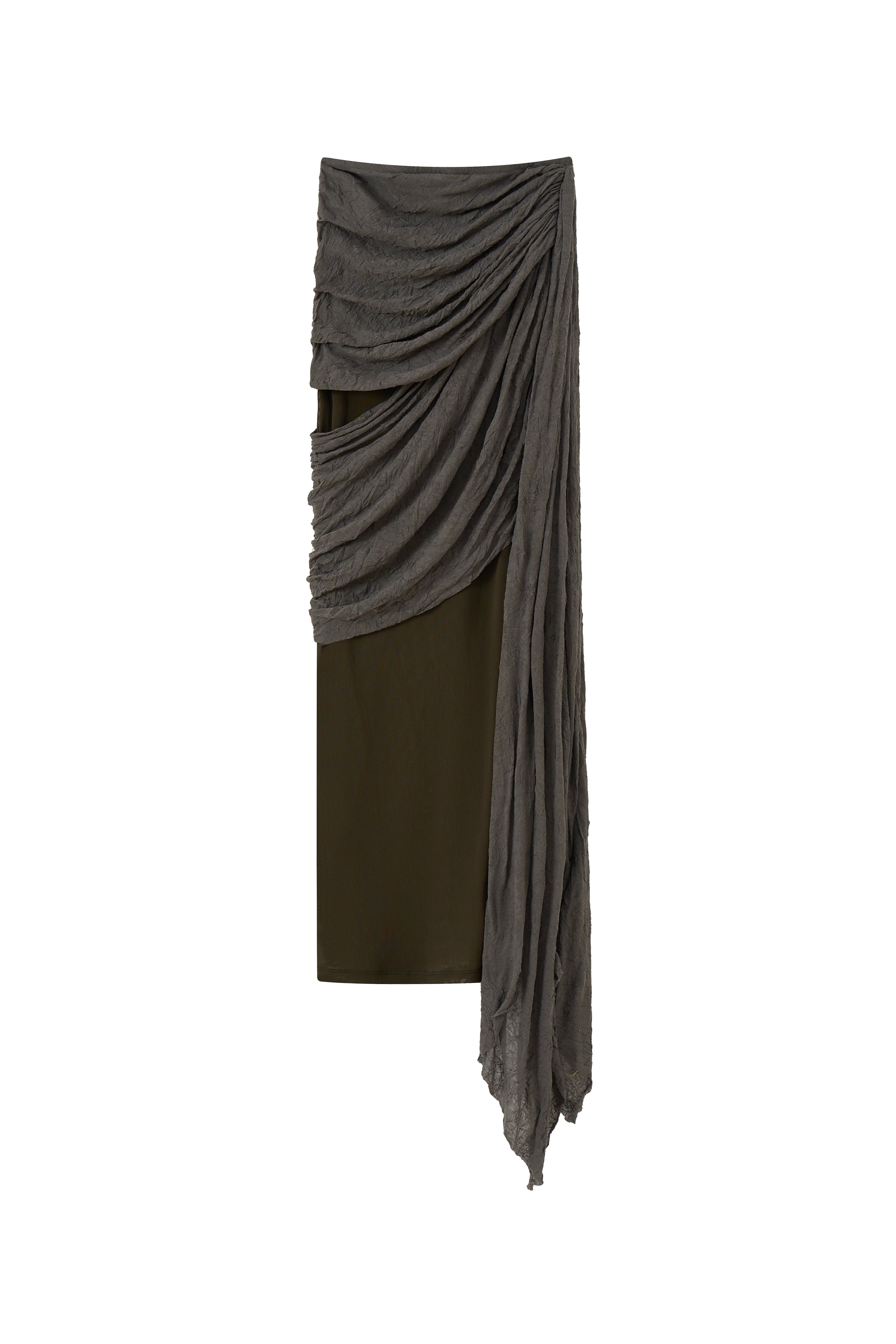 Semi-sheer asymmetric double layer full length skirt with twisted detail in wrinkled jersey draped around the hips.- No fastening, highly stretchy- Elastic band for support at the waistComposition: Elastane 65%, Cotton 35%