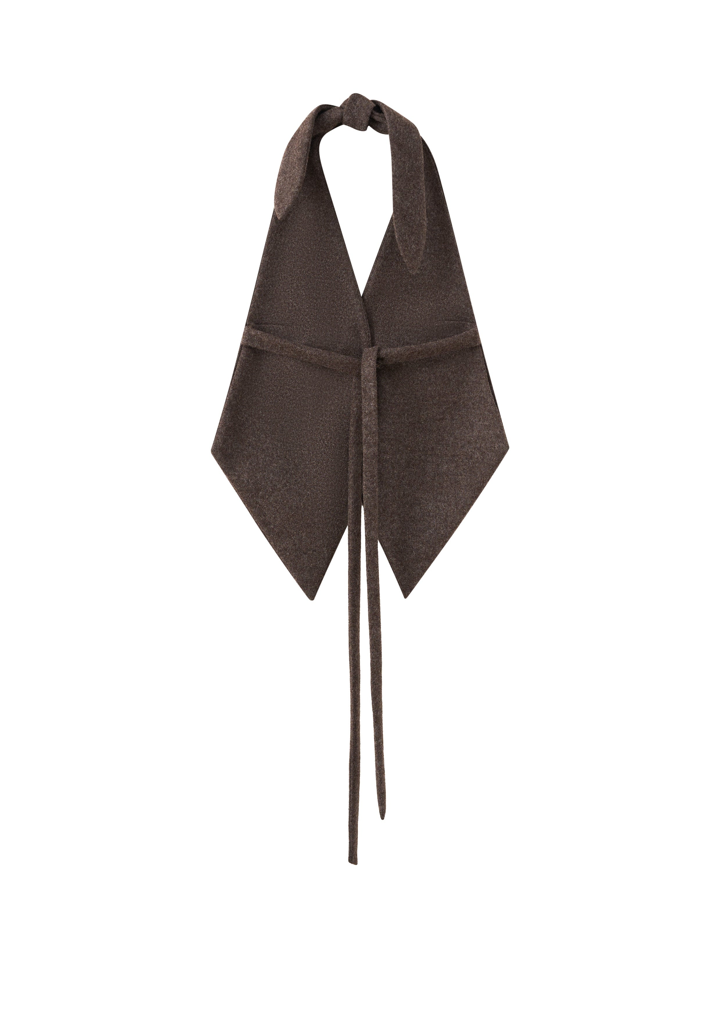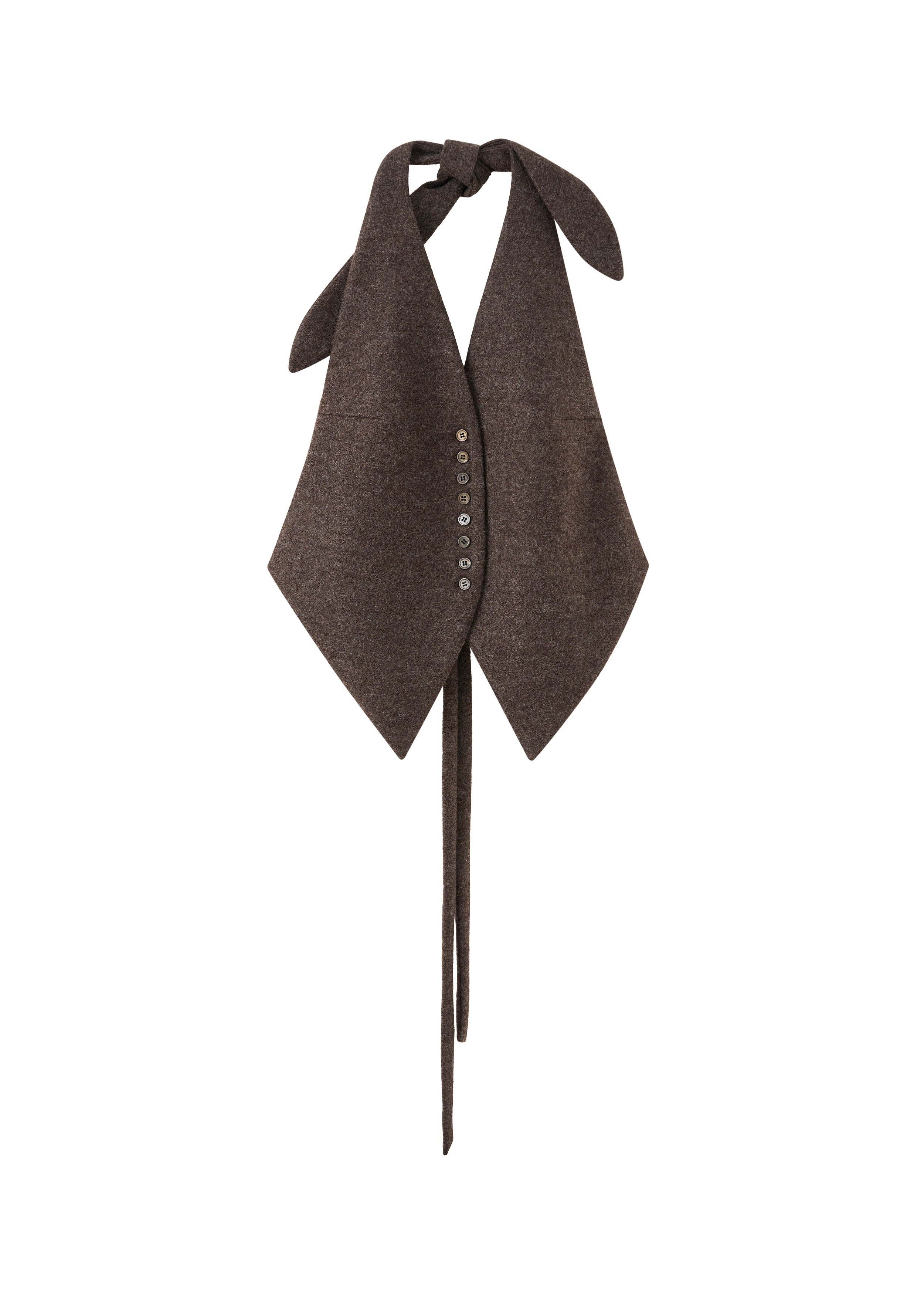 This is a backless vest featuring a halter-neck design with tie strings for fastening. It presents a V-neckline and secures with a row of circular buttons down the front. The lower hem of both front panels terminates in a distinct point. The garment is constructed from a textured fabric.