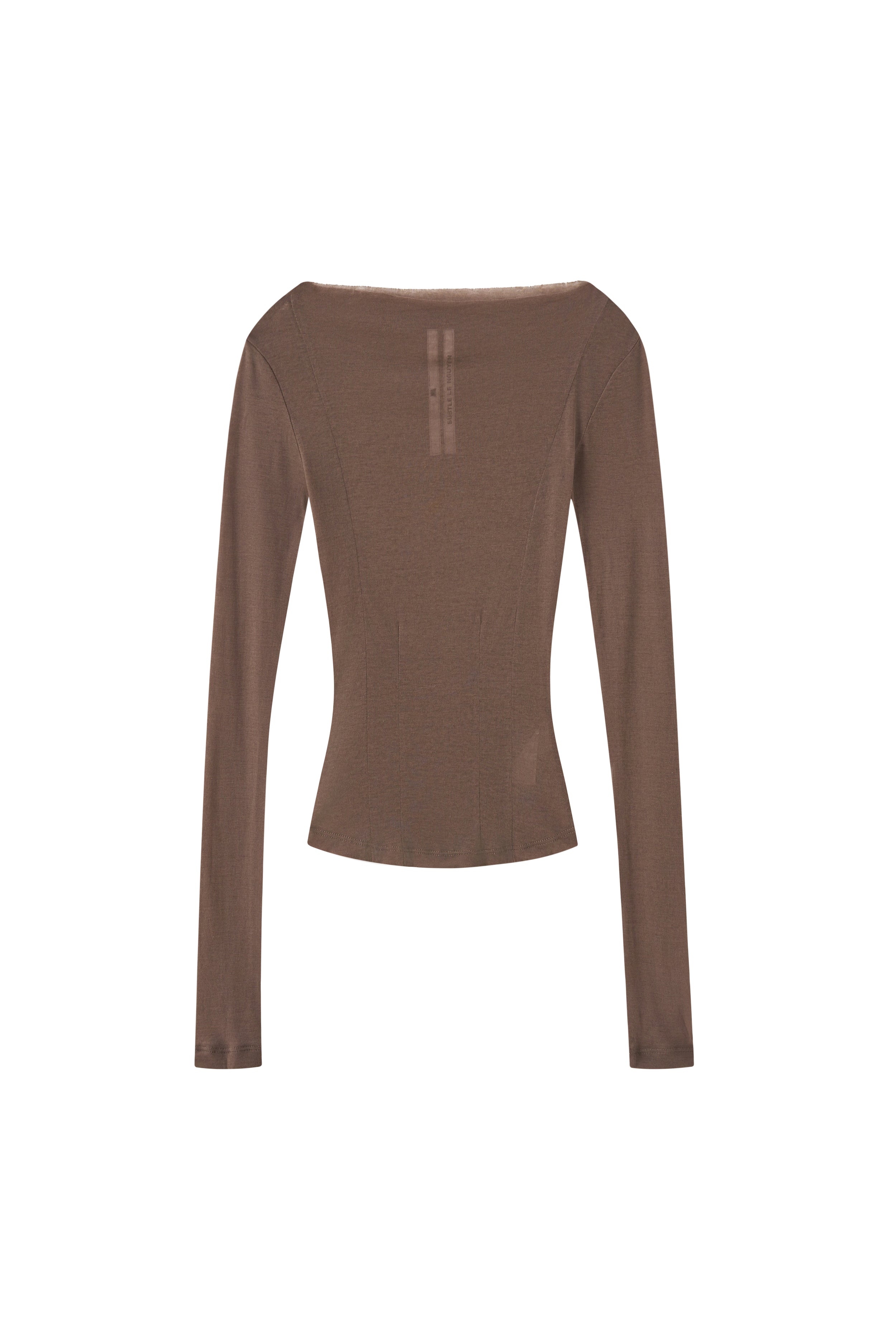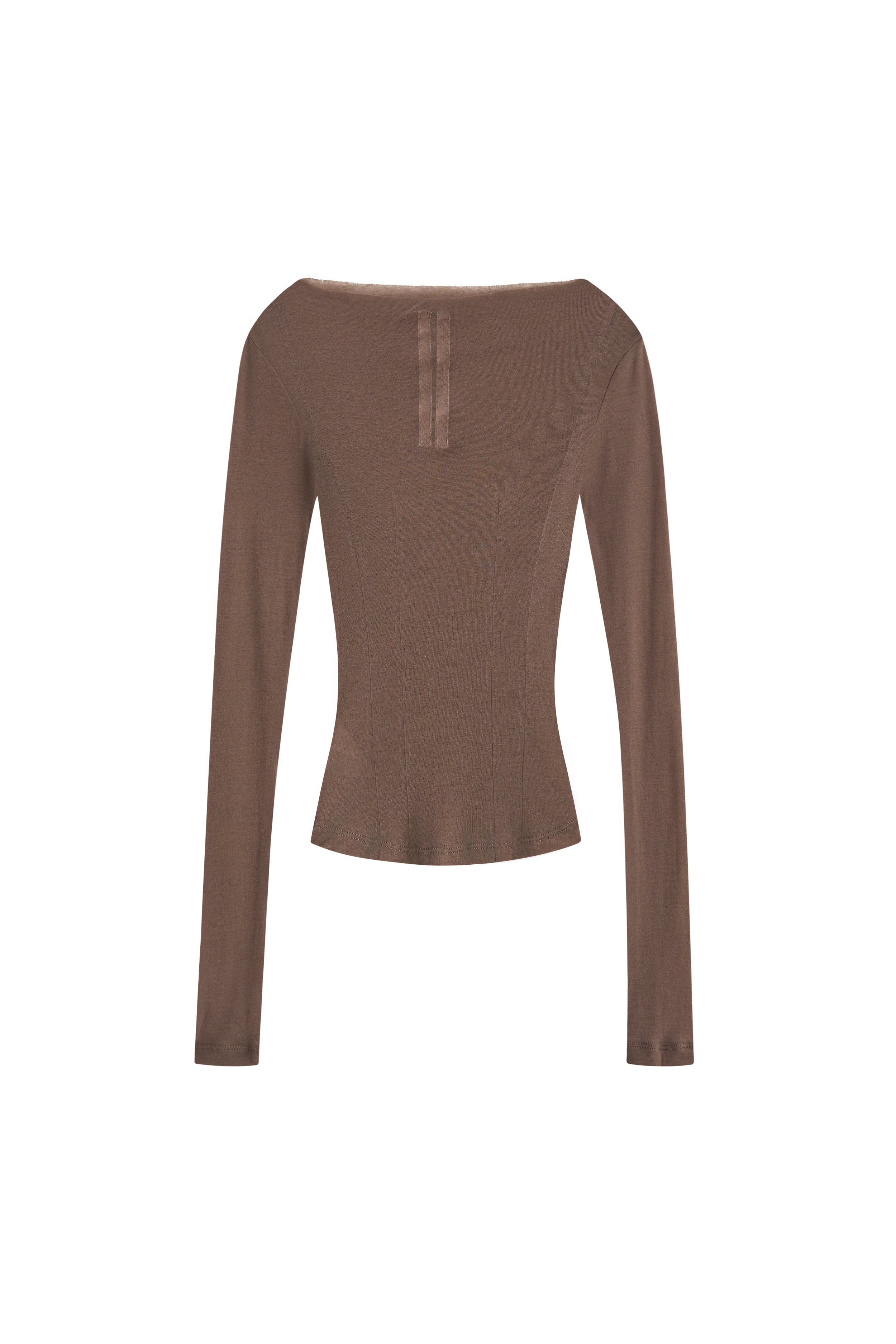 This is a brown, long-sleeved tee. It features a fitted silhouette and a wide neckline. The garment is constructed from a ribbed knit fabric, and it has a slightly curved hem.