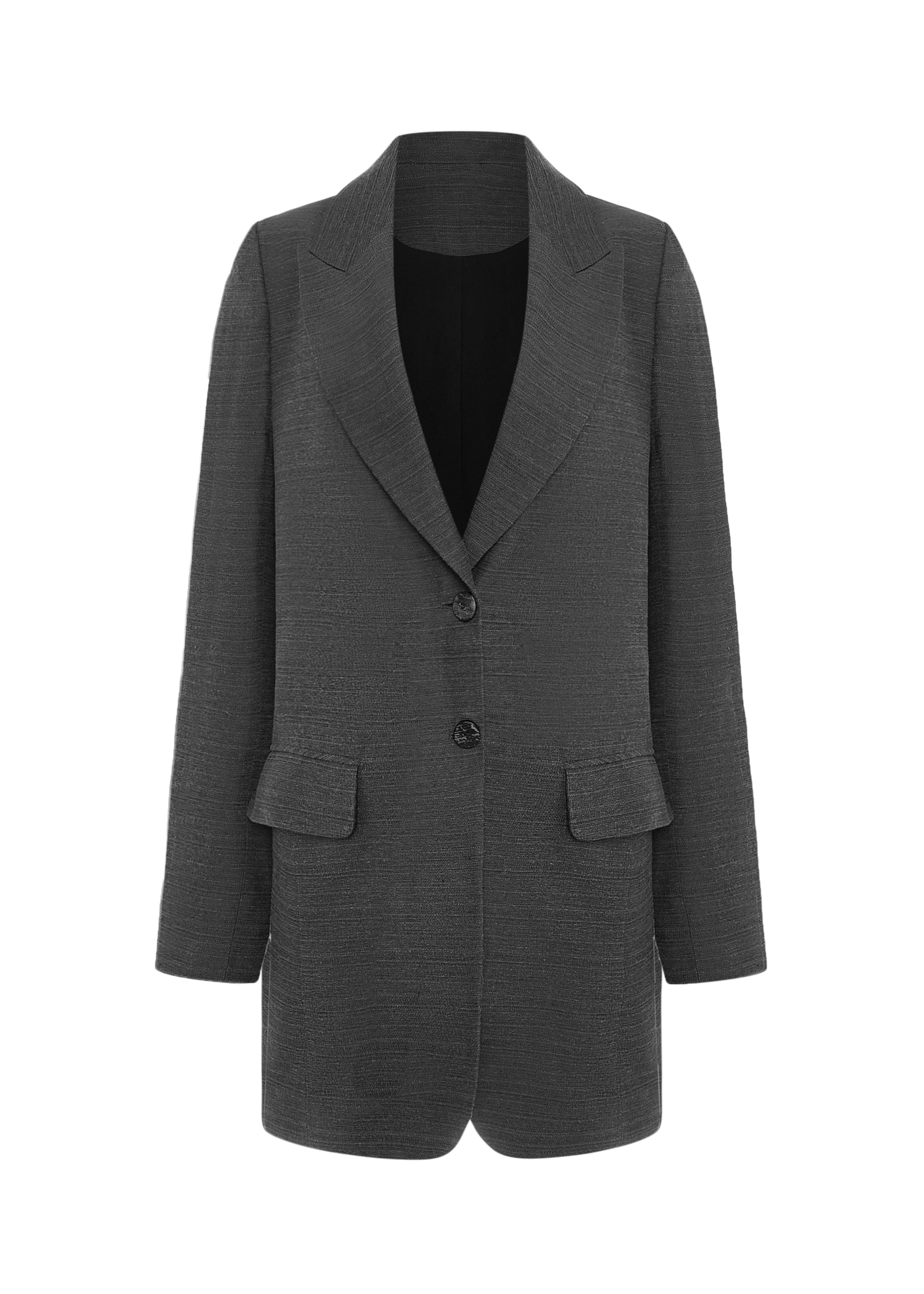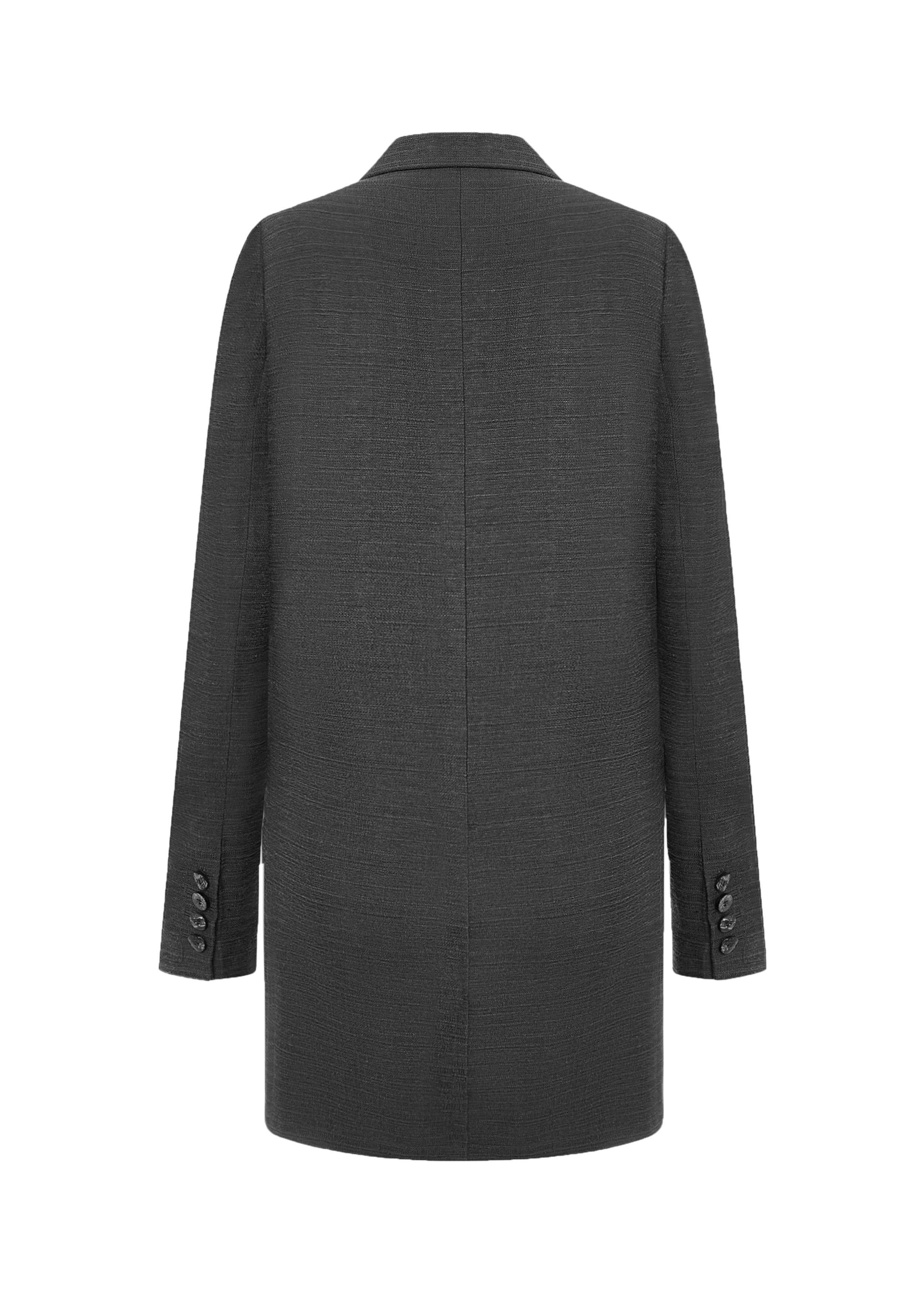 This garment is a long-line blazer featuring a two-button front closure and notched lapels. It includes two flap pockets positioned on the front. The fabric has a textured finish.