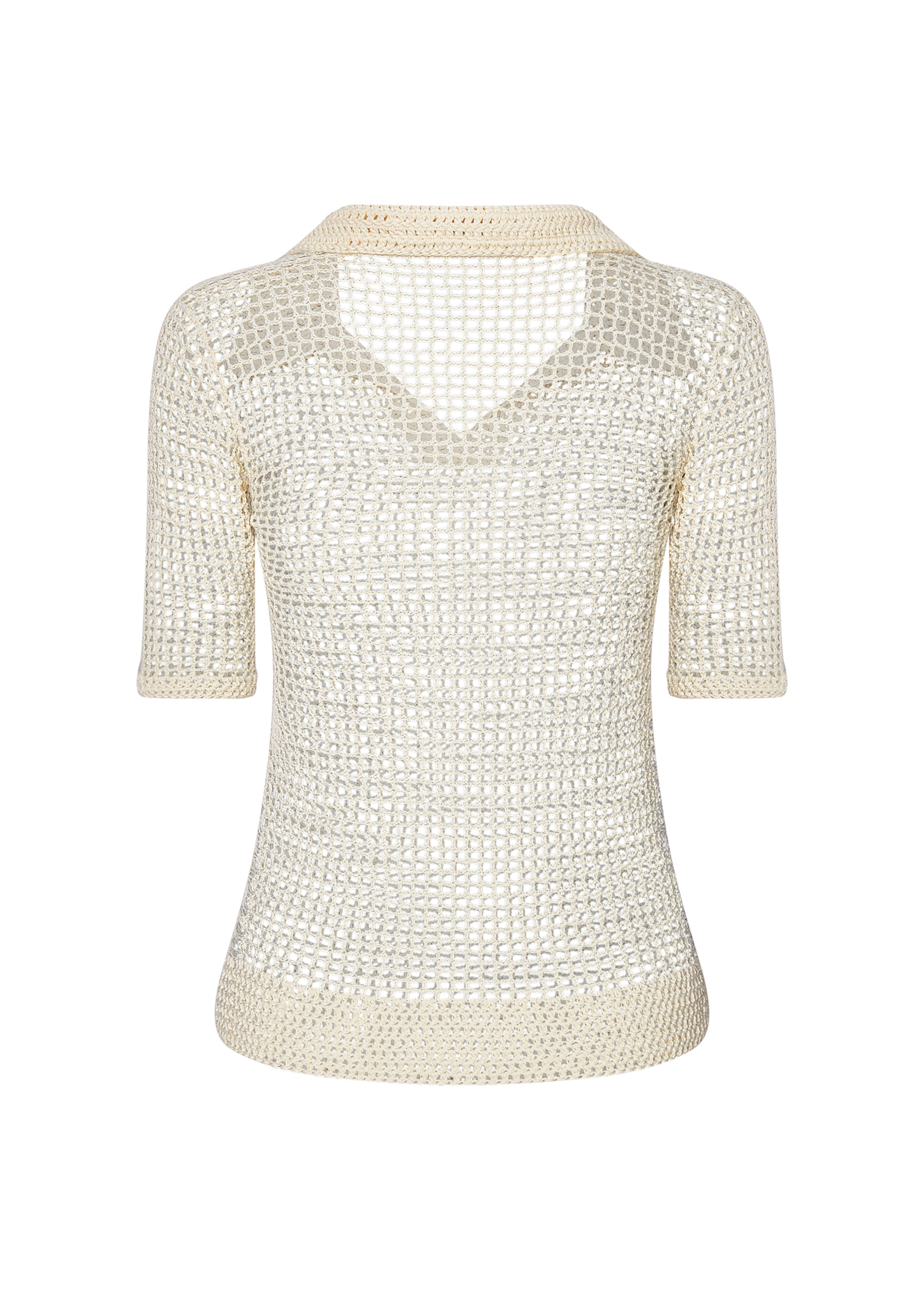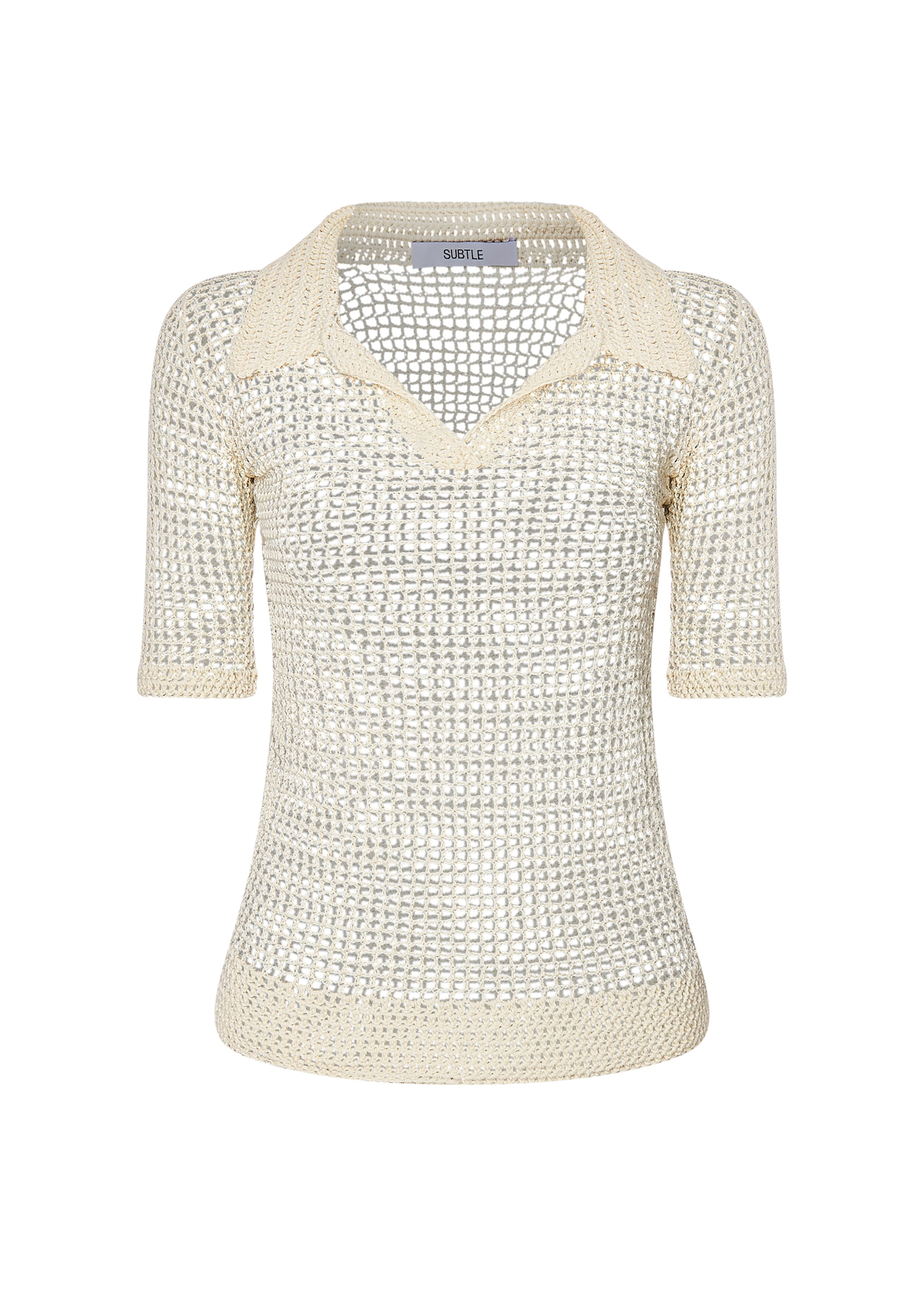 This garment is a crochet knit polo shirt. It features an open V-neck polo collar and half-length sleeves. The cuffs and hem are finished with a ribbed knit. The overall construction displays an open, breathable knit pattern.