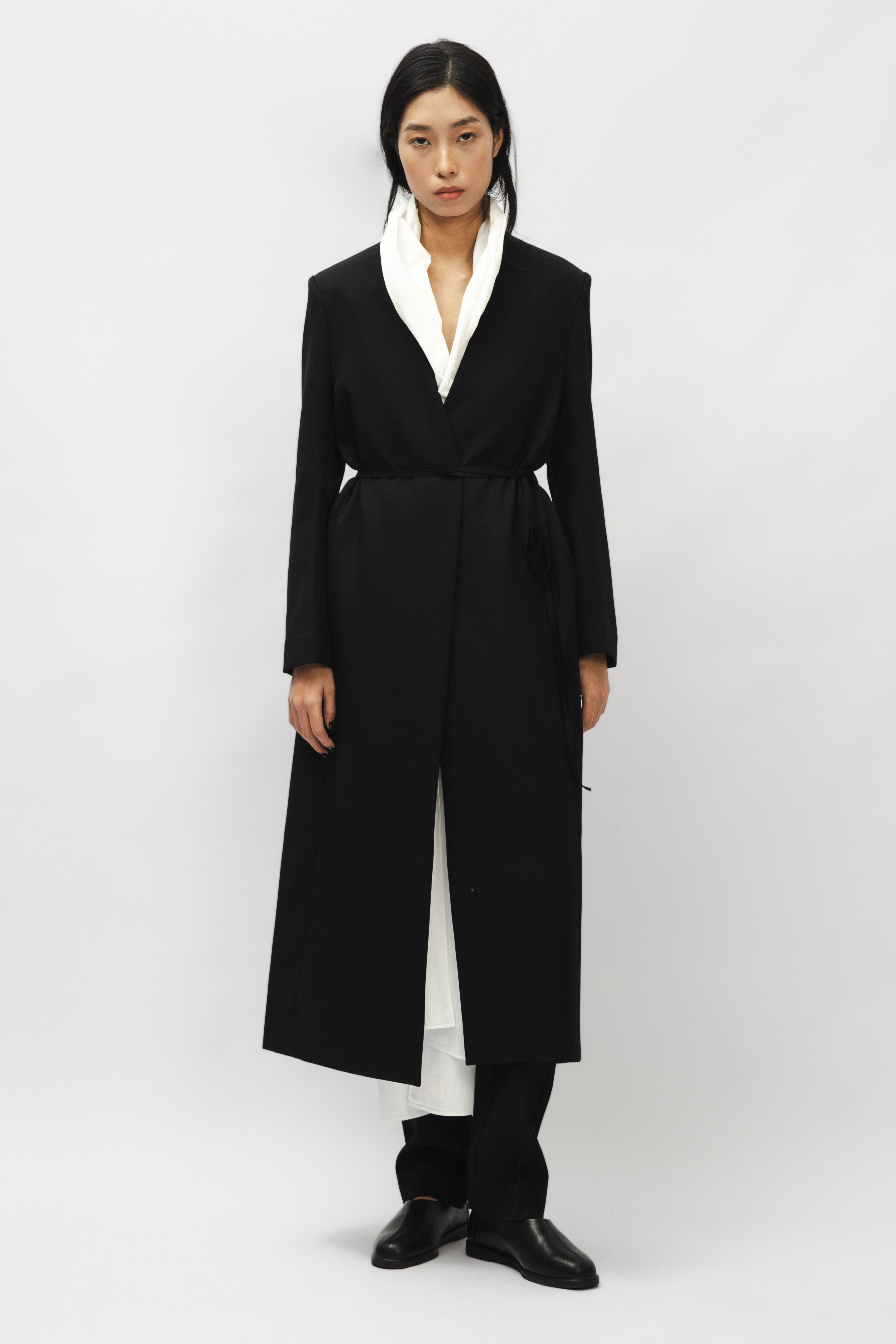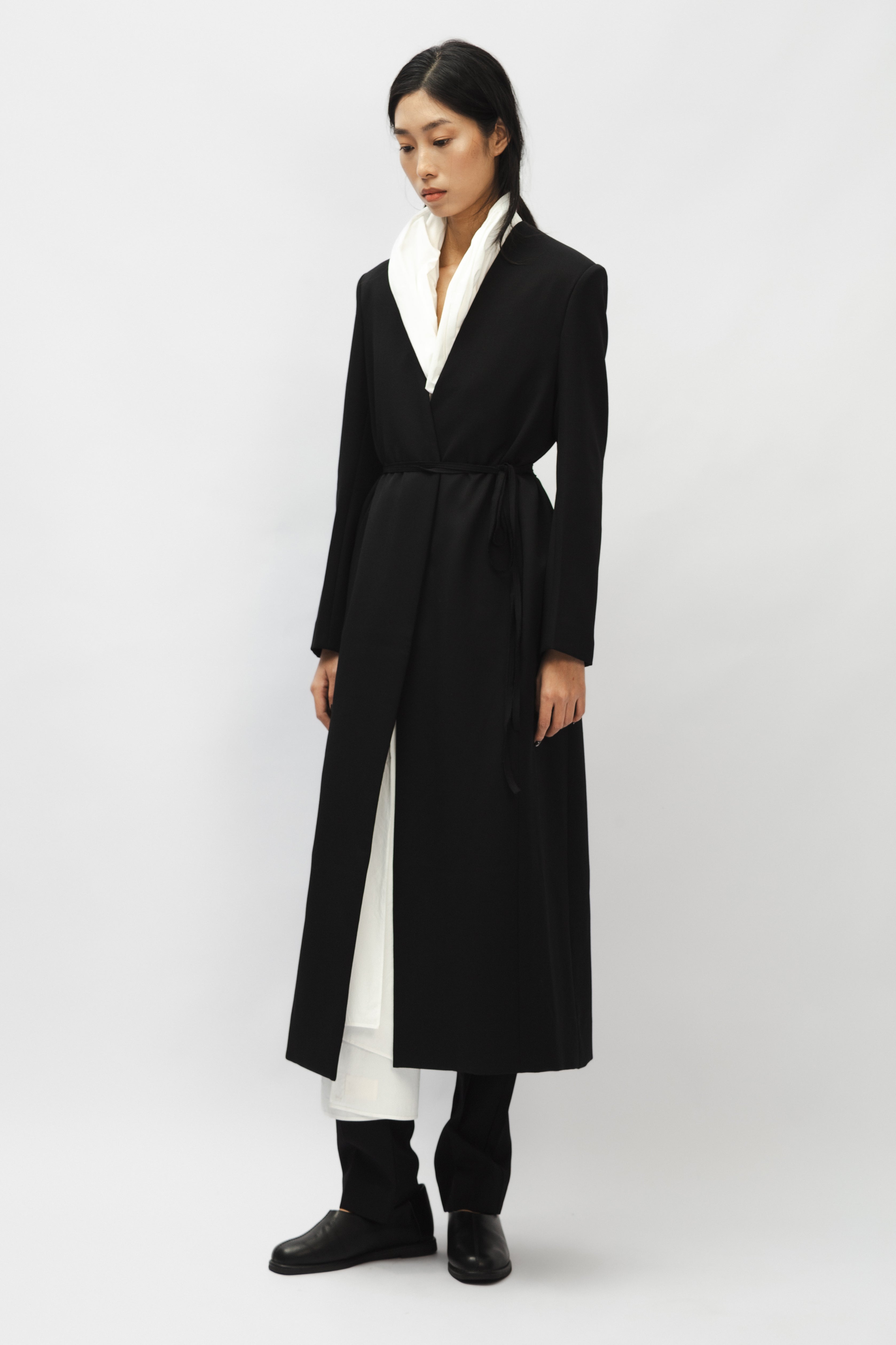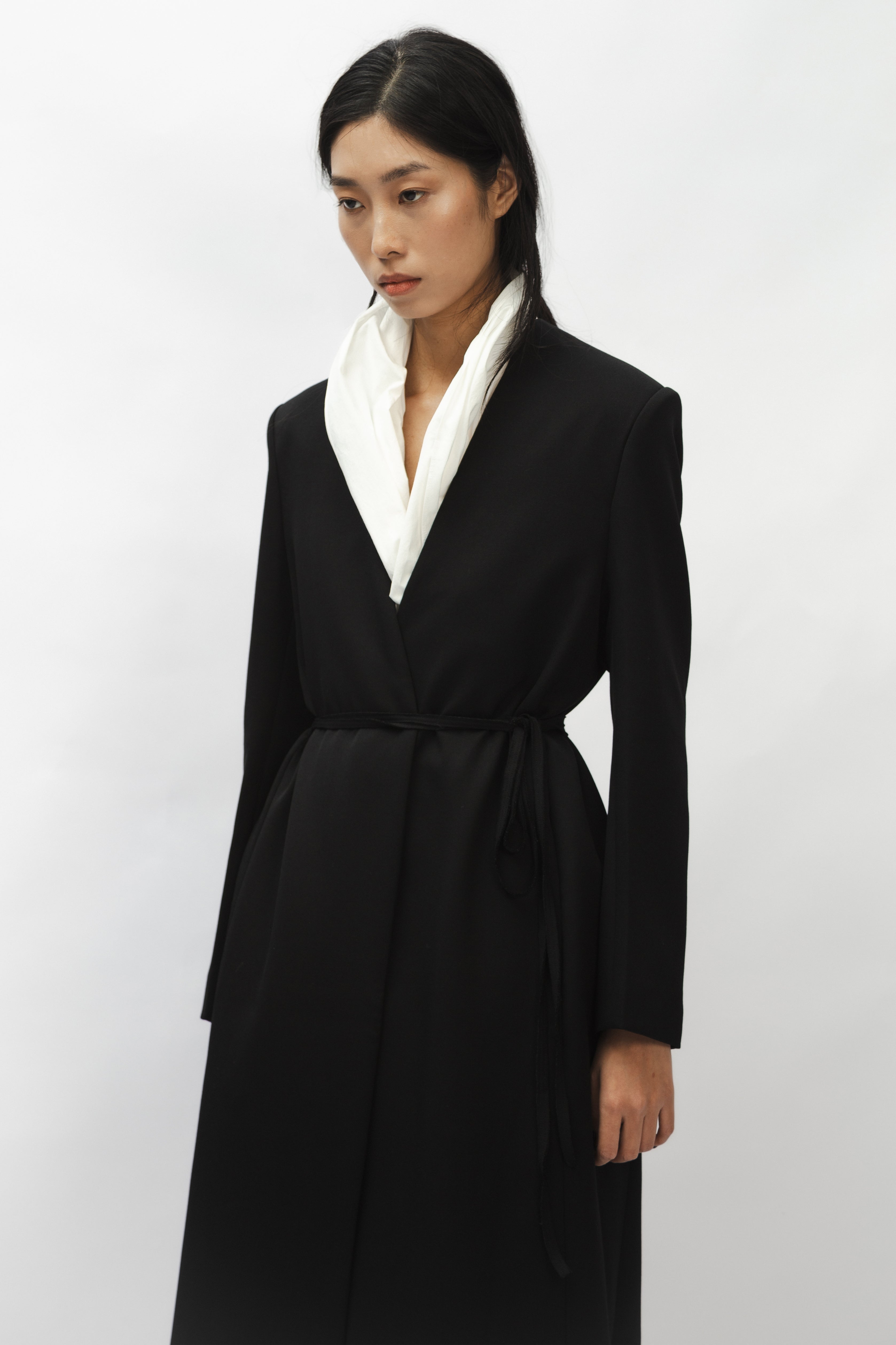 This garment is a tailored coat, presented in black with a straight, long-sleeved silhouette. It features a collarless V-neckline. A separate white scarf is included, designed to be detachable and styled with the coat.