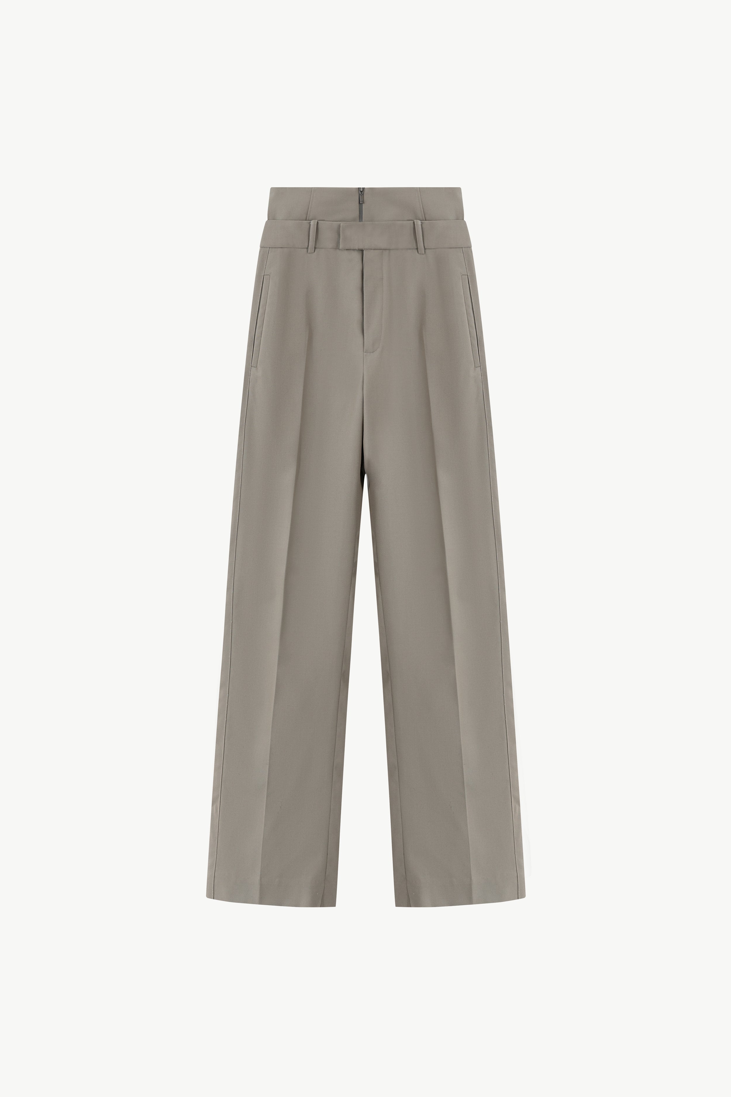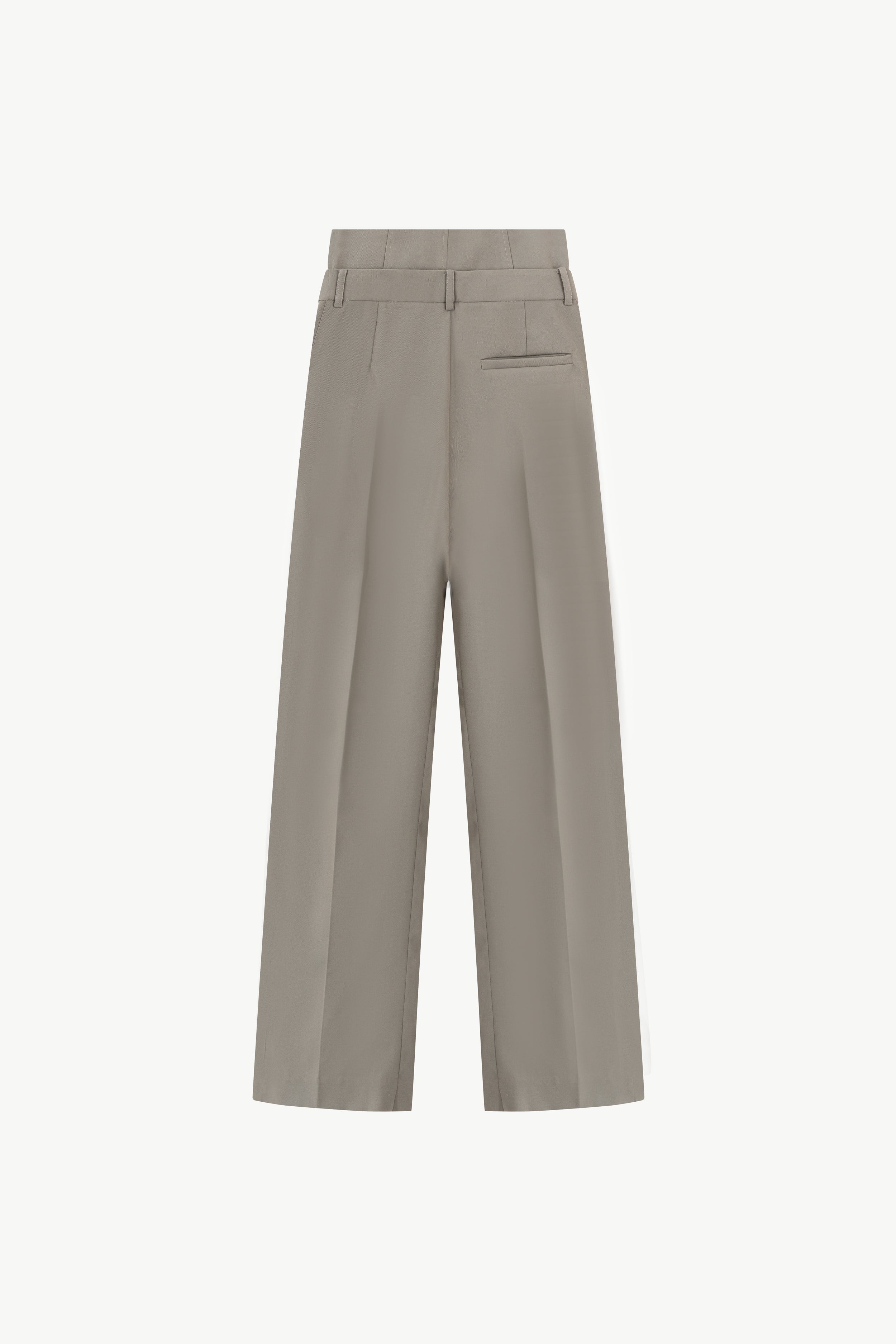 These trousers are constructed with a double waistband and a concealed front closure. They feature a wide-leg cut with permanent front pleats on each leg, and belt loops are integrated into the waistband. Two side pockets are present. The garment is grey.