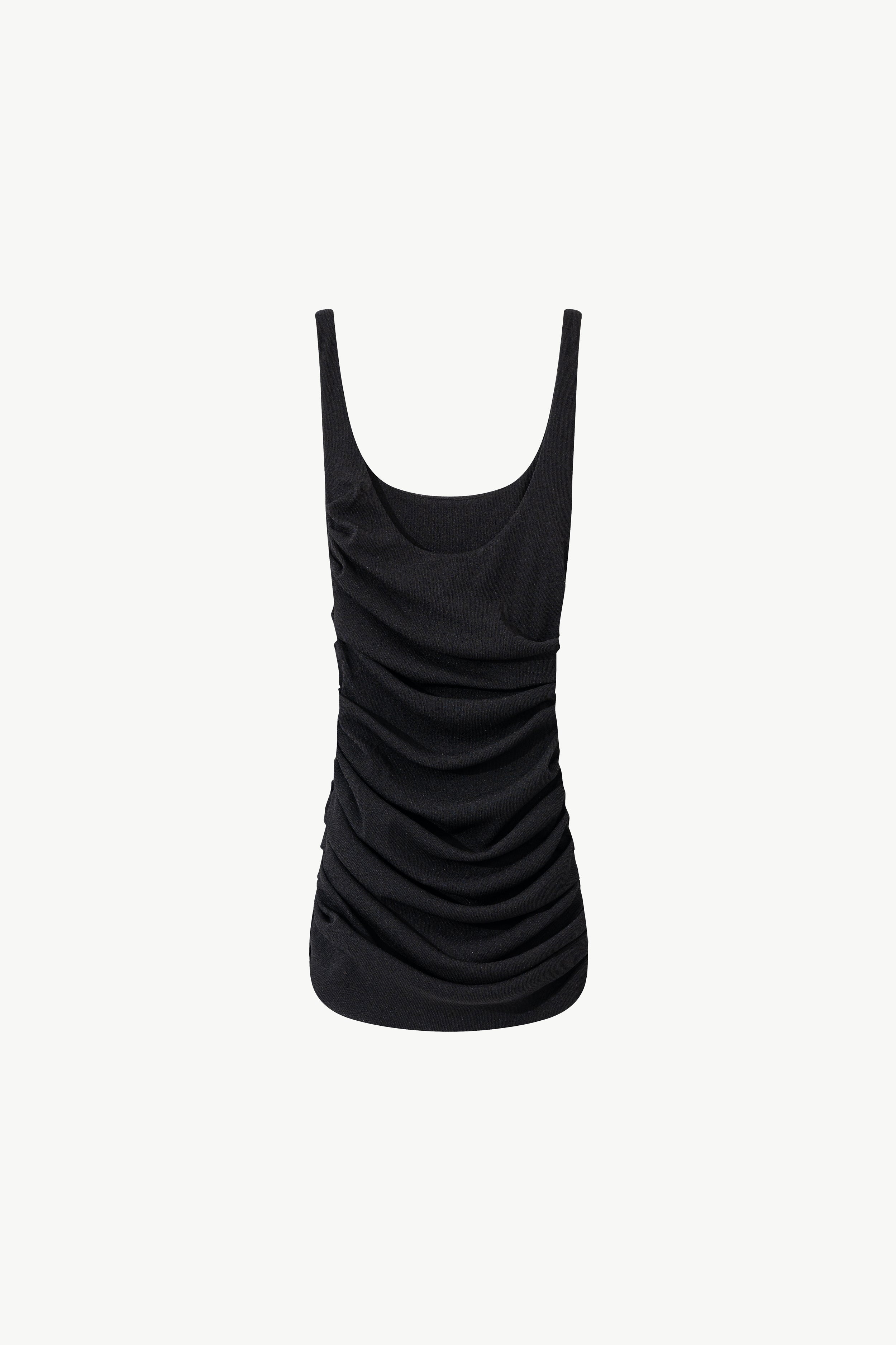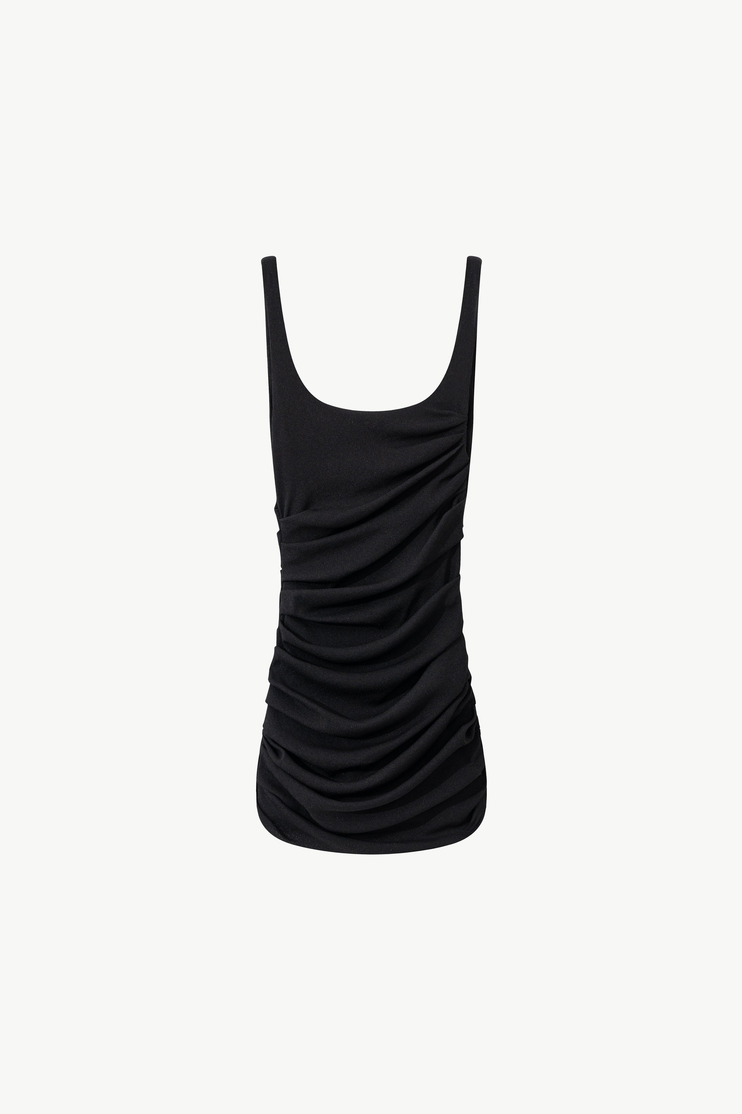 The Draped Slim Tank Top is a sleeveless garment featuring wide shoulder straps and a square neckline. Its body is characterized by significant ruching and draping along the front and back, creating texture and a contoured shape. The top is designed for a slim fit.