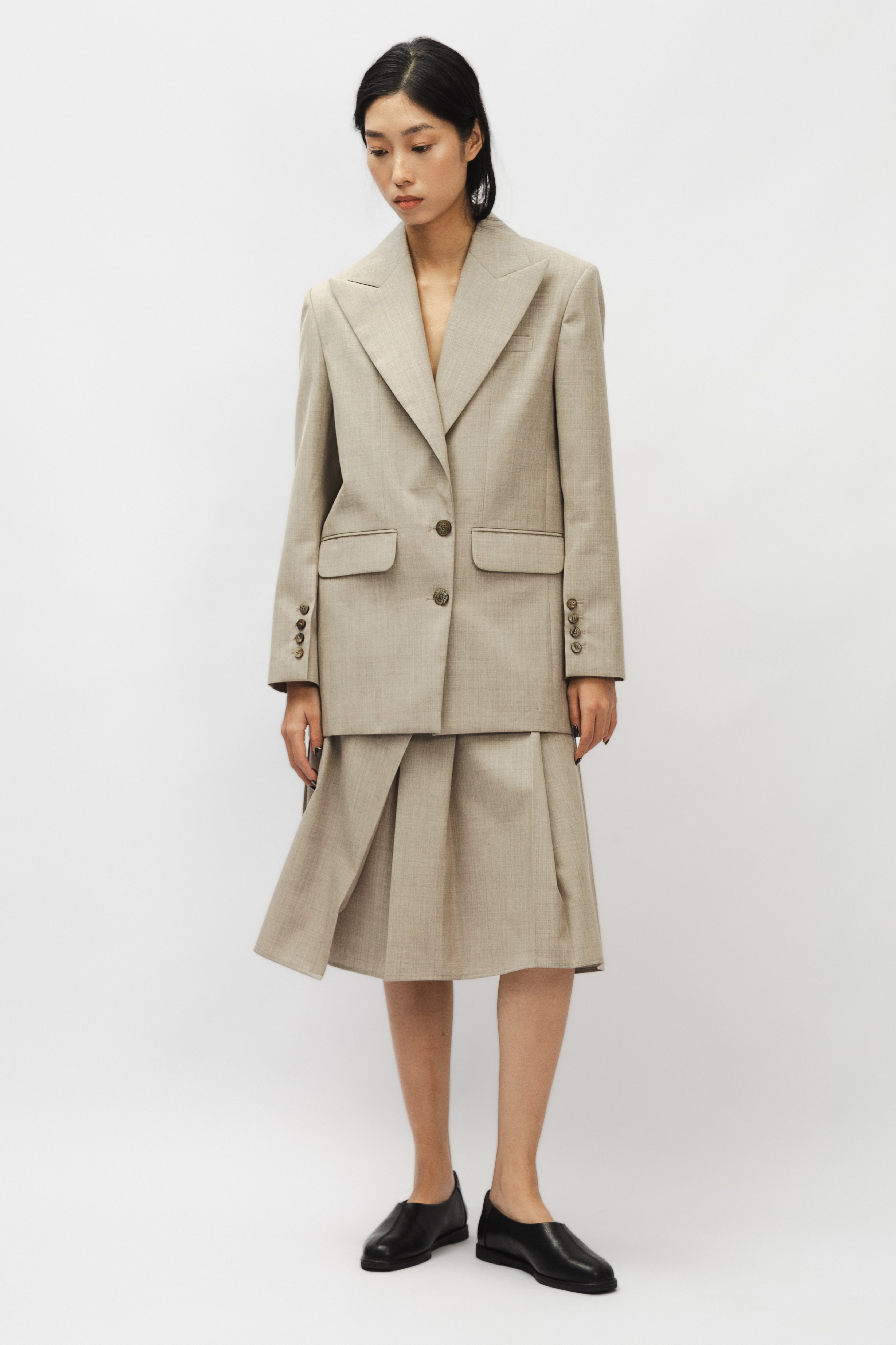 - Notched lapels, two front flap pockets, and three-button cuffs.