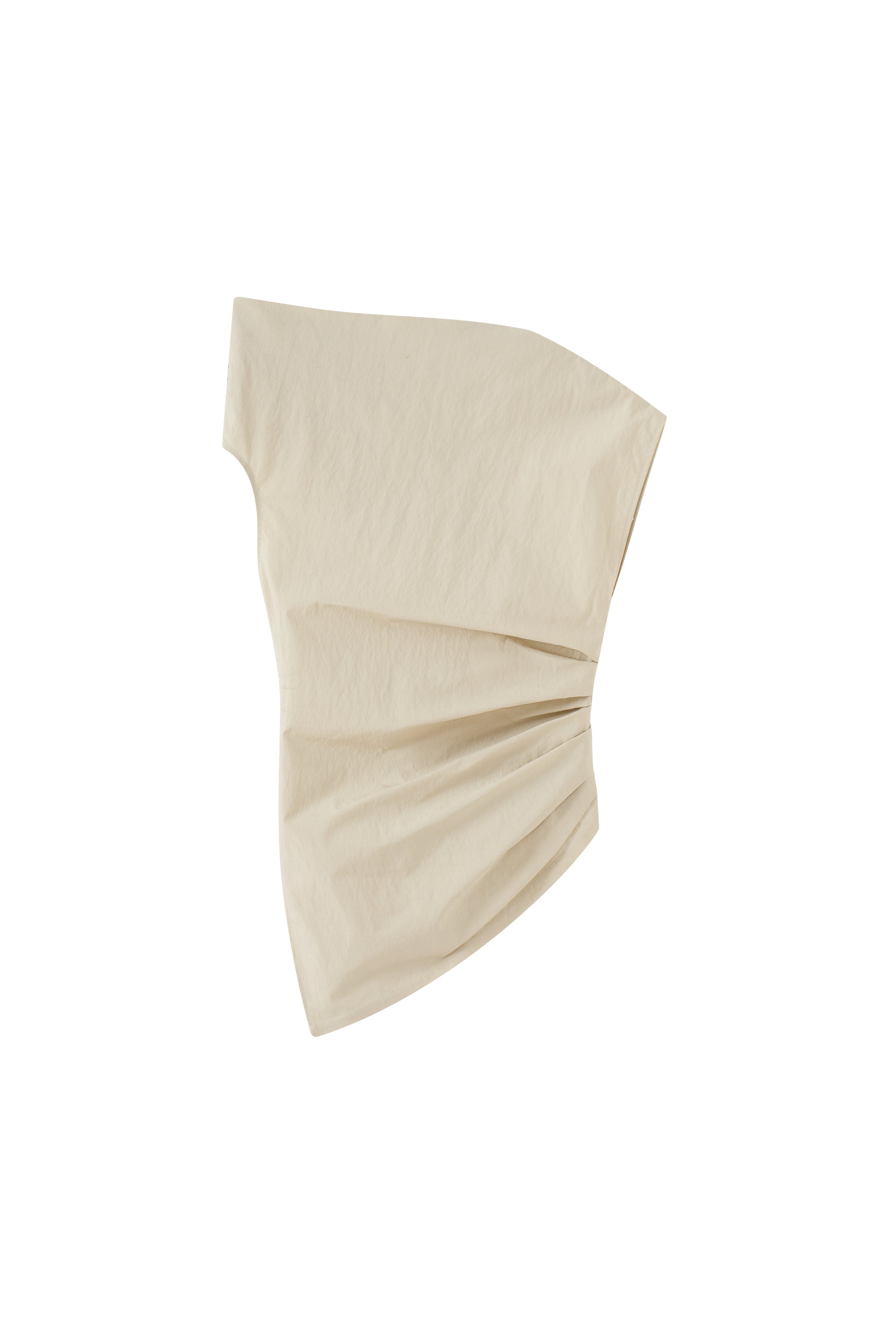 - High neckline. - Sleeveless construction. - Asymmetrical ruching detail on one side.