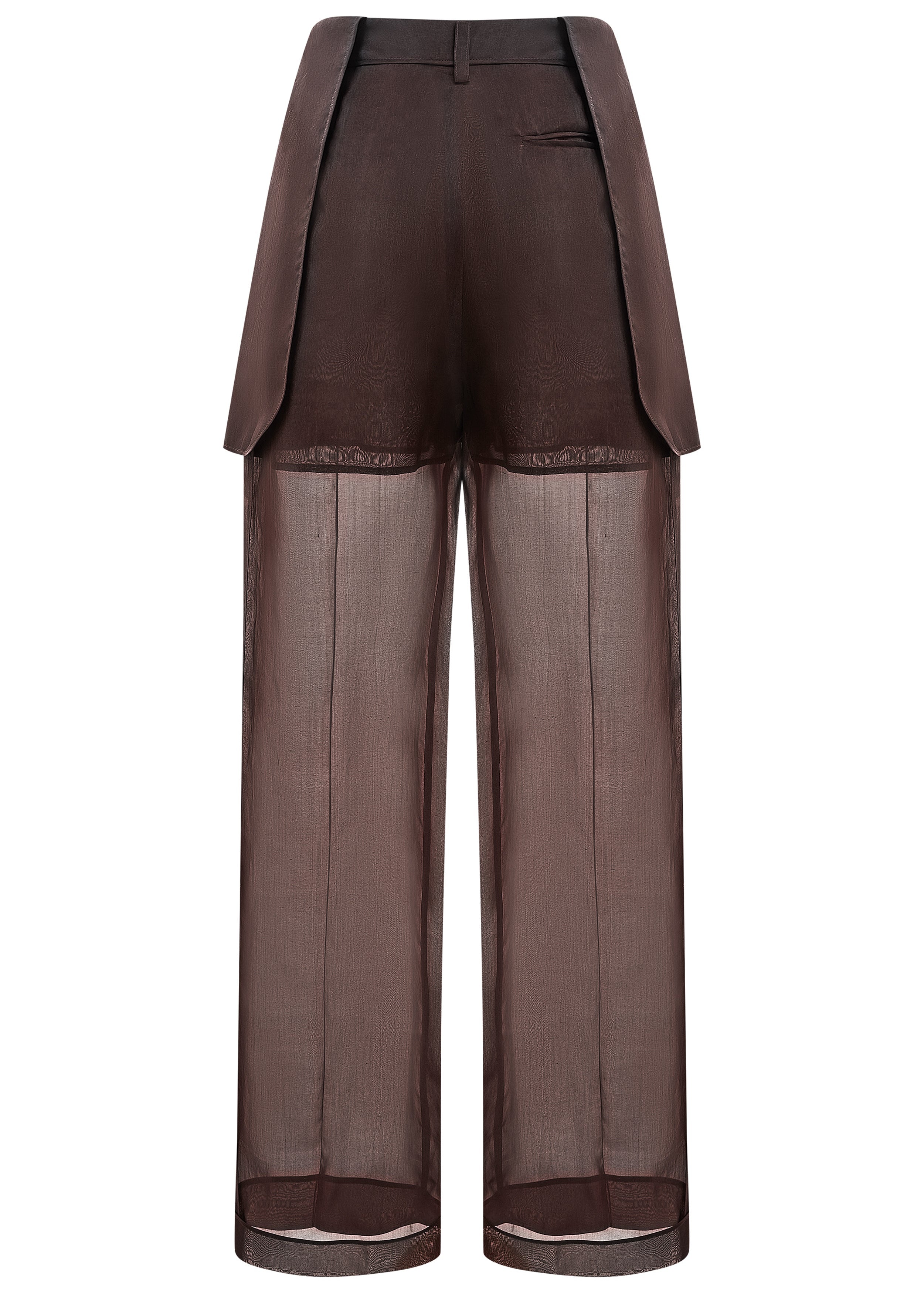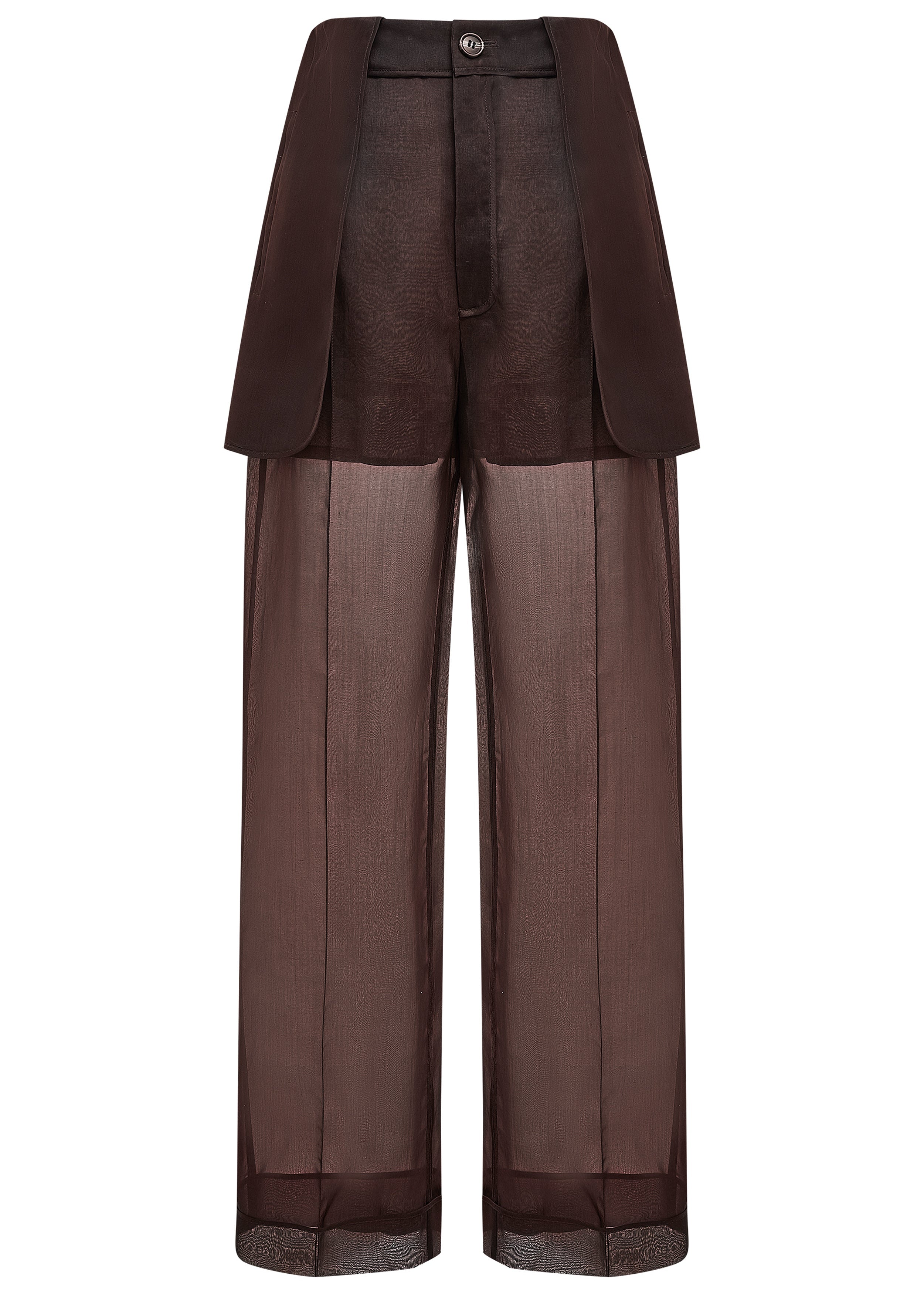 This garment consists of a high-waisted, tailored shorts component layered over a pair of transparent, wide-leg trousers. The shorts are secured with a single button and zipper fly at the front. The transparent fabric extends from below the shorts, creating a full-length, wide-leg silhouette.