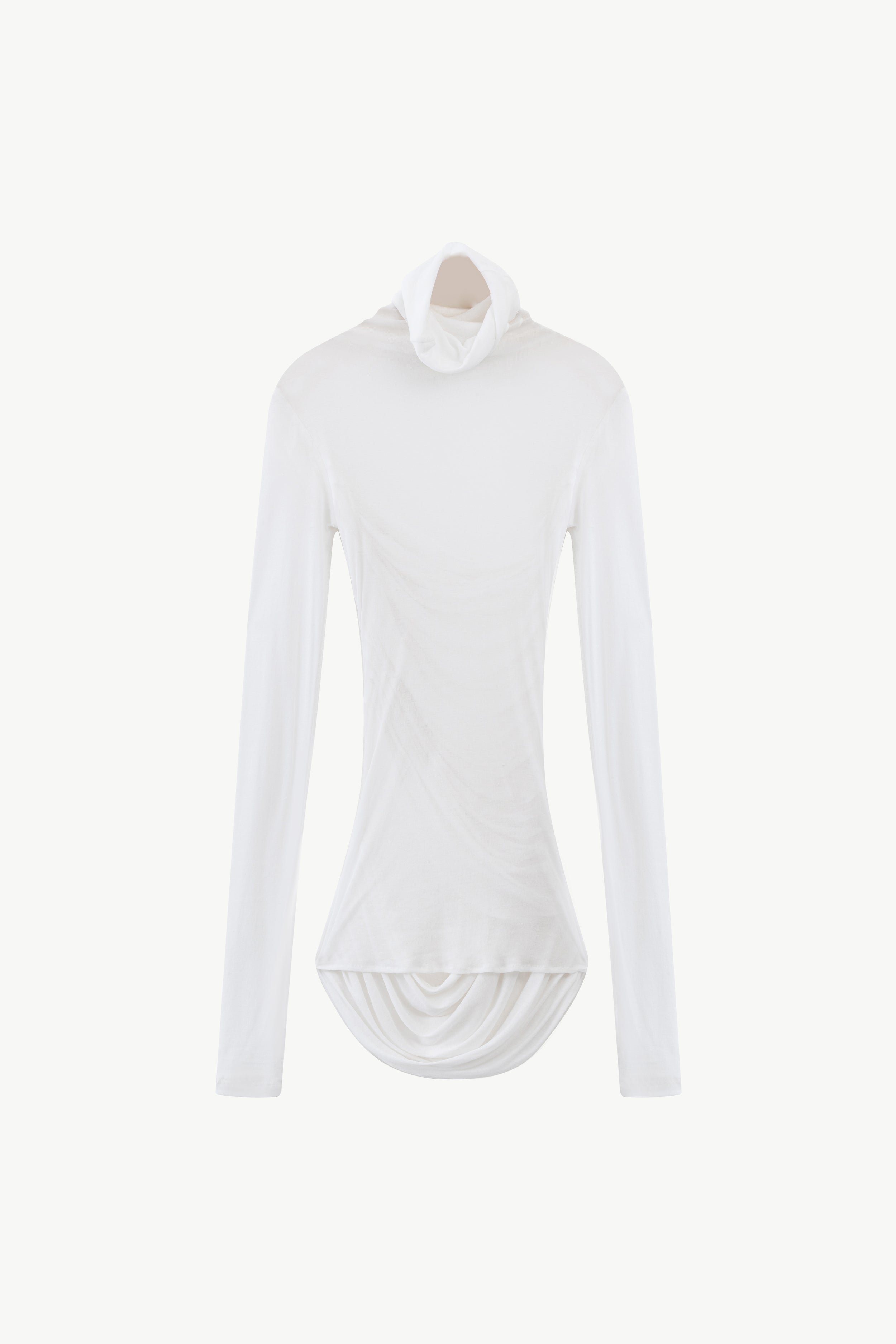This is a white, sheer, long-sleeved top with a turtleneck collar. The lower section of the garment features an inverse draped hem, creating a gathered finish.