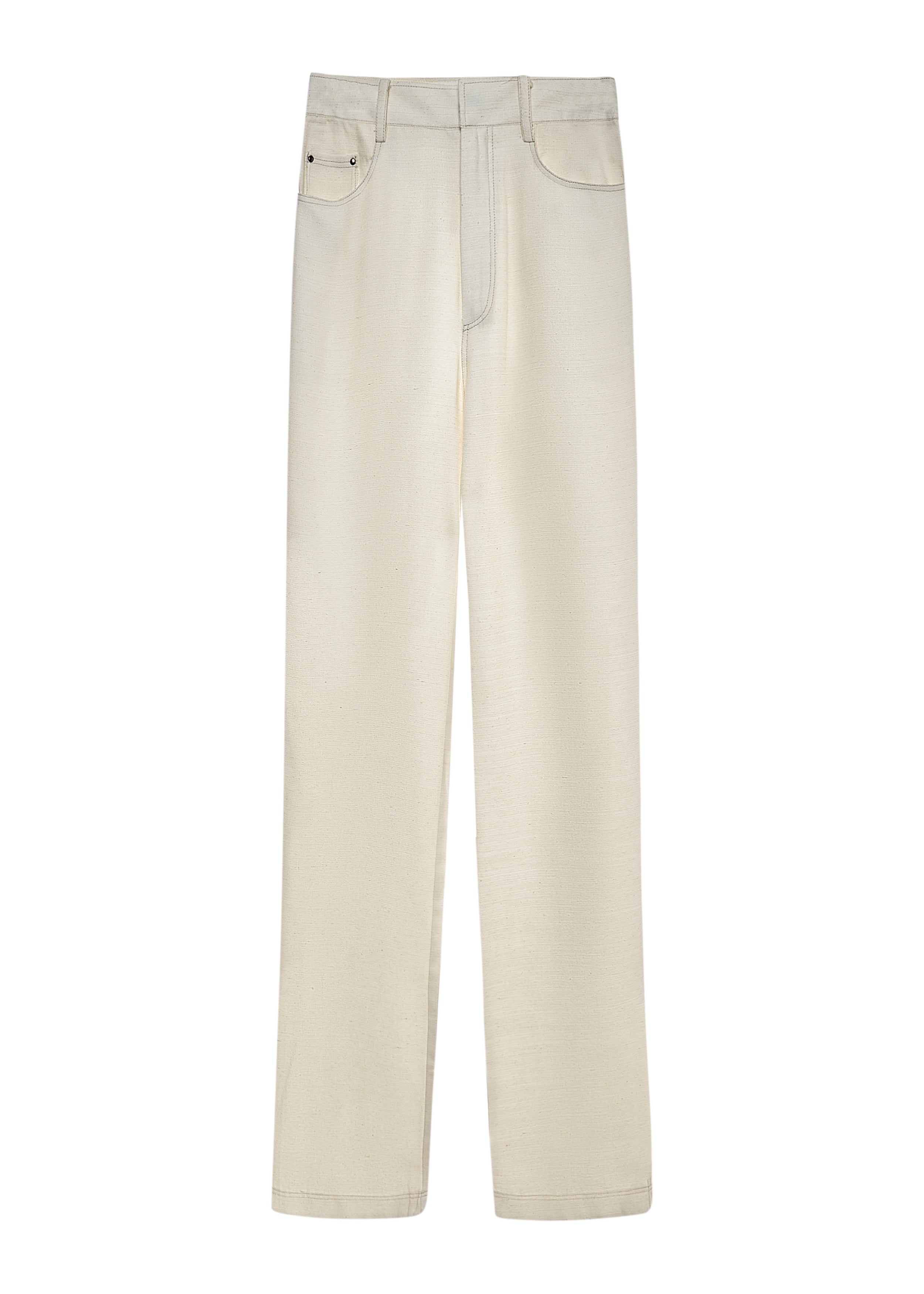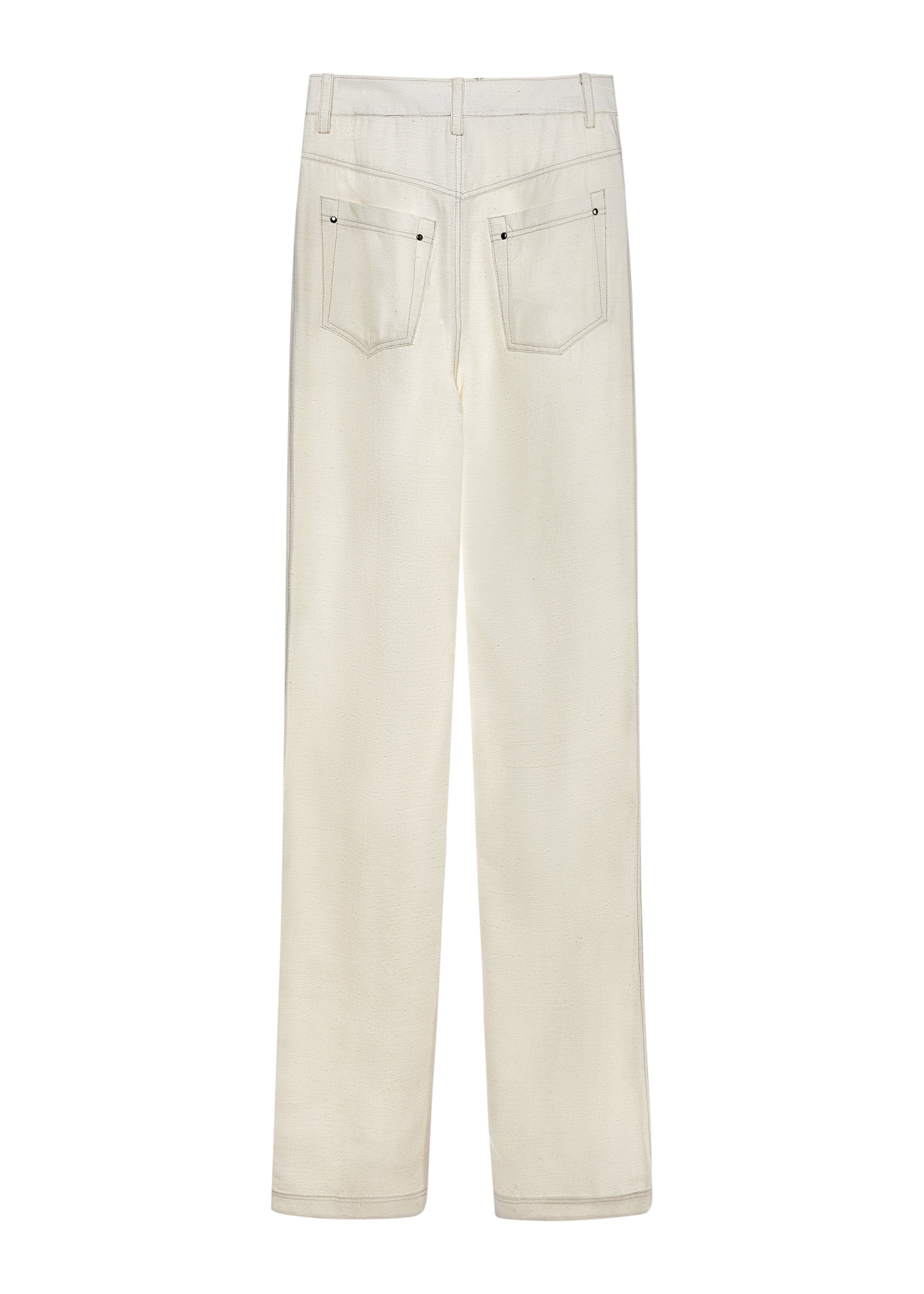 These trousers are constructed in a classic jeans style, featuring a straight-leg cut. They include five functional pockets: two at the front, one small coin pocket, and two patch pockets on the rear. The waist is secured with a button and zip fly closure. Contrast stitching highlights the garment's construction and pocket detailing.