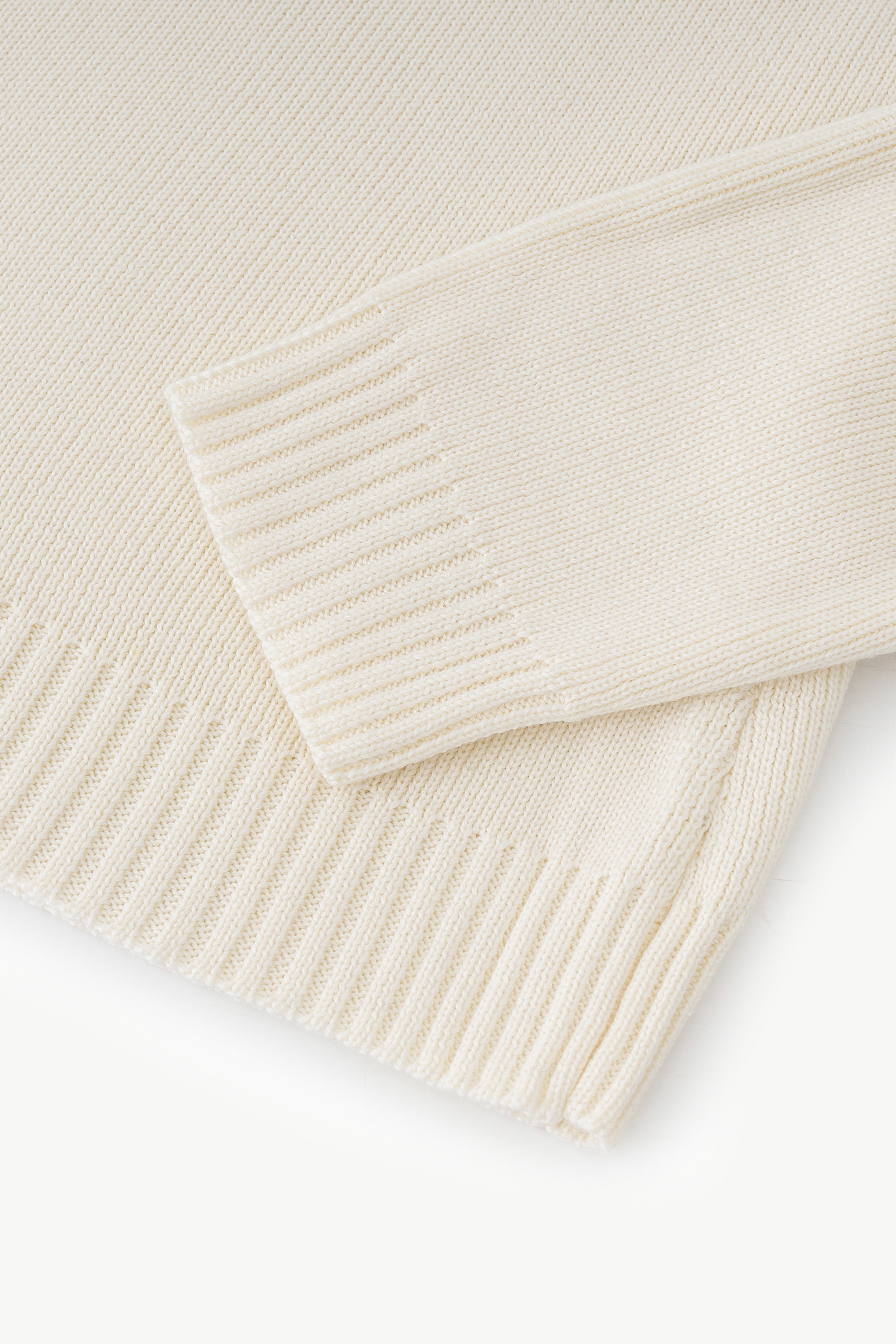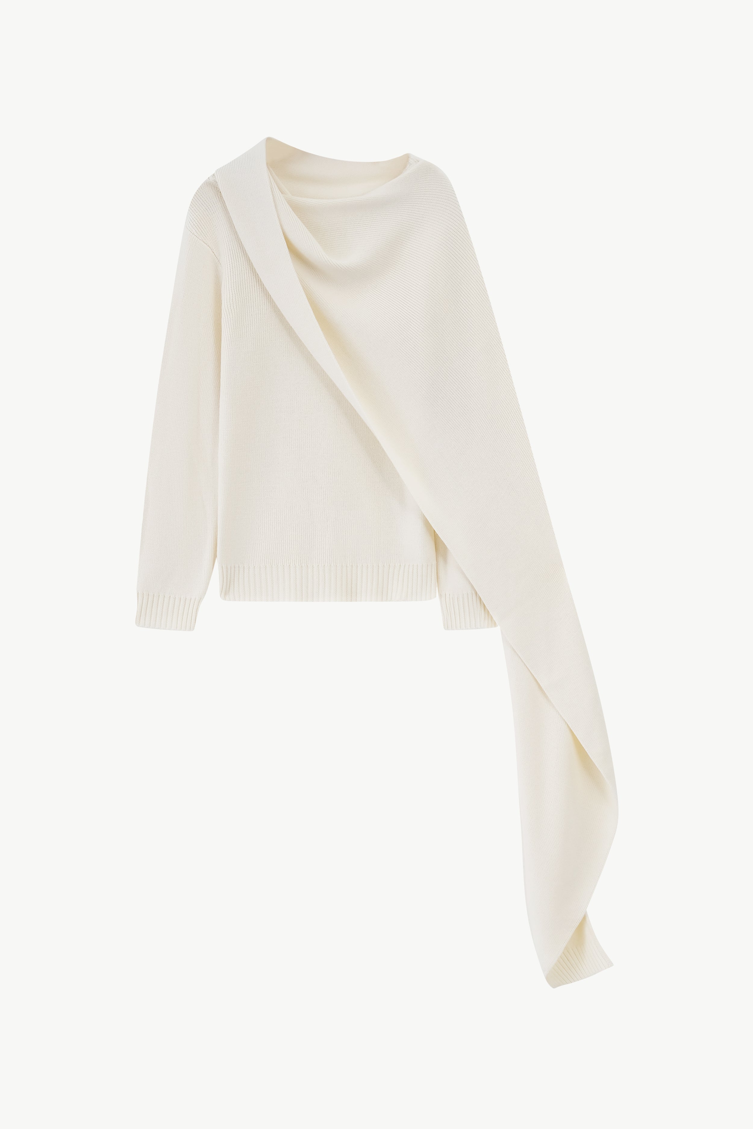 This knit sweater in off-white features an integrated scarf detail that extends from the neckline. The garment includes long sleeves with ribbed cuffs and a ribbed hem. The main body of the sweater has a smooth knit construction.
