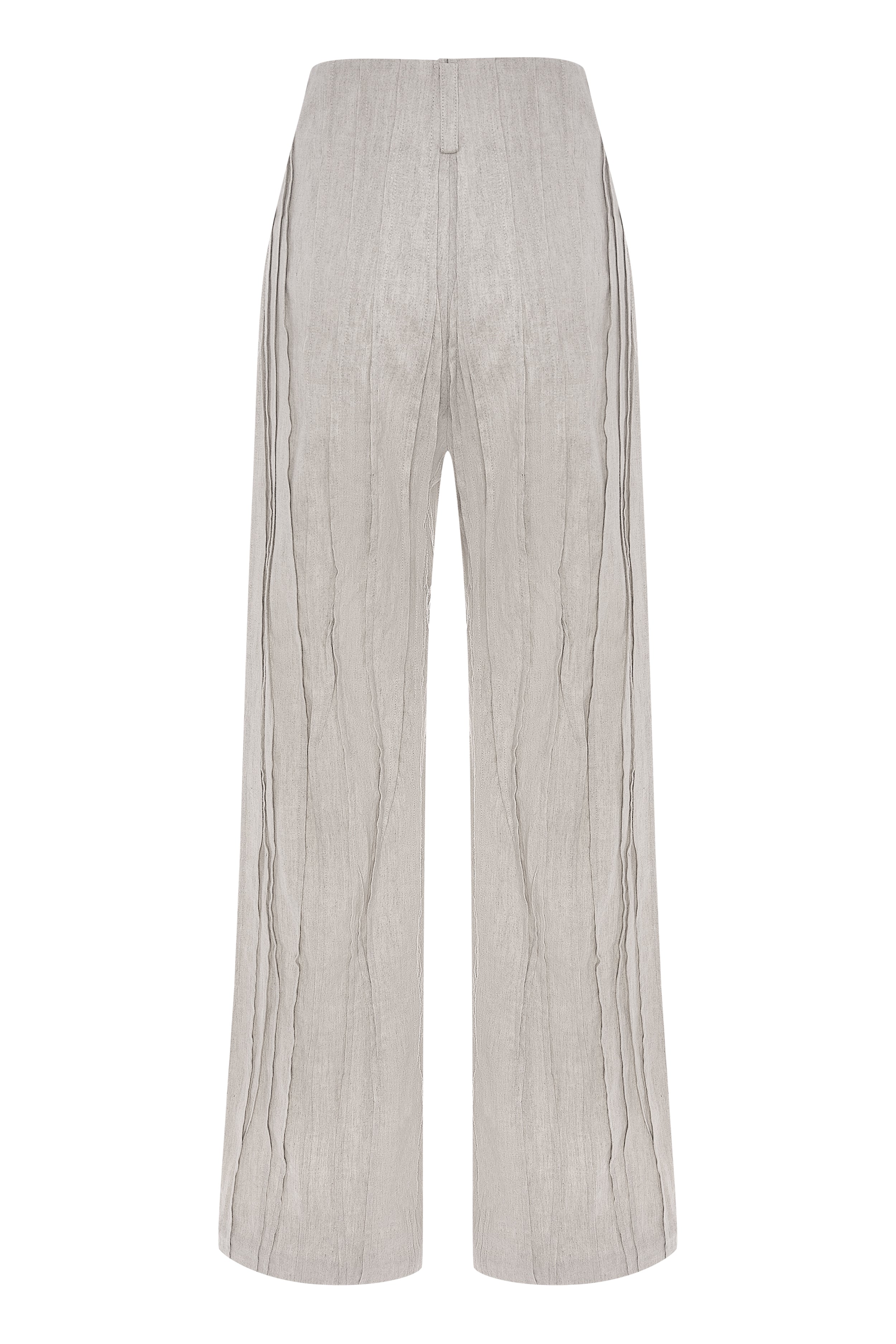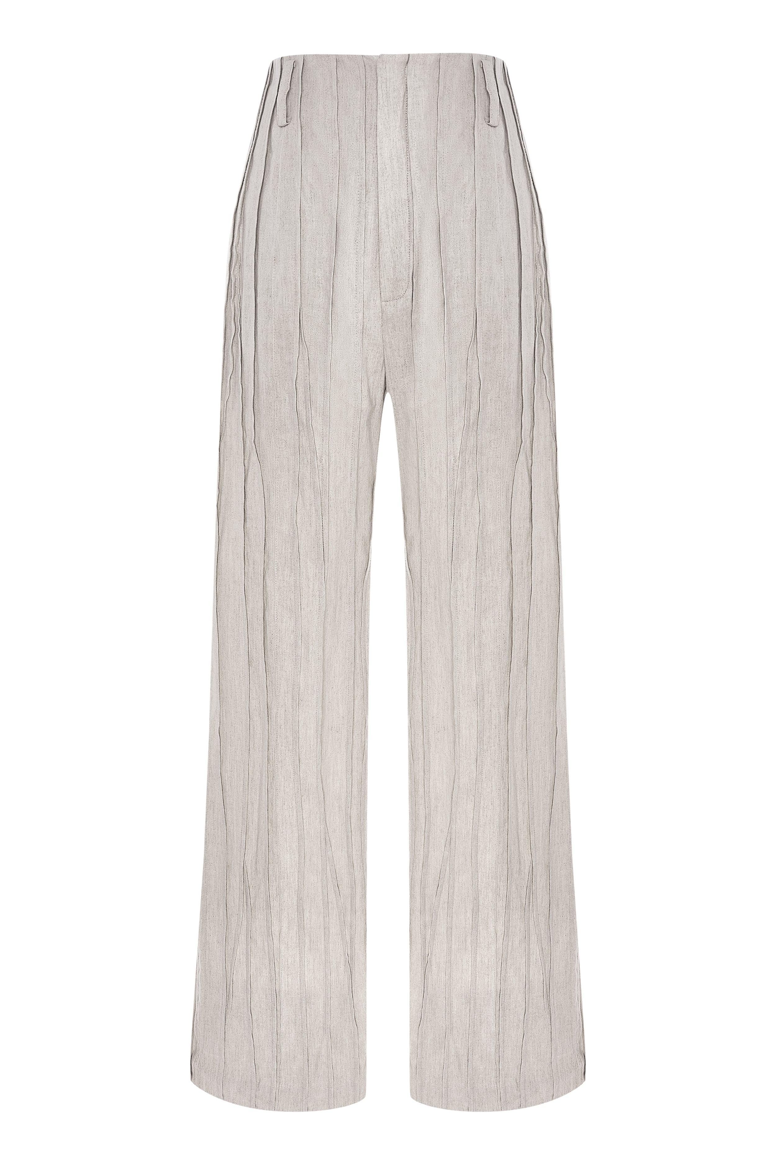 These trousers feature a high-waisted design with a smocked elasticated waistband. The silhouette is wide-leg, complemented by pressed vertical creases that run down the front of each leg, providing a tailored finish.