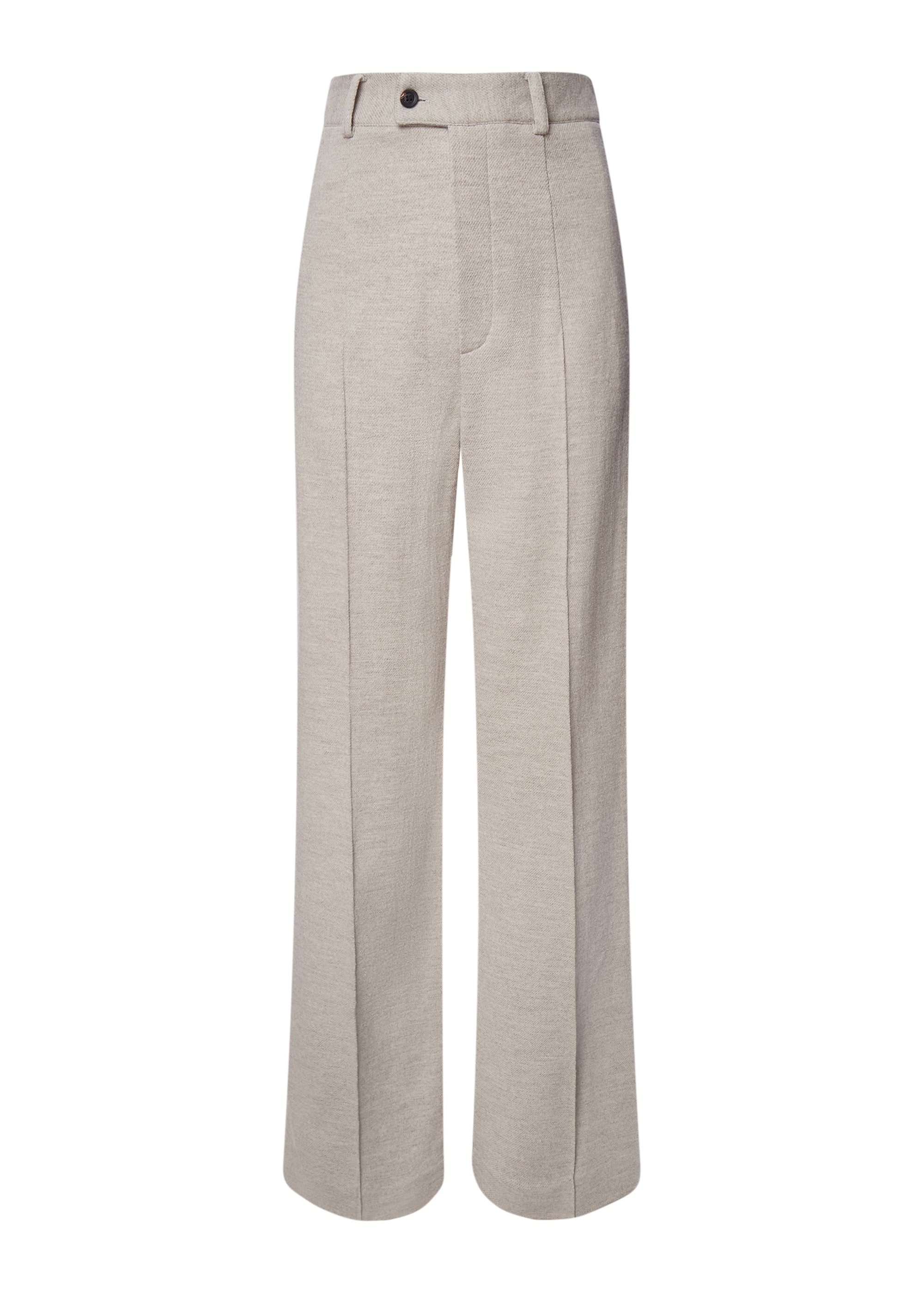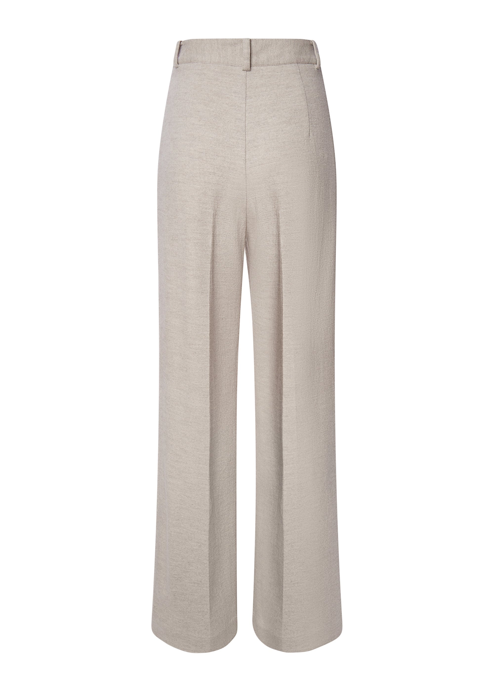 These tailored trousers feature a high-waisted fit and a wide-leg silhouette. Each leg is designed with a prominent crease down the front. The garment includes belt loops and secures with a front zip and a single button closure at the waistband.