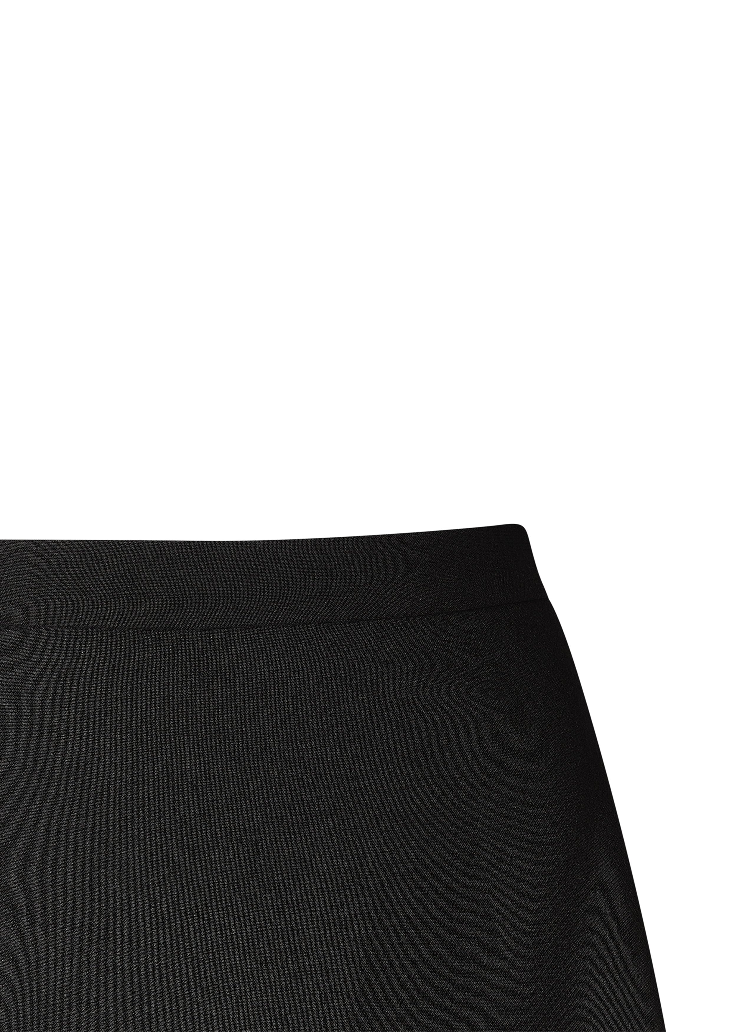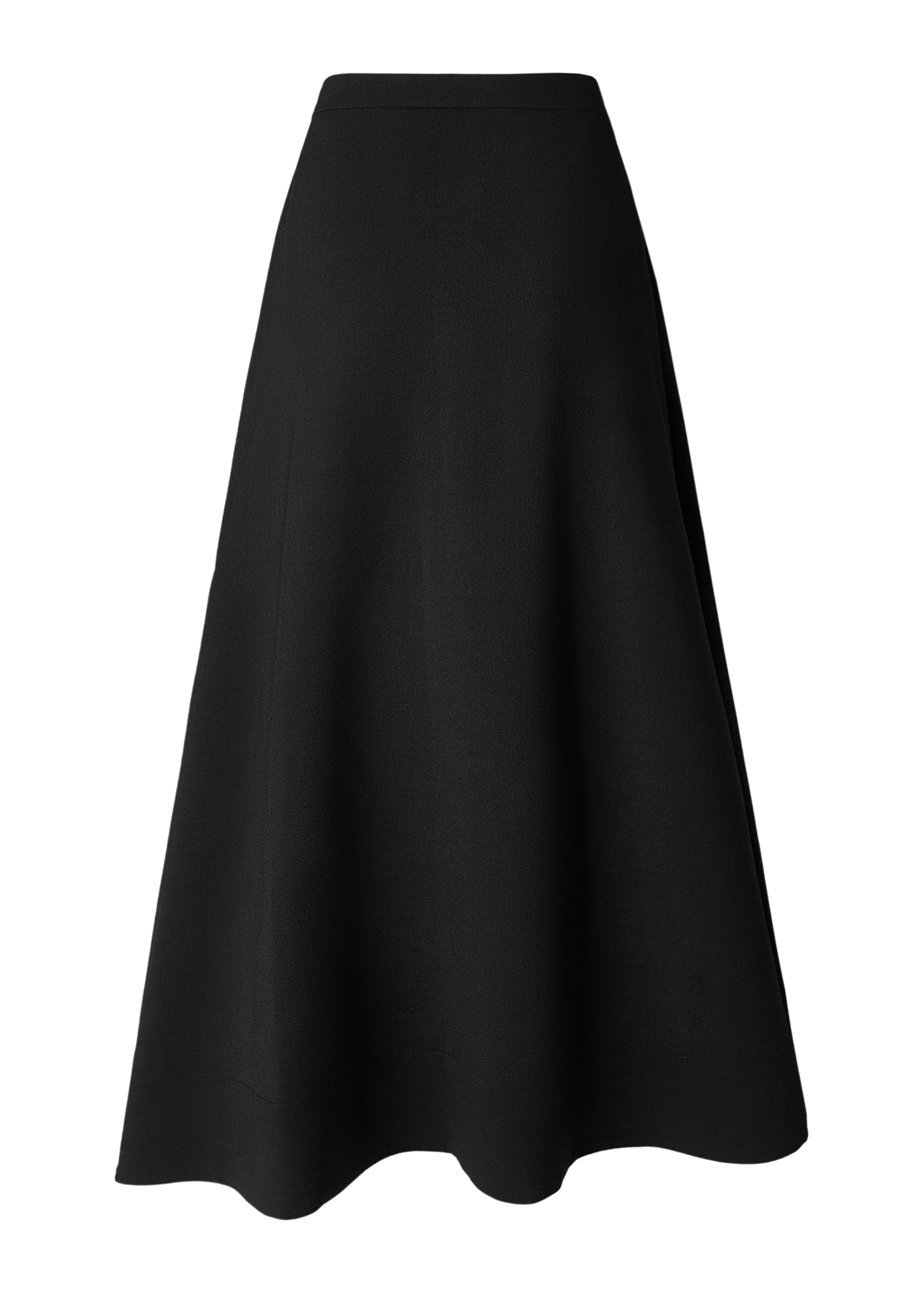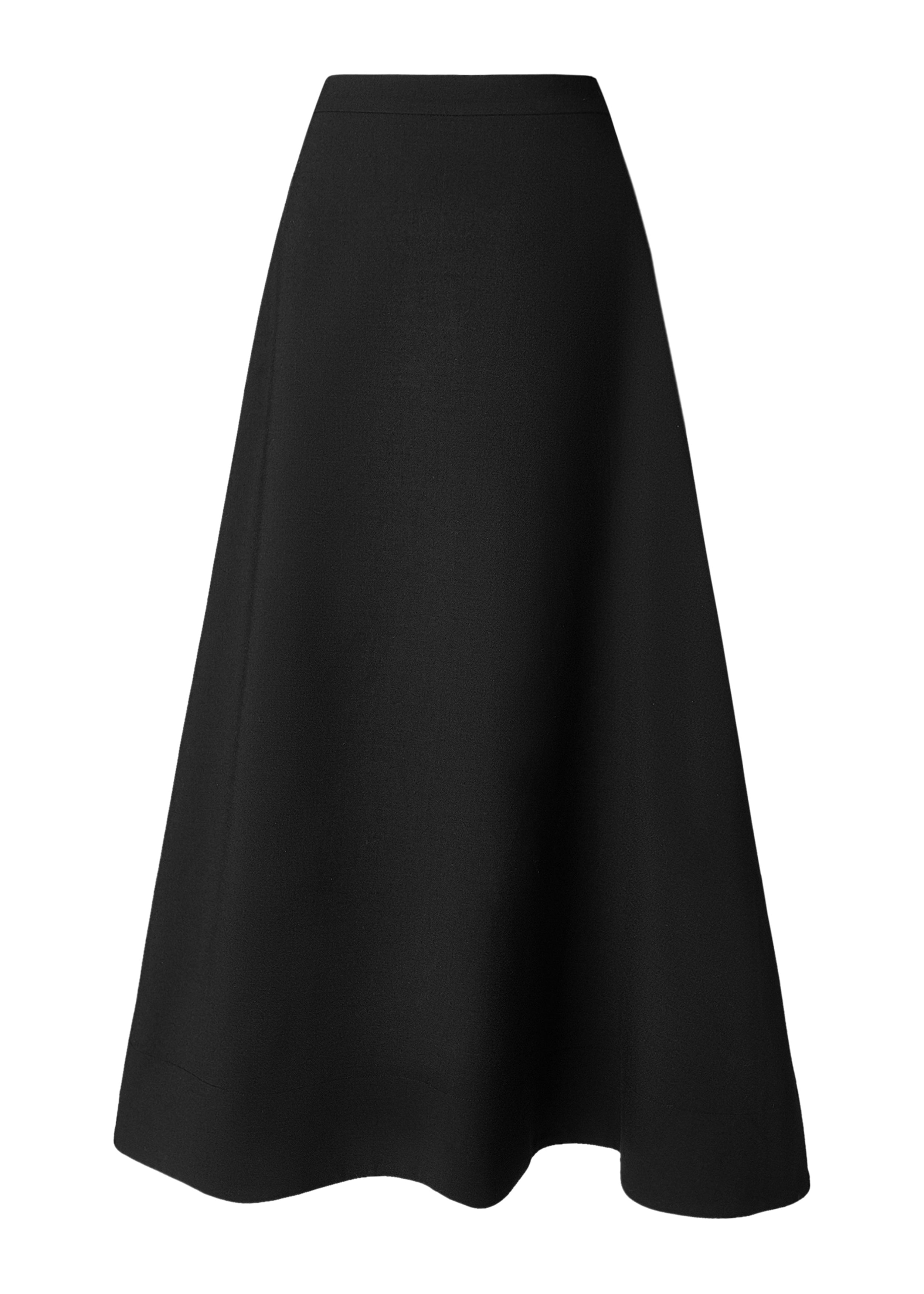 This black skirt is crafted from a wool-blend fabric, designed with a high-waisted fit and an A-line silhouette. It features an asymmetrical cut and extends to a maxi length, concluding with a flared hem.