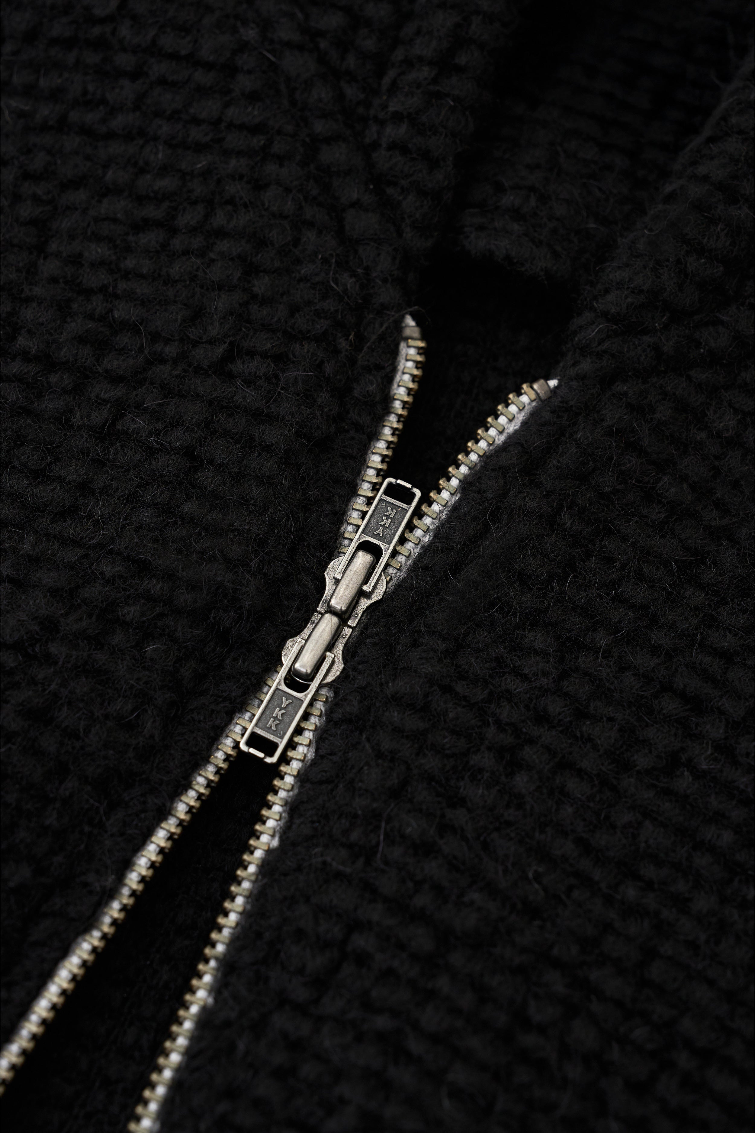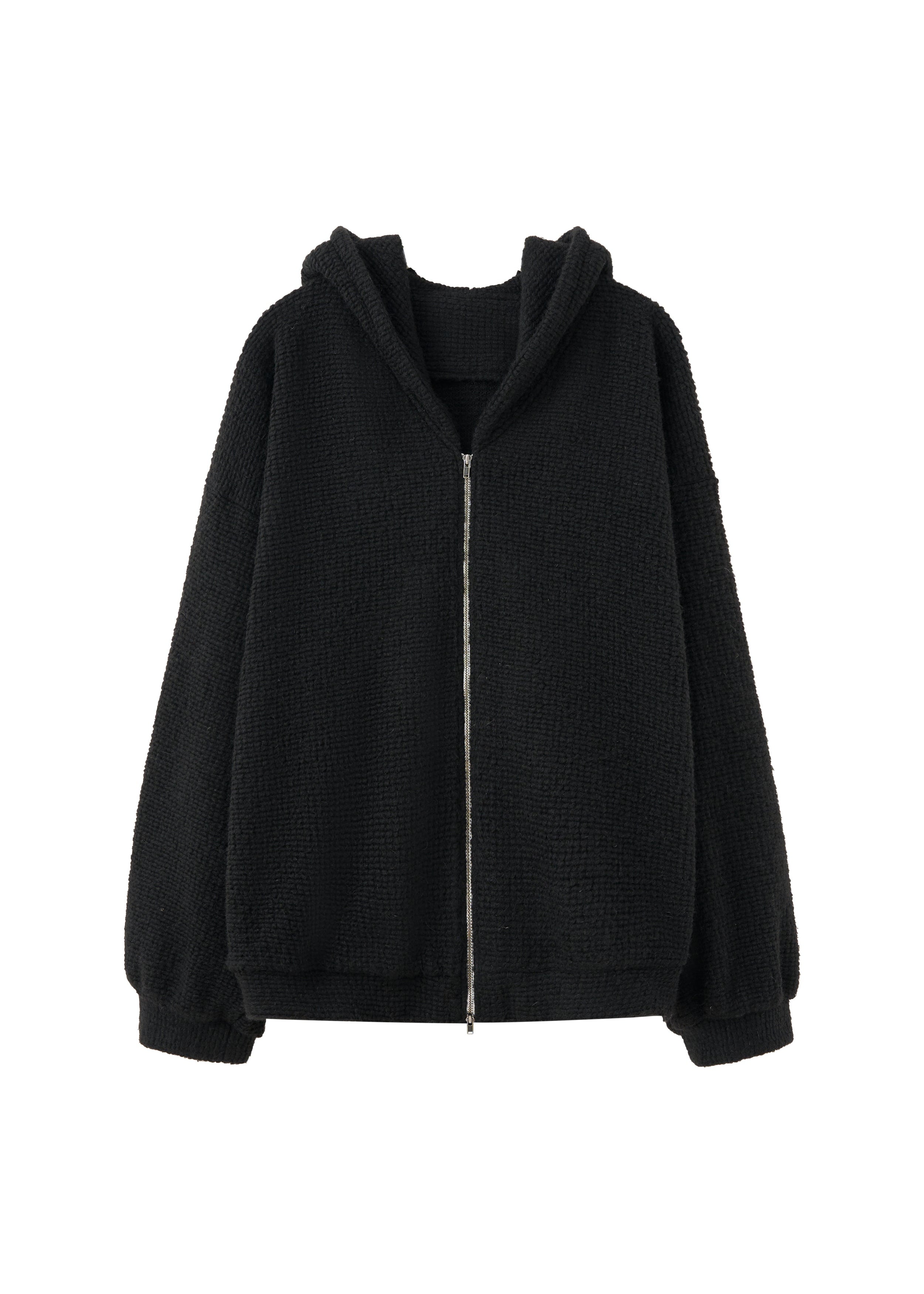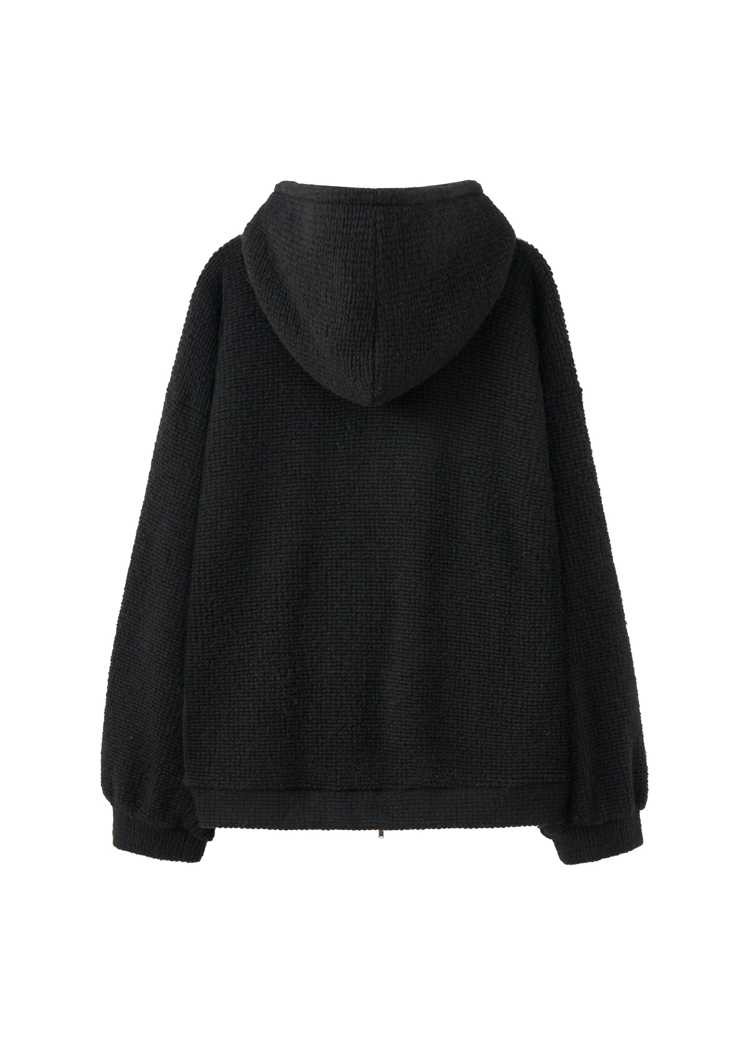 This garment is a black wool-textured hoodie featuring a full-zip front closure. It includes an attached hood and is finished with ribbed cuffs and a ribbed hem. The design offers a relaxed fit.