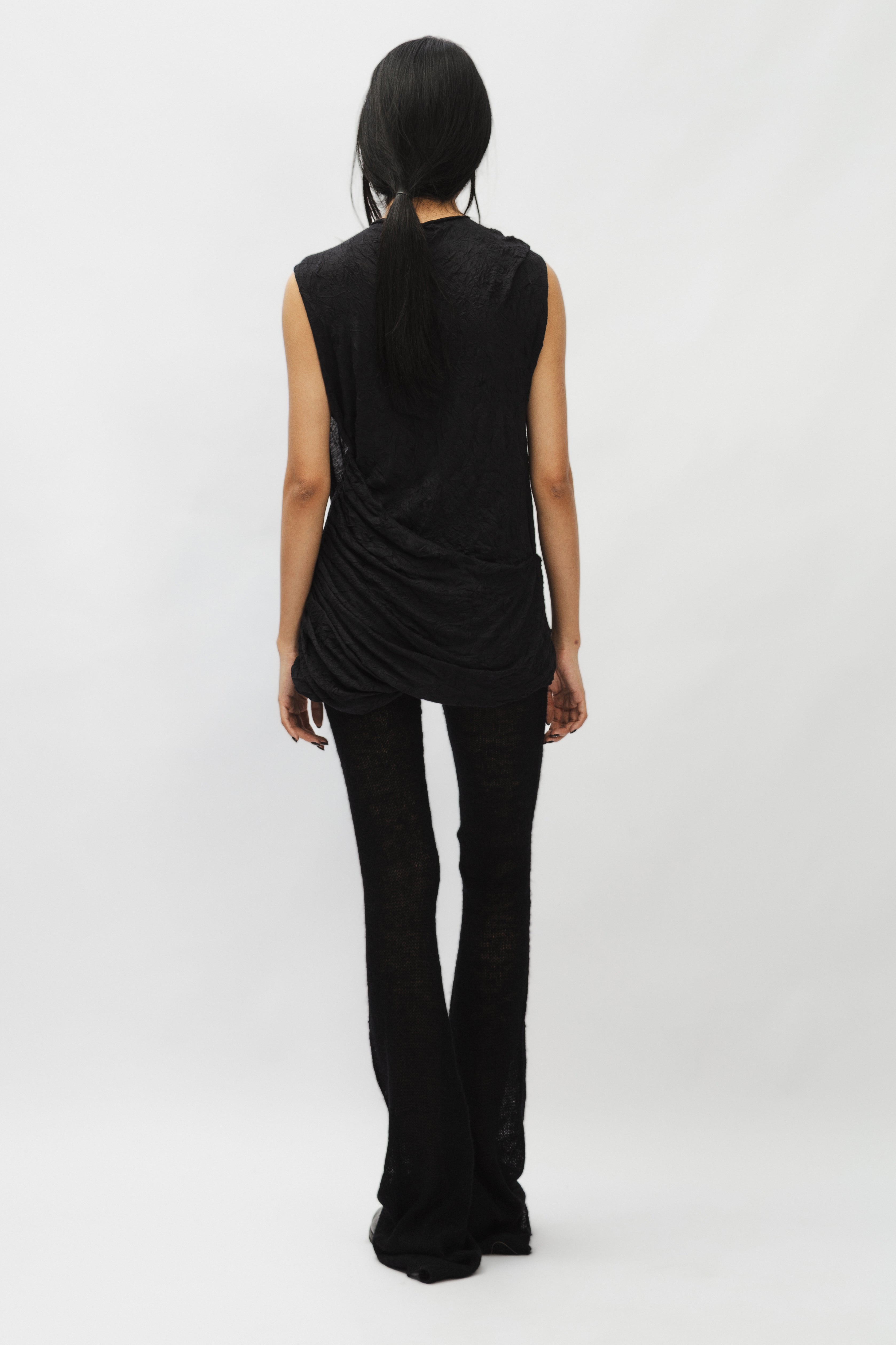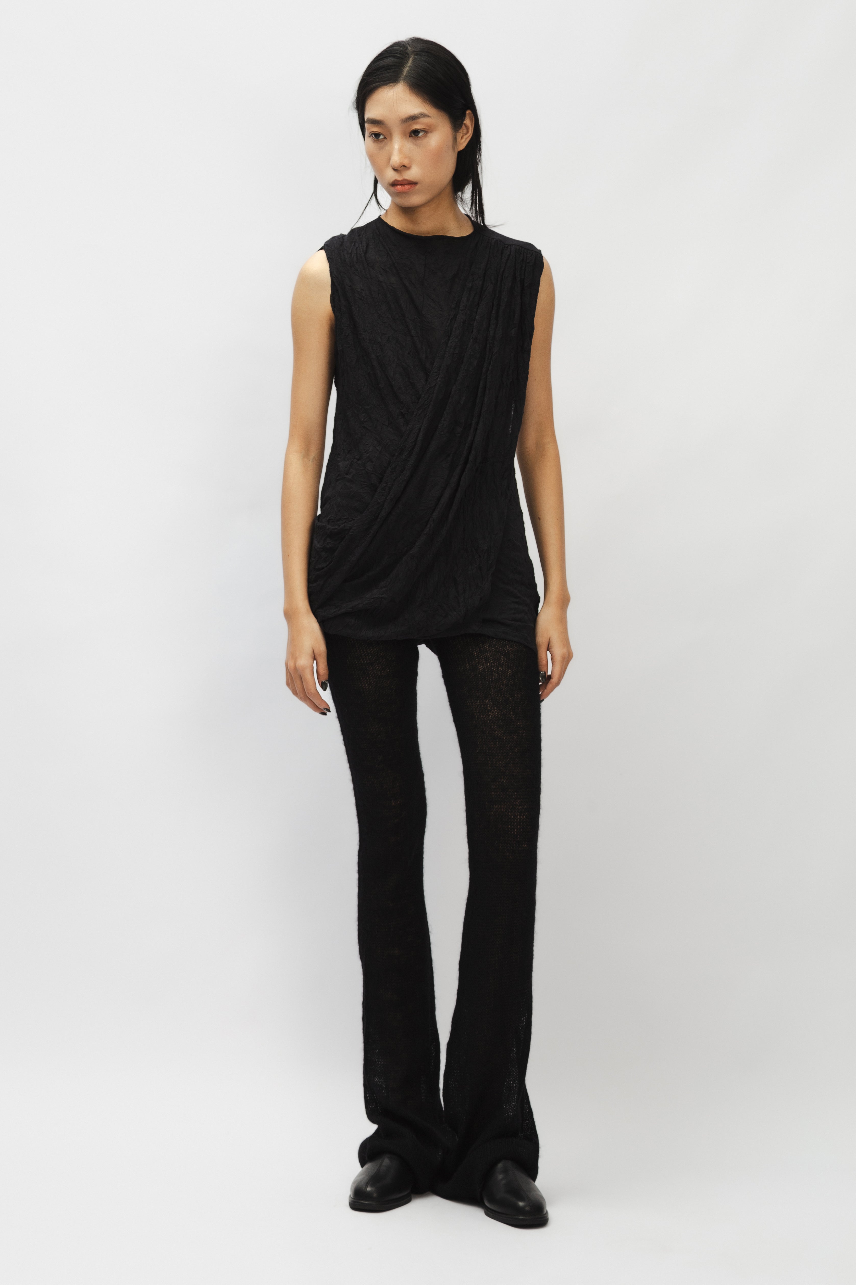 This top features an asymmetrical draped panel on the front, creating a distinctive silhouette. It is designed with a round neckline and a sleeveless cut. The garment appears to be made from a textured fabric, consistent with its 'wrinkle' designation.